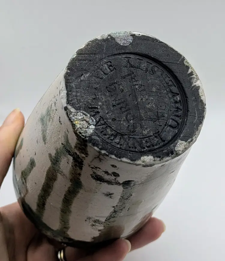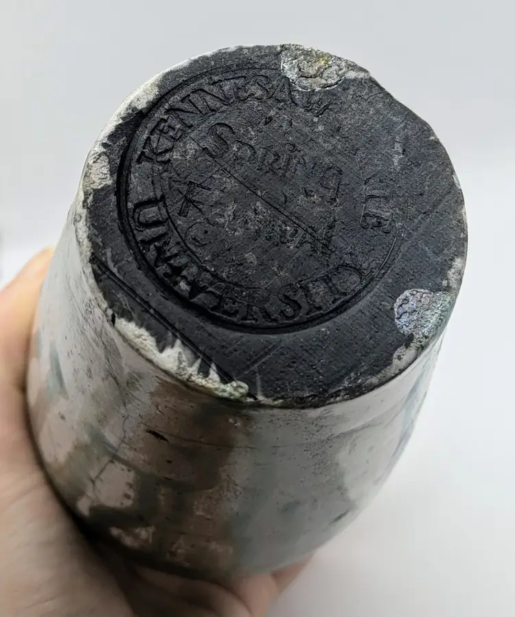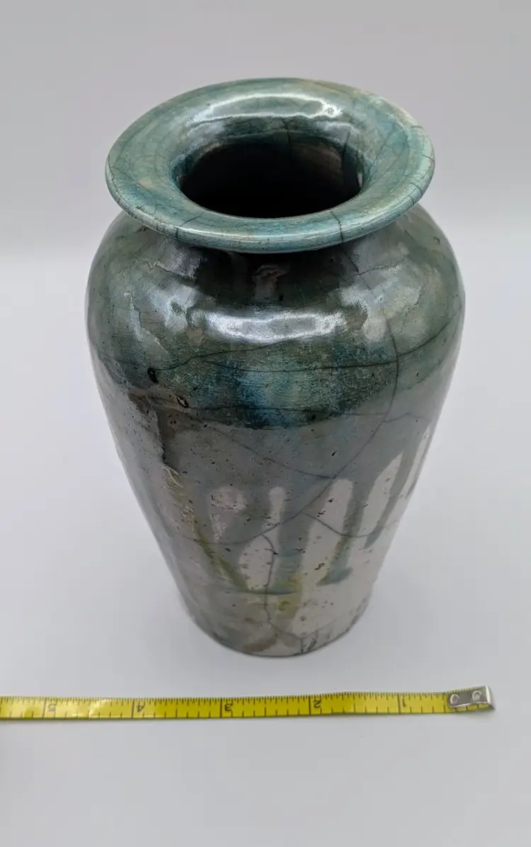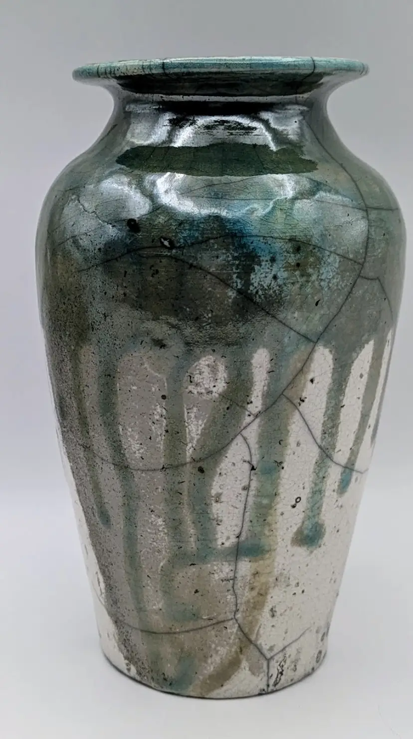 Beautiful raku pottery case with a blue and green drip glaze on a white base. I believe it is signed "Kennesaw ... University, Spring Festival." It is approximately 6 inches tall and 4 inches wide. EUC