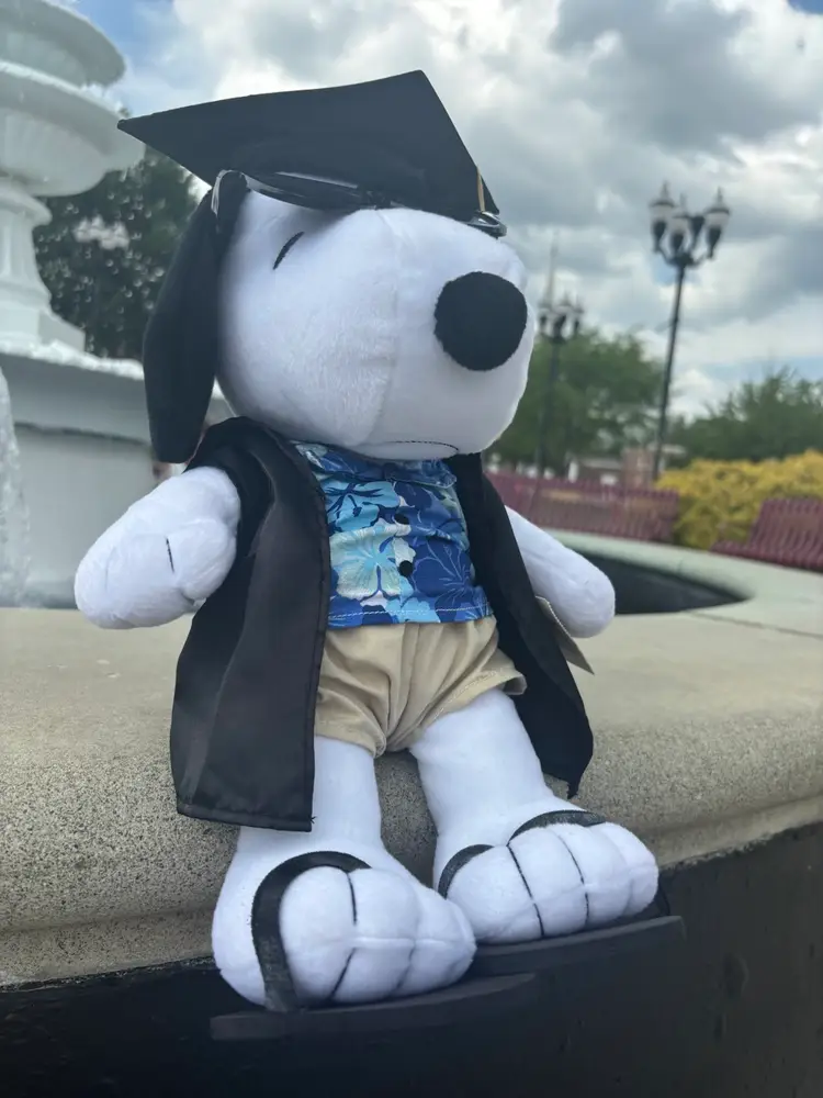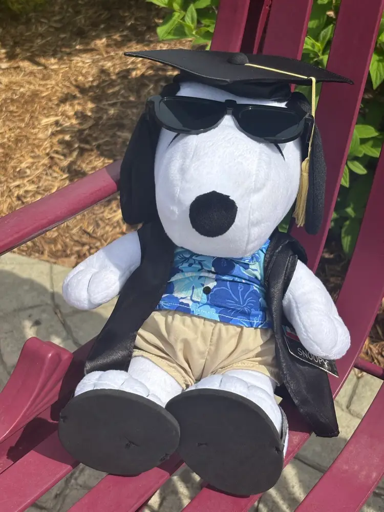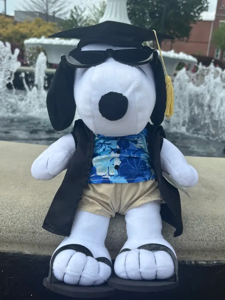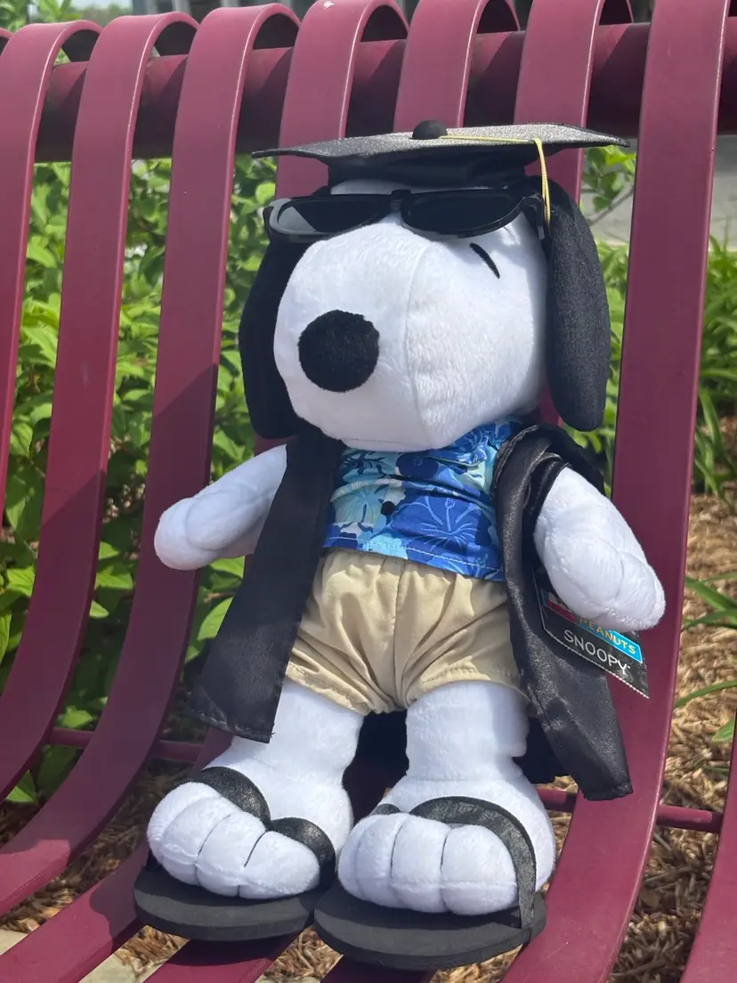 Remember when tropical shirts were all the rage? This larger Joe Cool plush is wearing a blue tropical shirt, khaki shorts, and sandals as well as graduation regalia—and he is totally pulling is off. Made by Hallmark. New with tags. Add him to your collection or gift him to the graduate in your life!