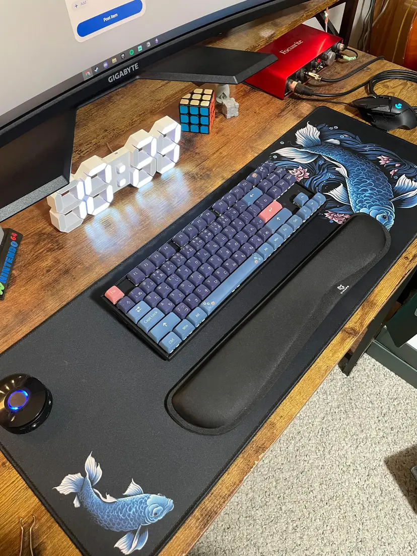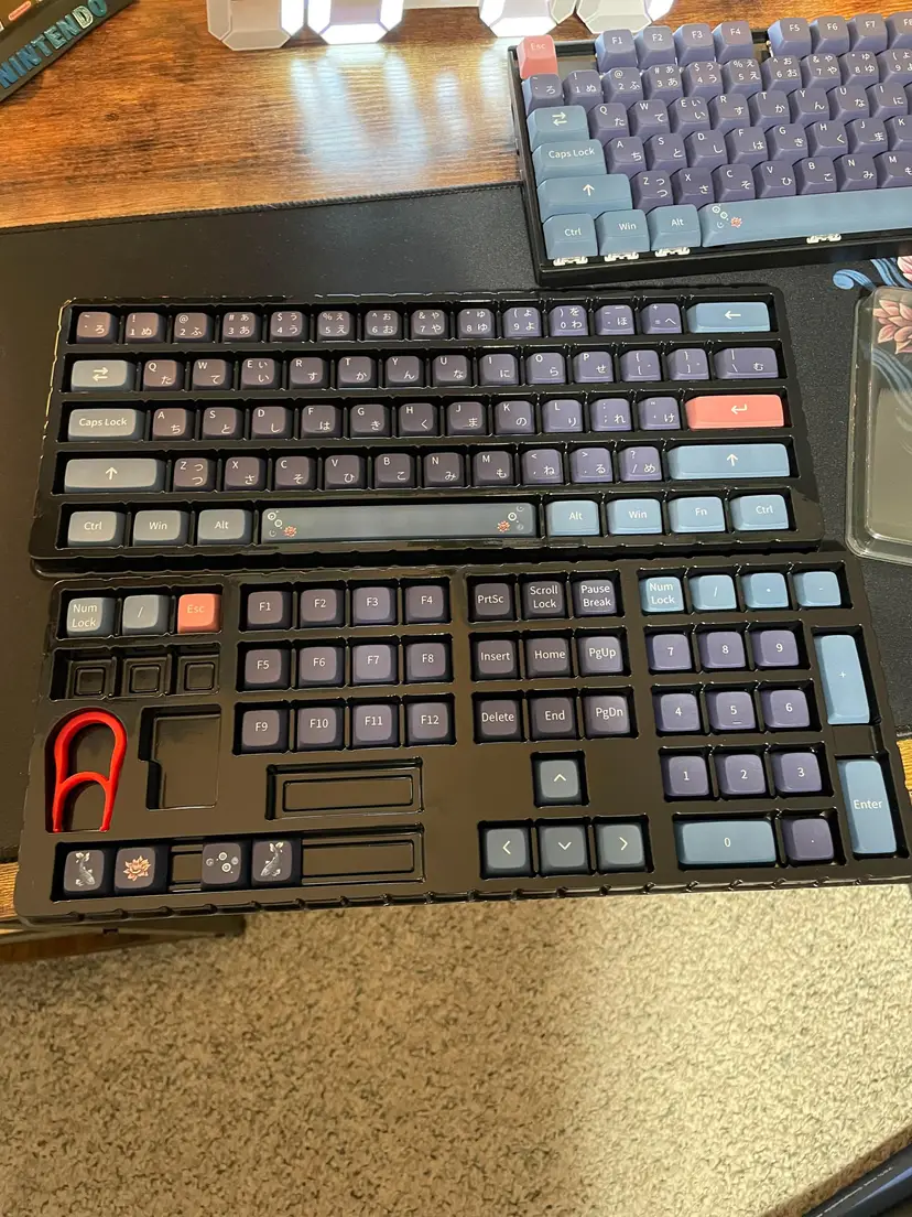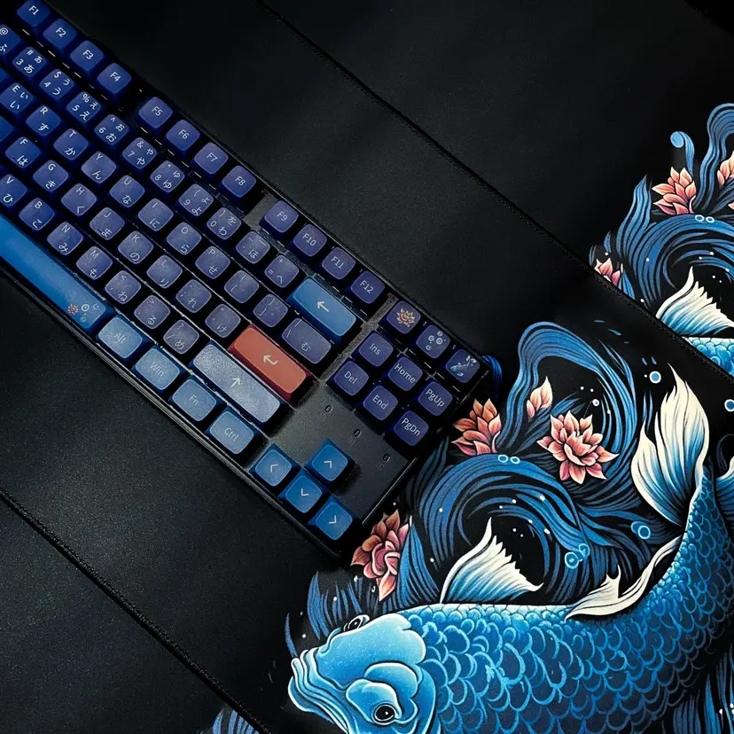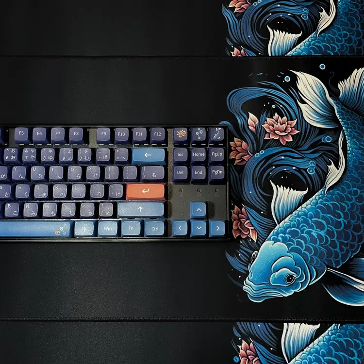 This 108-keycap set with matching desk mat includes a variety of Japanese characters, making it perfect for those who love Japanese culture or want to add a unique touch to their keyboard. The keycaps are made from high-quality PBT material and are dye-sublimated, ensuring long-lasting durability and a vibrant color scheme. The set also includes a desk mat, featuring a blue koi design, to complete your aesthetic ergonomic setup. The 80x30cm desk mat is made from durable rubber material and provides a smooth surface for your keyboard and mouse. The keyboard in the pictures is only for demo, it is not included. 108 Dye-Subbed PBT Keycaps XDA Profile: Japanese Characters Blue Koi Design Large Desk Mat (80x30cm/31x11.8in)