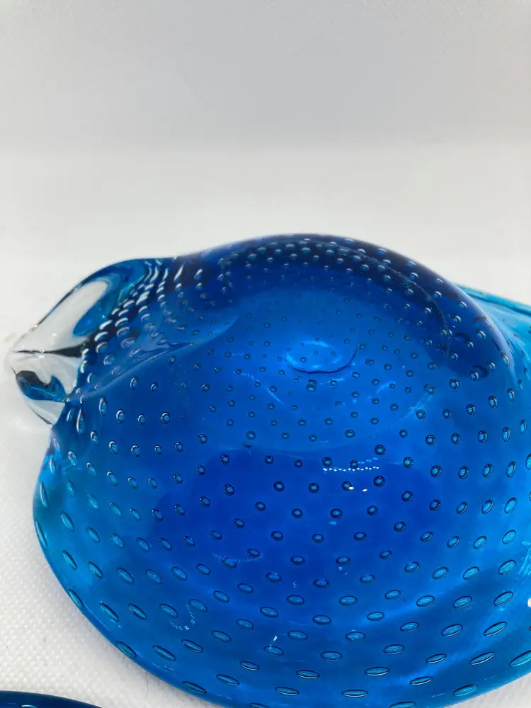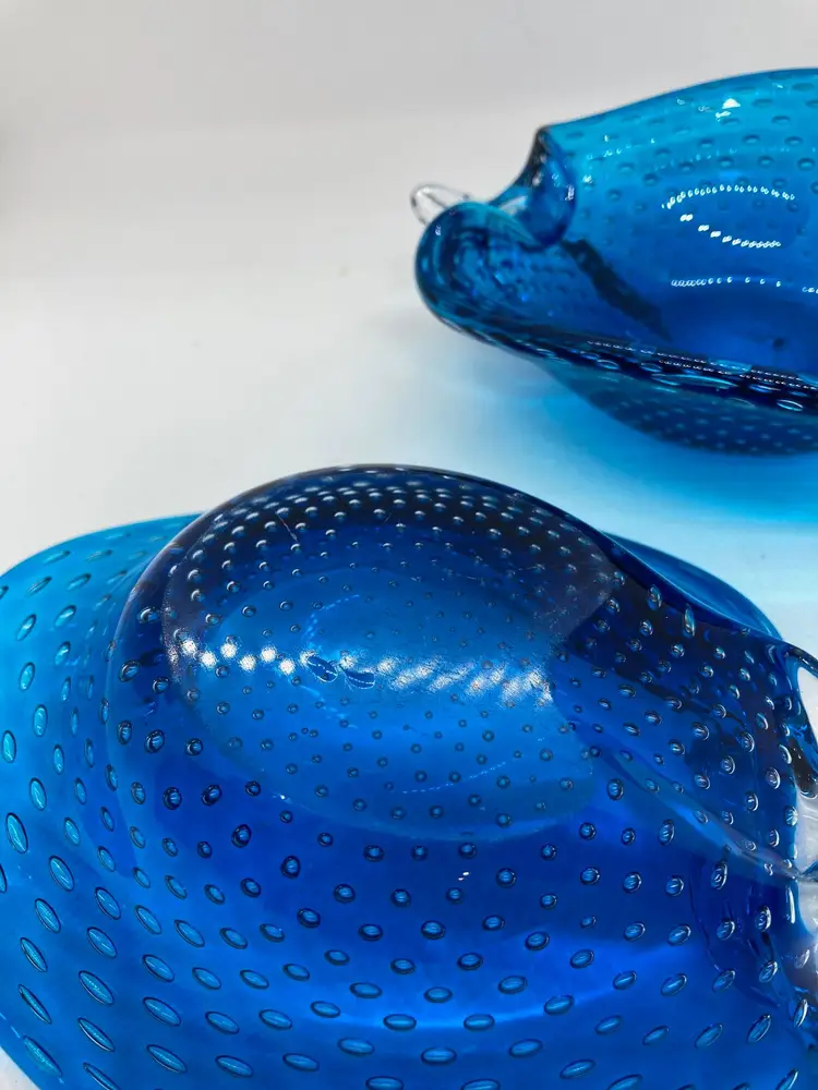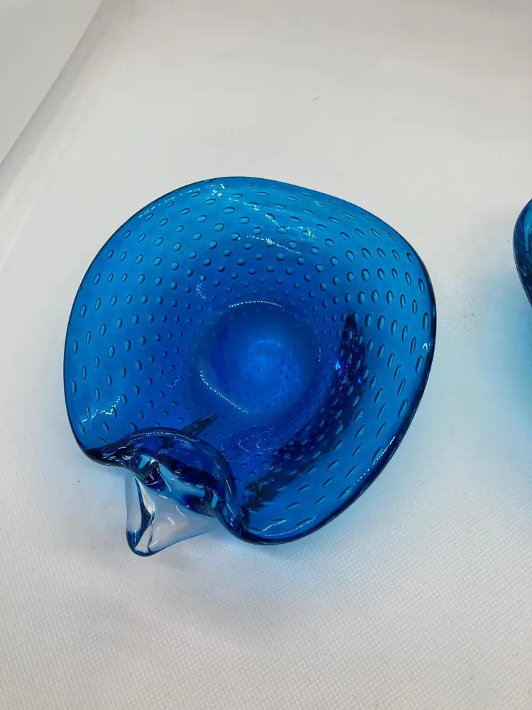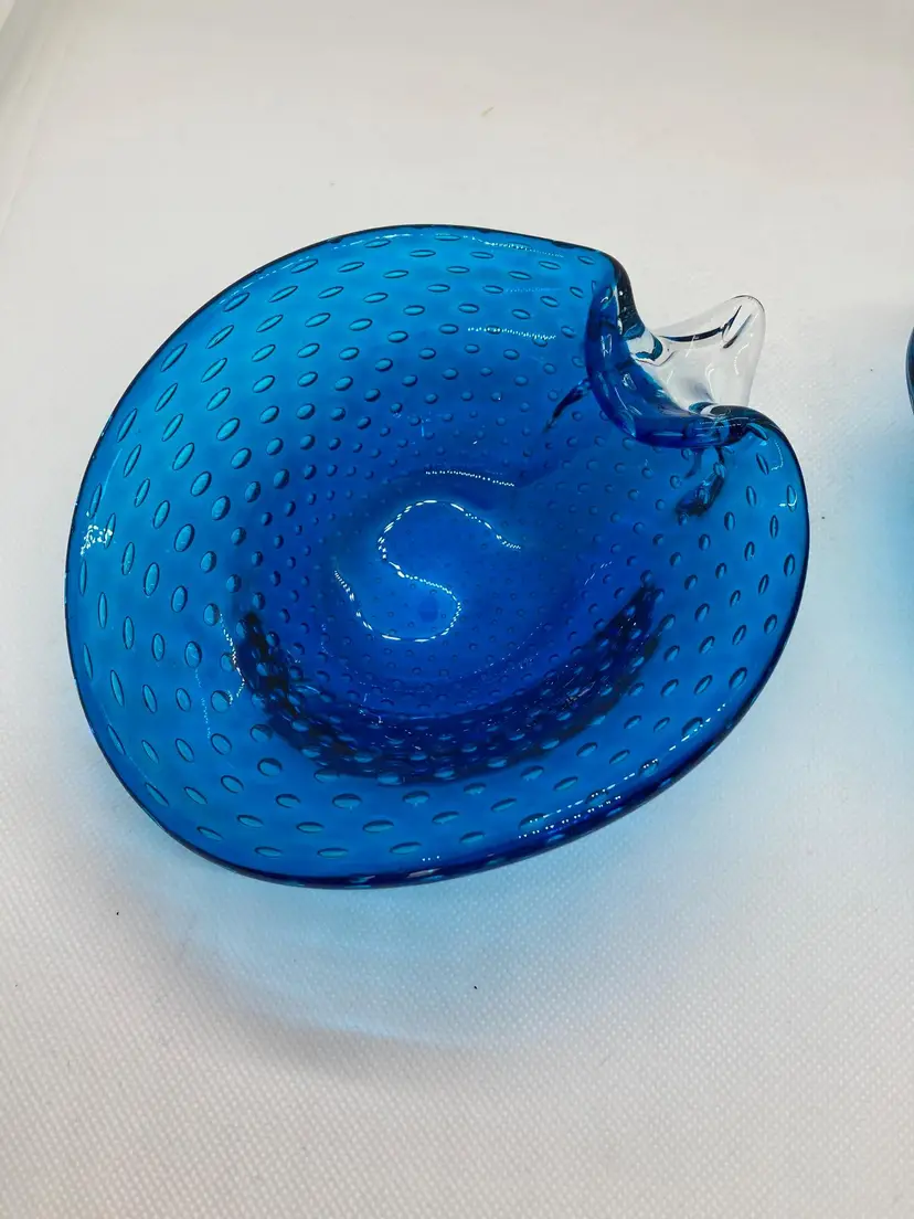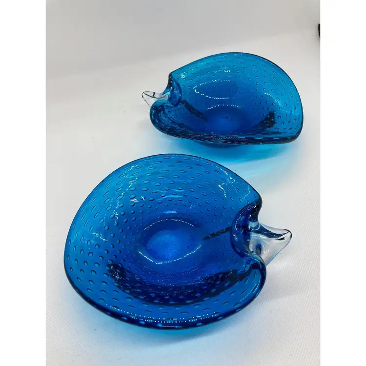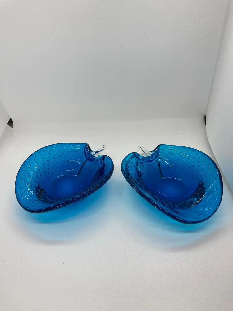 This hard to find pair of ashtray/dishes is in great pre-owned condition. Smooth bottom with pontil marks evident. 2" tall, 6 1/2" long and 5" wide