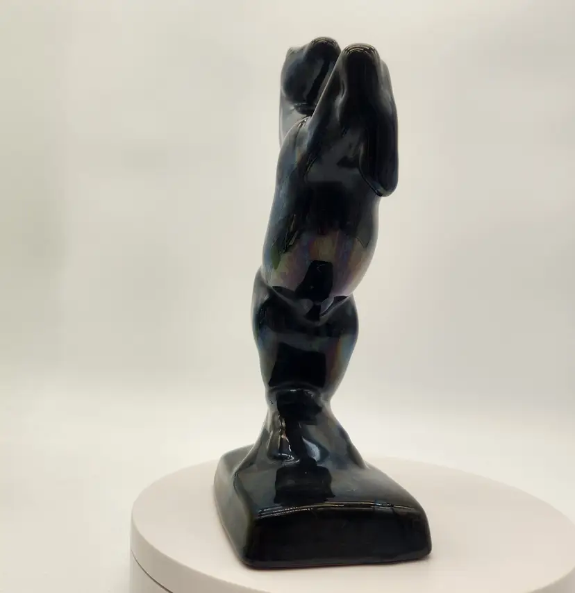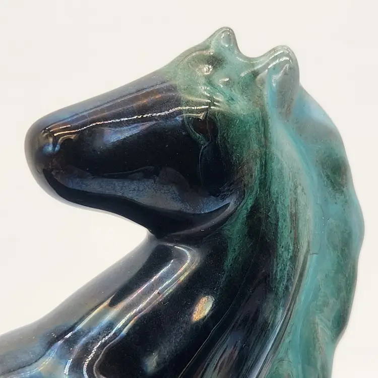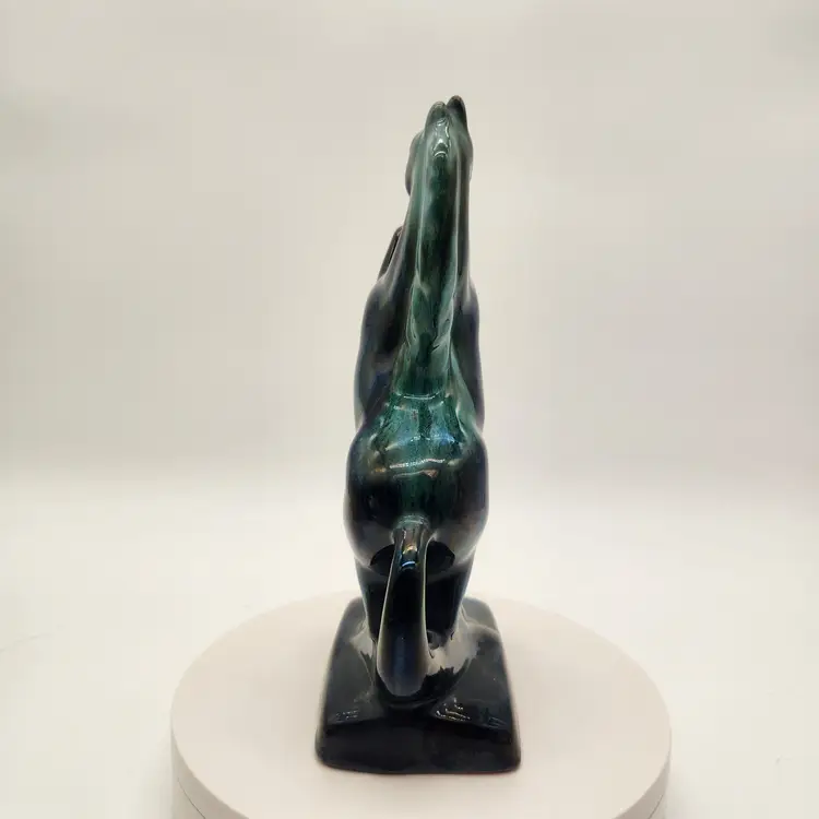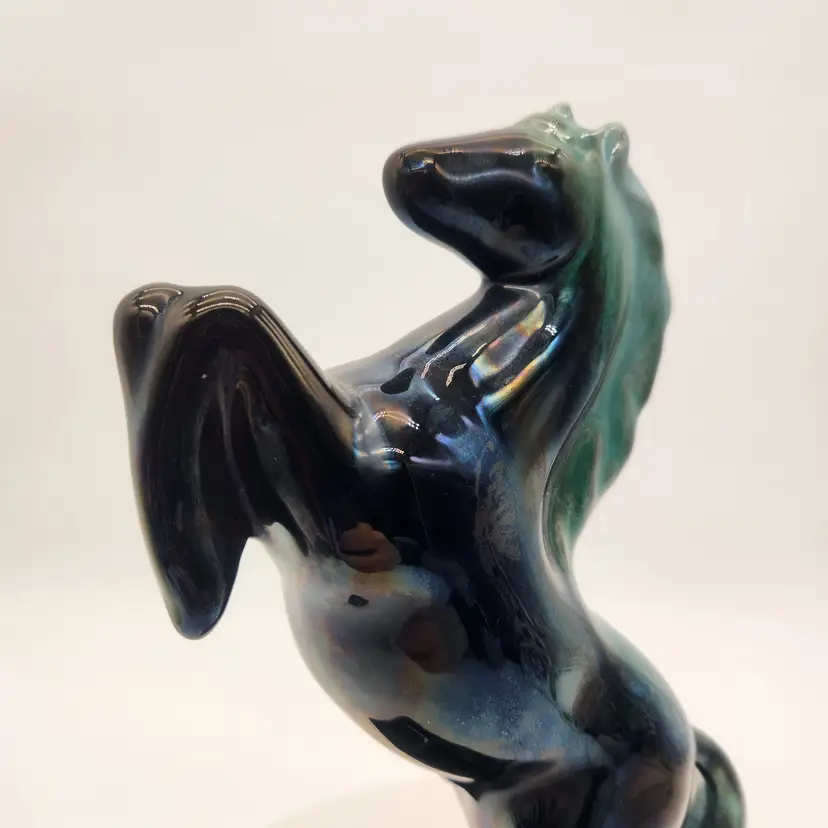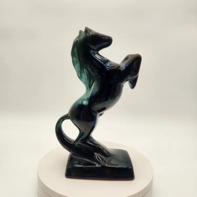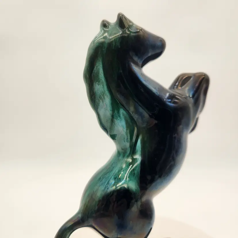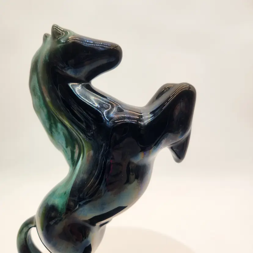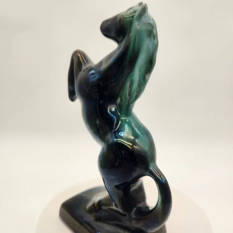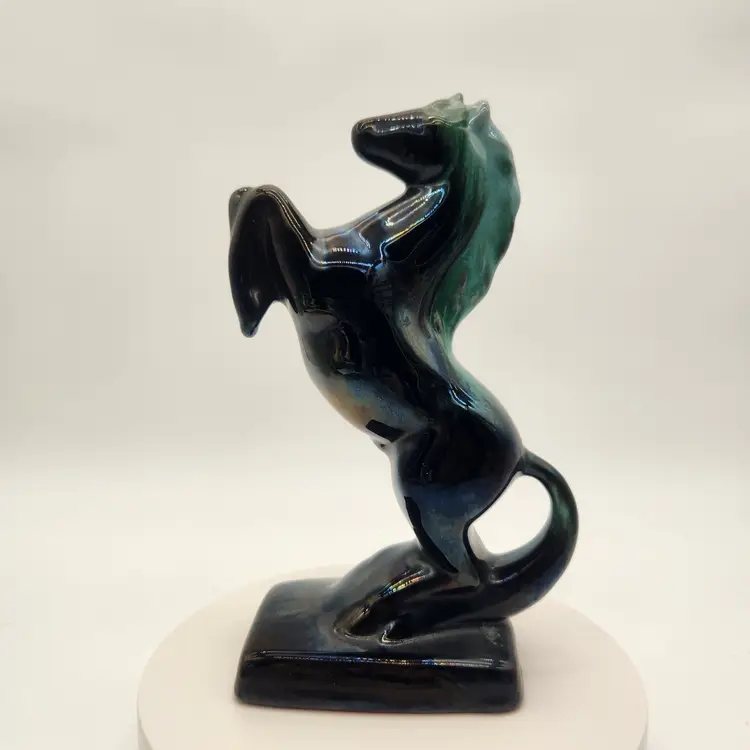 This majestic handcrafted Equestrian Art figurine of a rearing stallion glossy black with a striking blue-green mane. The mane was with a flowing drip glaze called "Reactive Glaze, that is a hallmark of Blue Mountain Pottery (BMP) and involves using "reflowing" or dripping glazes, usually in teal-green or black, on red clay. The renowned pottery was founded in Collingwood, Ontario, Canada in 1953 and sadly closed its doors in 2004. Measurements: 9" tall, 5 1/4" wide from base edge to back edge of tail; 2 7/8" wide Like New Condition: no signs of wear Keywords: MCM, Canadian, Retro, Stallion, Pony, Statuette, Collectible, Dark Teal, Emerald, Vintage Decor, Animalier, Shelf Styling, Office Decor, Gift for Horse Lover