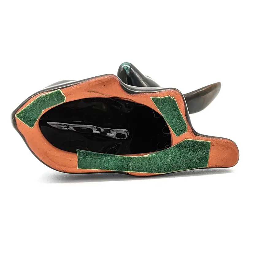Blue Mountain Pottery items feature a unique, trademarked glazing process known as "re-flowing decorating." Two different liquid glazes, one light and one dark in color, were applied. During the firing process the glazes would run, creating streaking patterns unique to each piece.