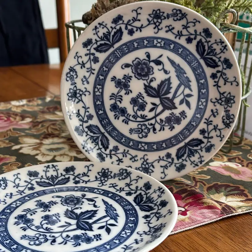 Blue Onion set of 2 Blue & White 6” desert plates. Made in Japan marked Blue Onion. No chips or cracks.