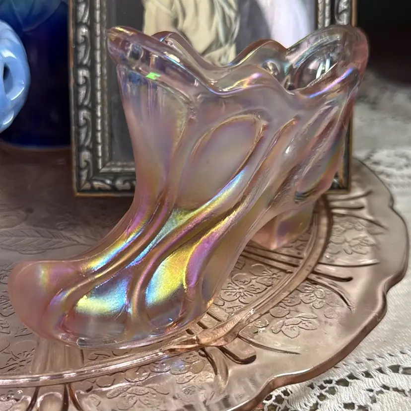 Fenton iridescent elf style shoe Fenton stamp Fenton open lattice weave bowl- there is a small chip and crack. See pic Pink depression glass trivet dogwood pattern Antique picture frame with little girl with blue