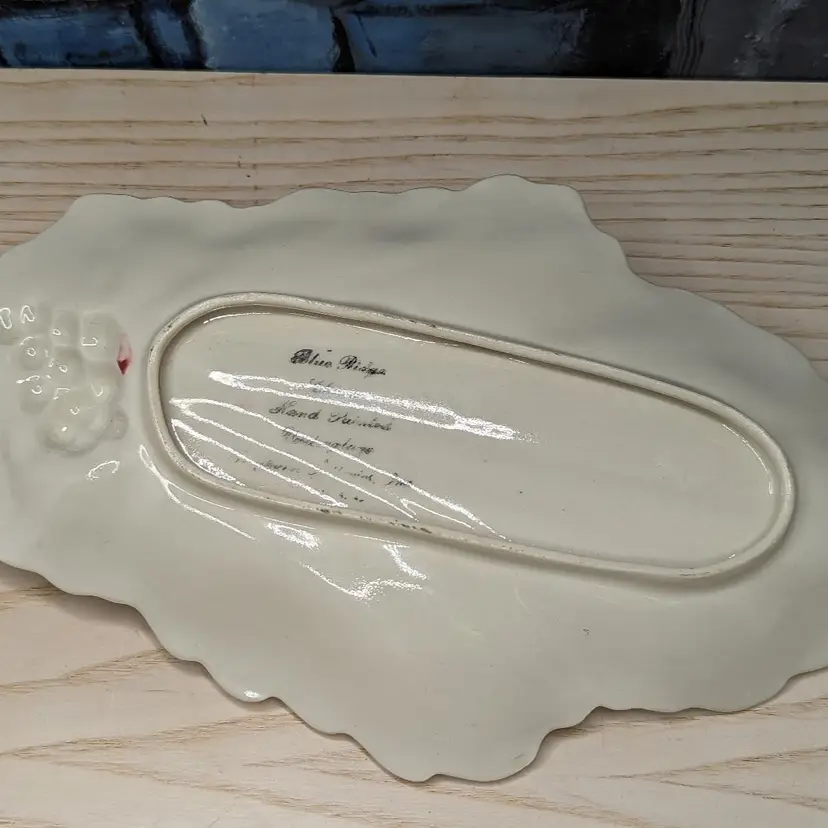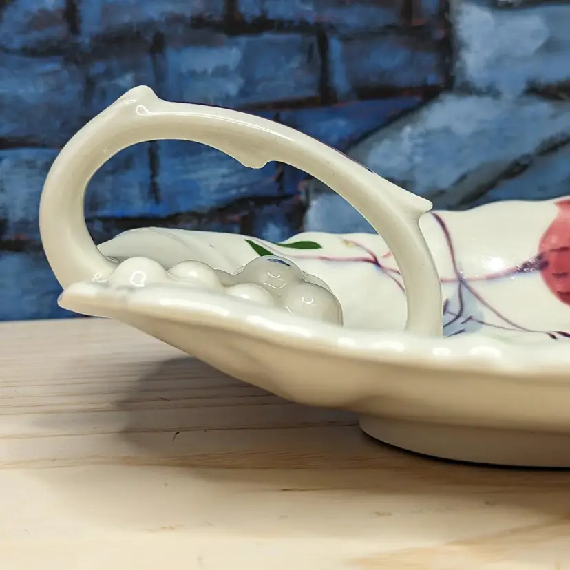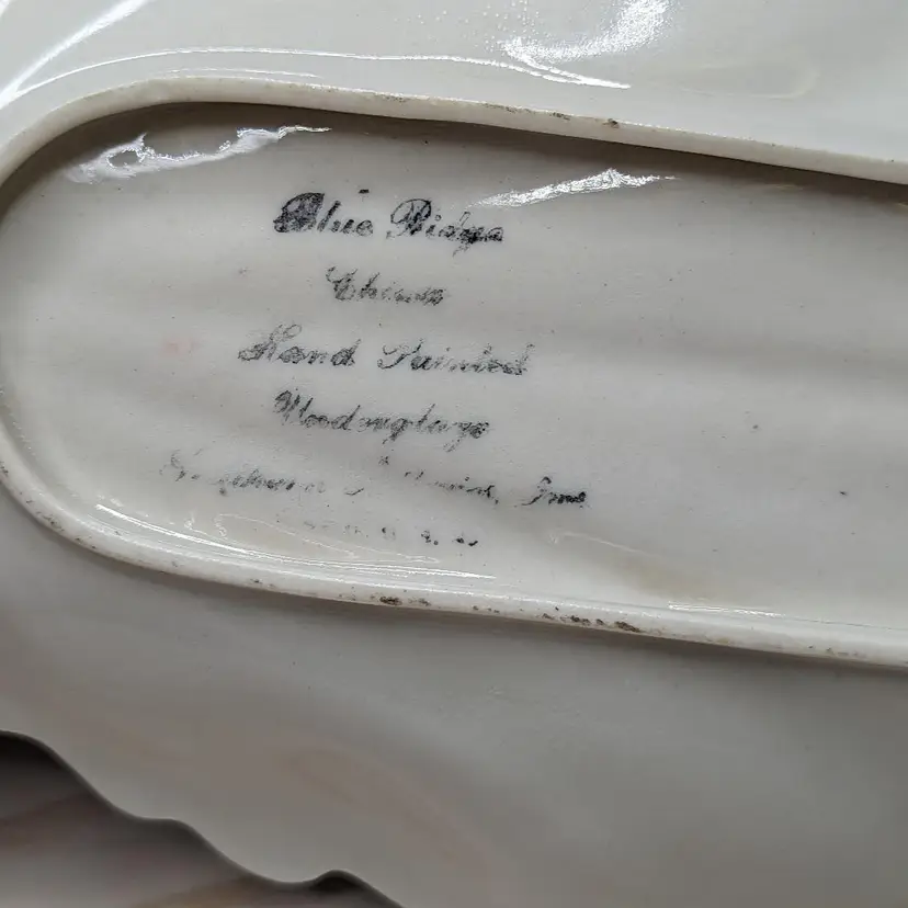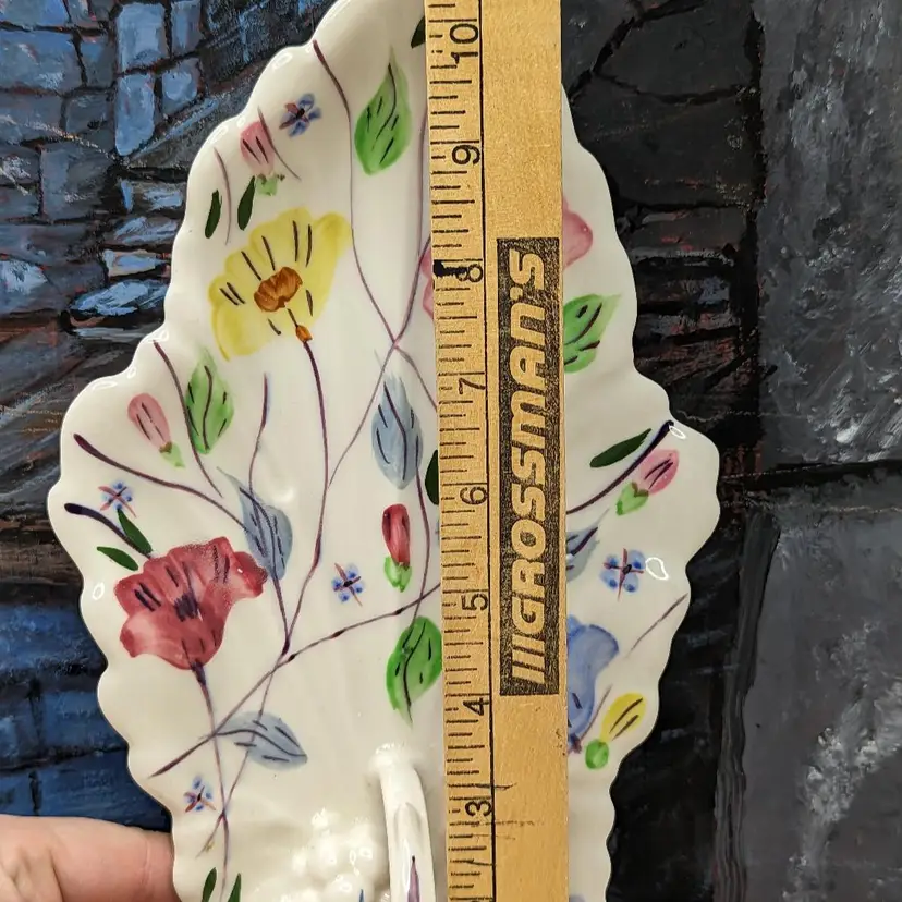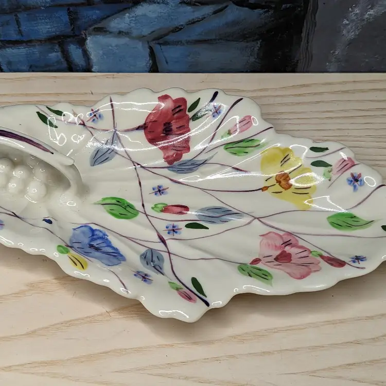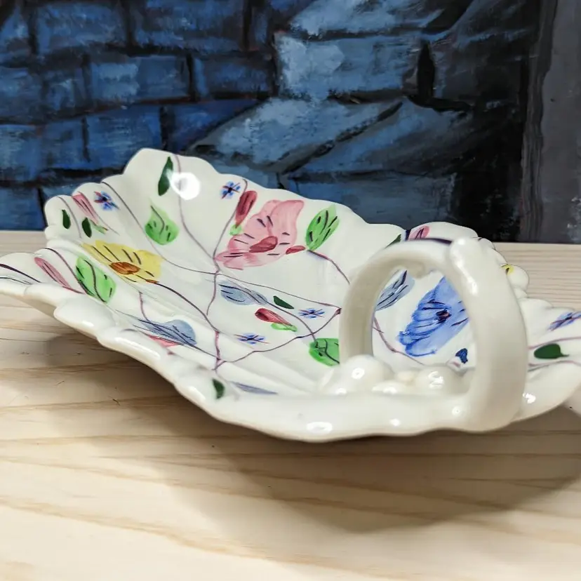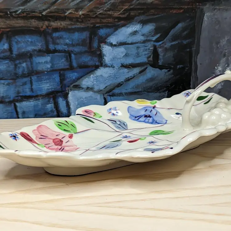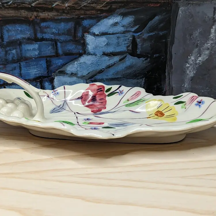 Vintage Blue Ridge China Pottery Chintz Leaf Handled Relish Dish Celery Nappy Spring Flowers. Hand Painted nice for the Easter Table.The dish is 10 1/5in long and 6 1/2in wide. Very good condition there is a chip on the under side of a leaf on the back. no cracks or stains.Please check the photos for details. Comes from a smoke free home.
