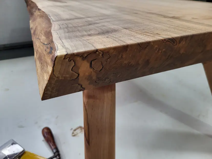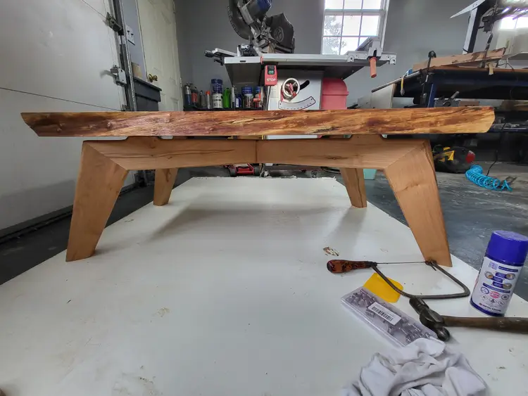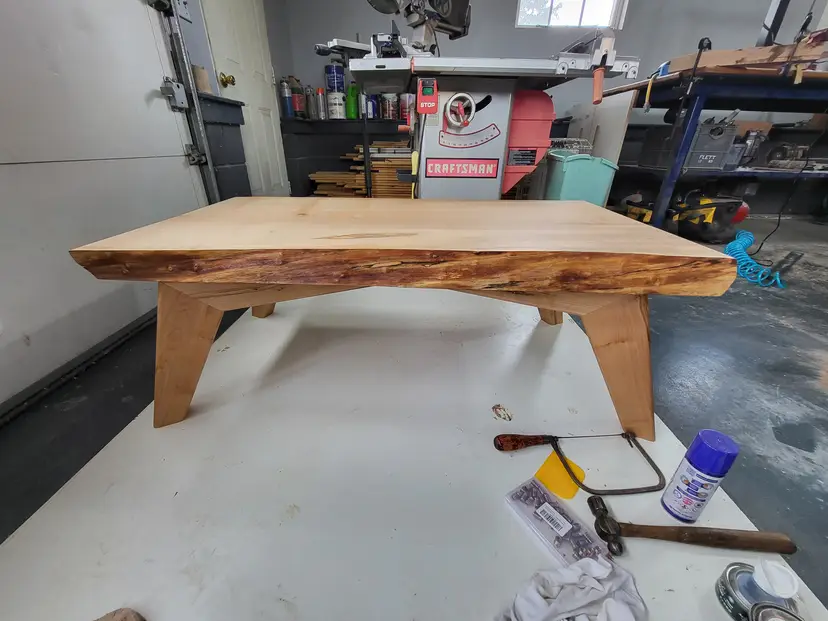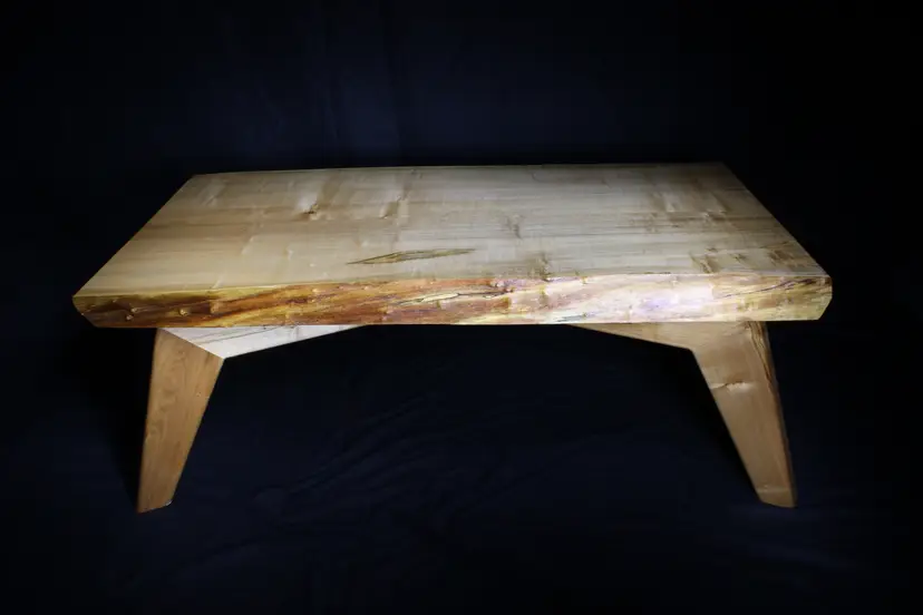 This coffee table has a MCM style base and a live edge top. The entire table is made from super chunky spalted maple. L-44in W-22in H-16.5in