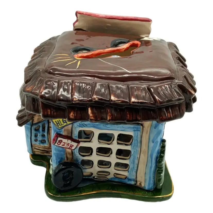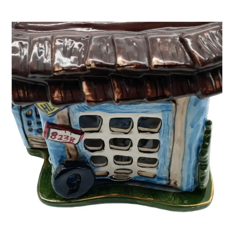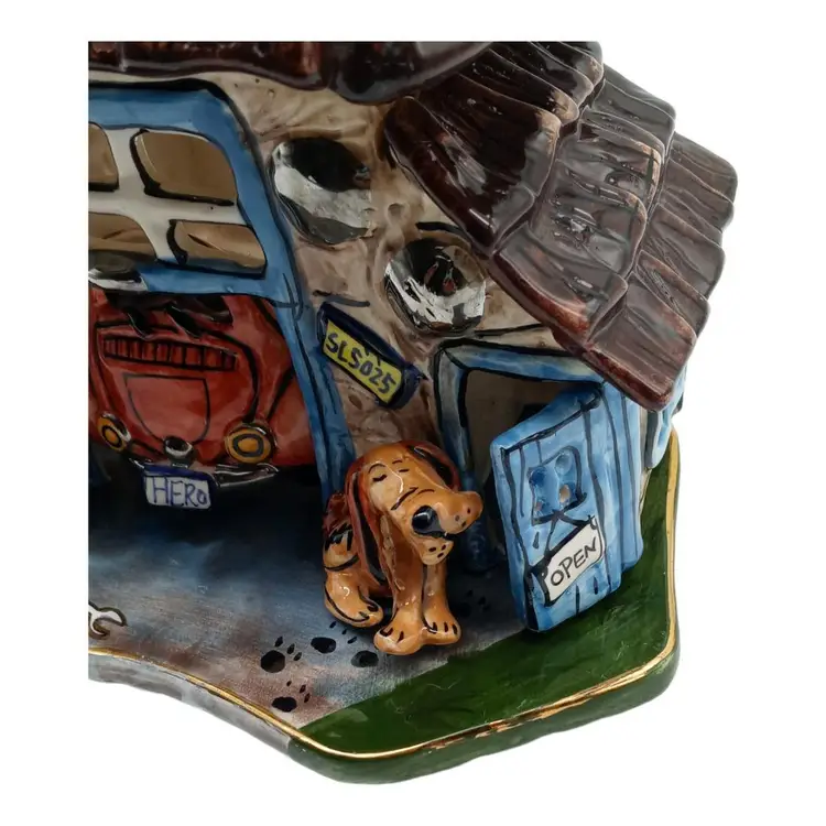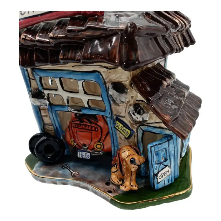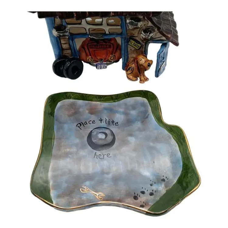 This ceramic tealight holder is free from chips, cracks, or damage. The accompanying pictures provide a comprehensive view of its condition. While the majority of this piece is pristine, it's important to note that the base of the garage, including the bottom of the car and base plate, displays signs of wear, as shown in detailed pictures #7, #8, and #10.