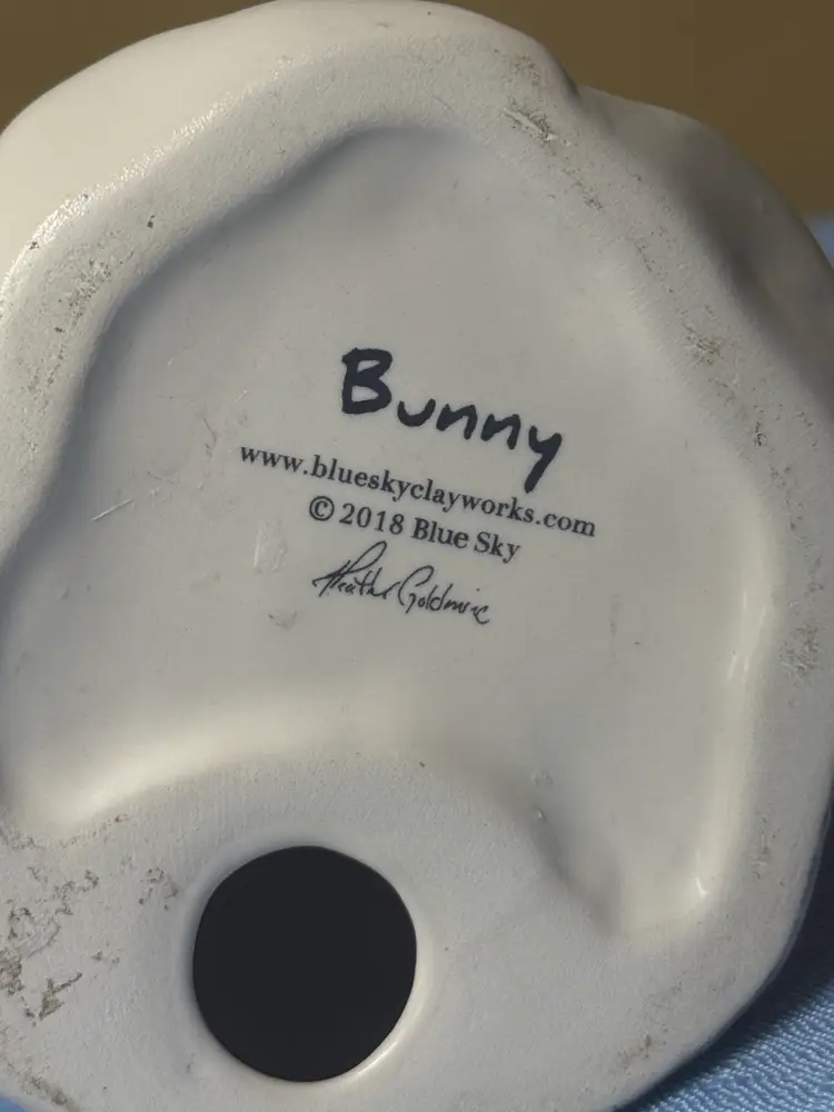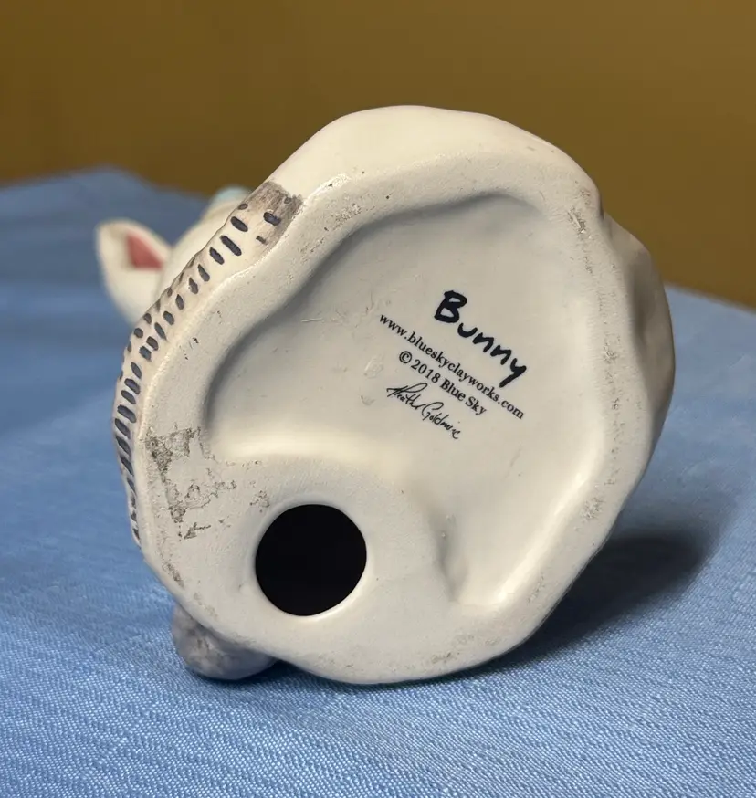 Adorable ceramic bunny with pink ears and blue eyes. Adds charm to any space. This ceramic figurine is the "Buzz Bunny" Easter rabbit from Blue Sky Clayworks, designed by artist Heather Goldminc. Product Details Brand: Blue Sky Clayworks. Artist: Heather Goldminc. Collection: Part of the "Buzz Bunny" spring/Easter collection, which first appeared around 2018. Material: Glazed ceramic. Dimensions: Approximately 8 inches in height. Design Features: Distinctive large blue eyes, a pink nose and inner ears, and stylized gray-blue hatched markings across its body. Excellent like new condition with no breaks or chips (198223264)