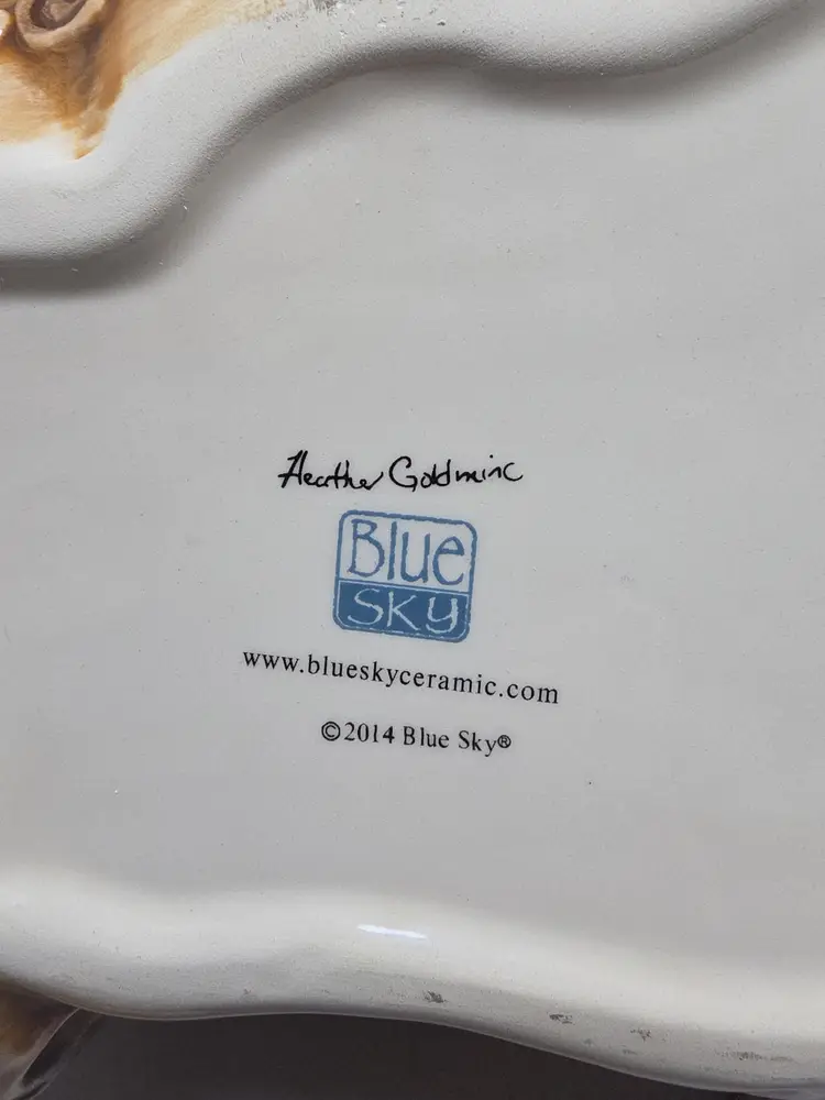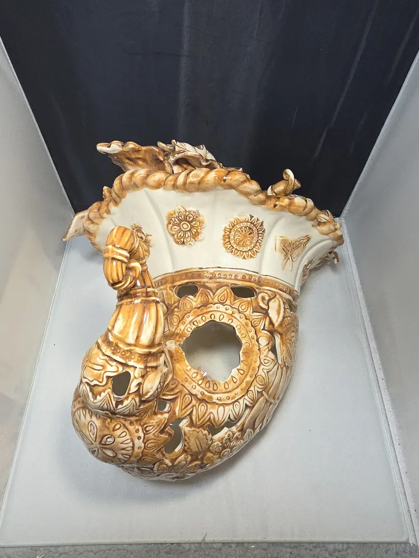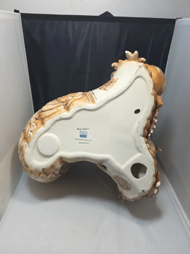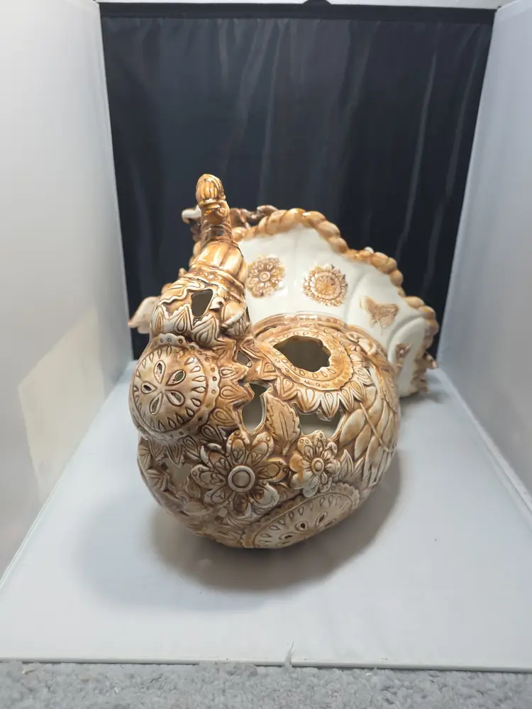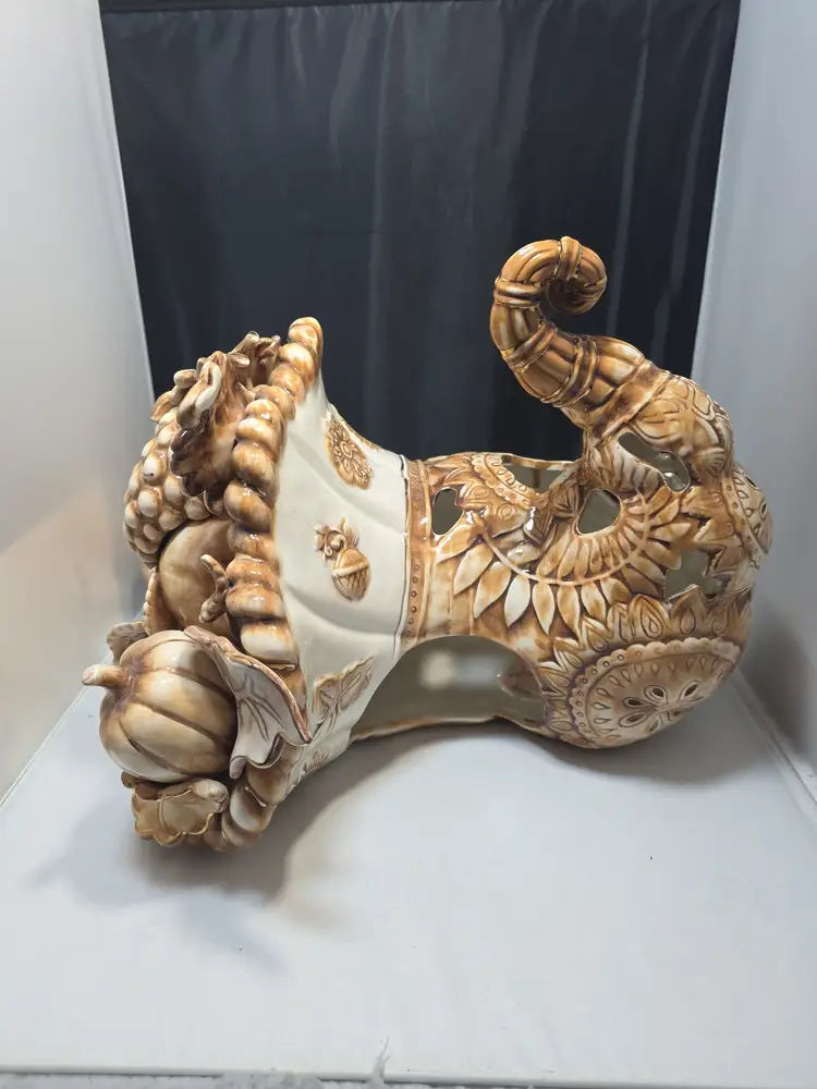 Large decorative ceramic cornucopia candle holder by Blue Sky Ceramic, featuring an ornate harvest design with pumpkins, gourds, grapes, and leaf detailing. Finished in warm autumn tones with pierced cutouts that allow light to shine through when used with a pillar candle or LED light (not included). This is a substantial statement piece, ideal for fall, Thanksgiving, or seasonal home décor. The pierced ceramic body creates a lantern-style glow, making it suitable for a tabletop, mantel, or centerpiece display. Marked on the base by Blue Sky Ceramic with ©2014 copyright. Heavy, well-made ceramic with strong visual presence. Condition is very good with no cracks or repairs. Light surface wear consistent with normal display. Stored in a smoke and pet free home.