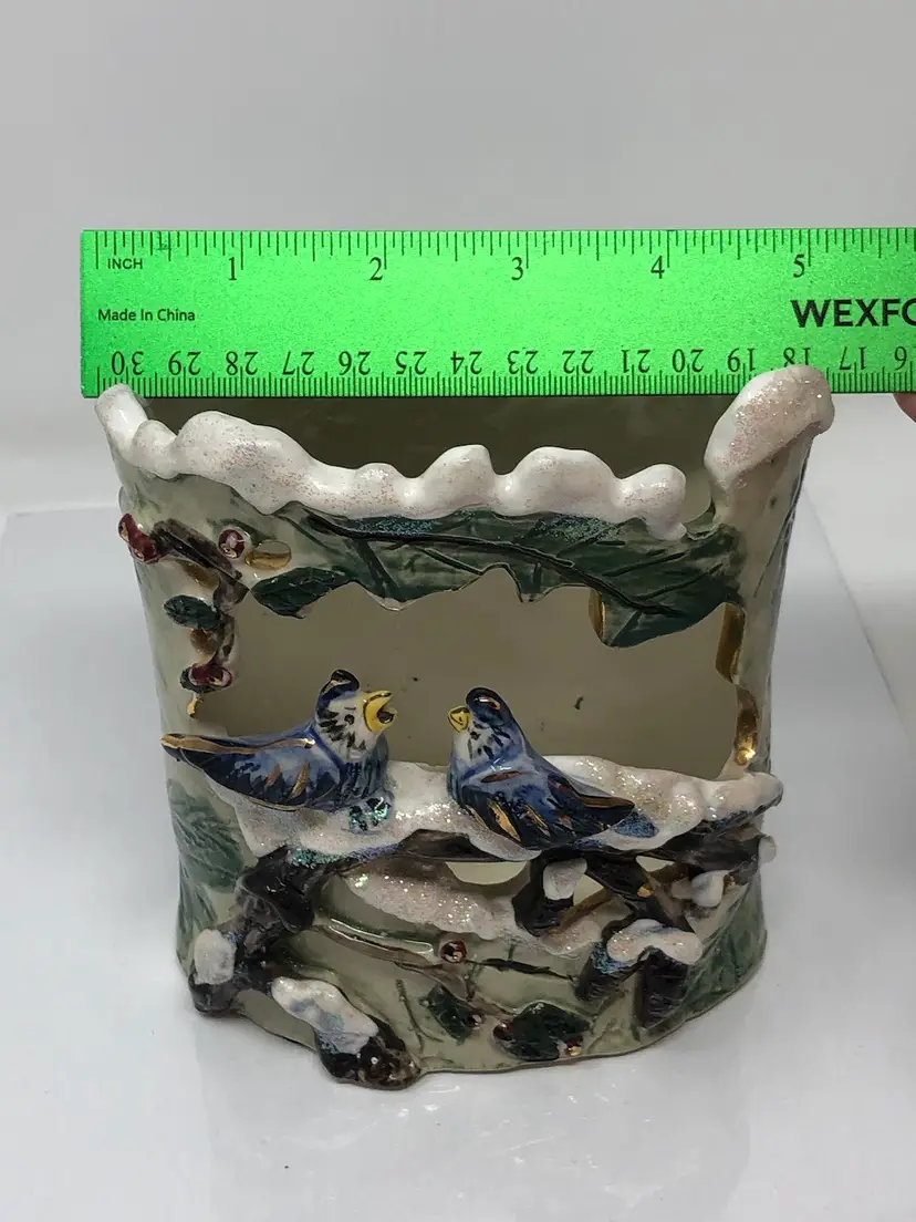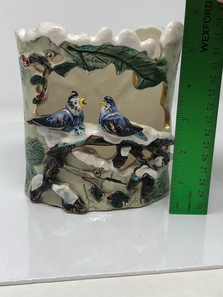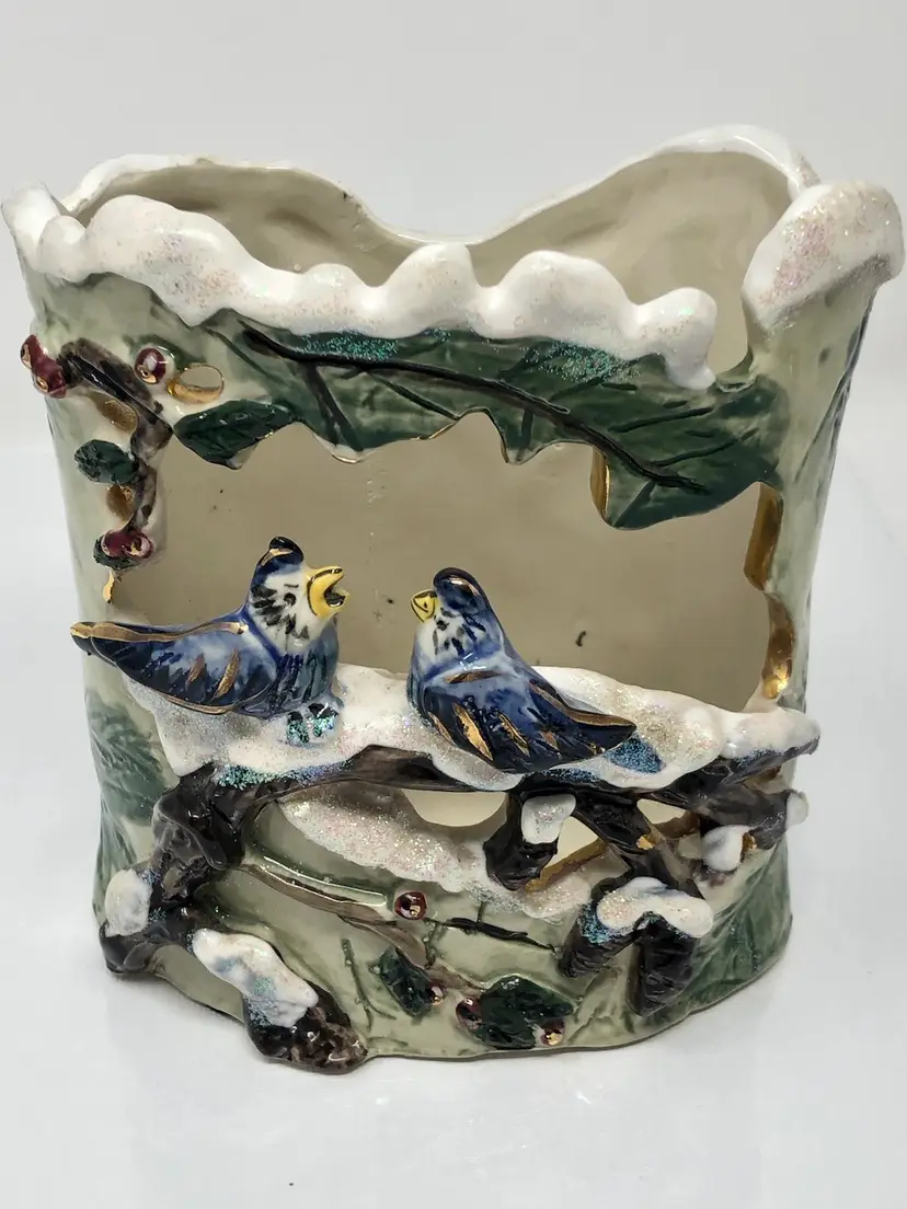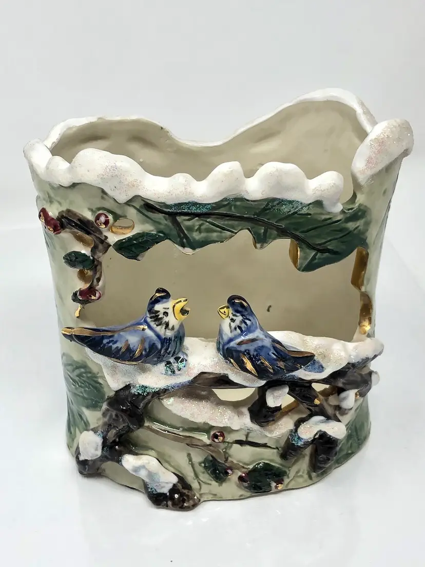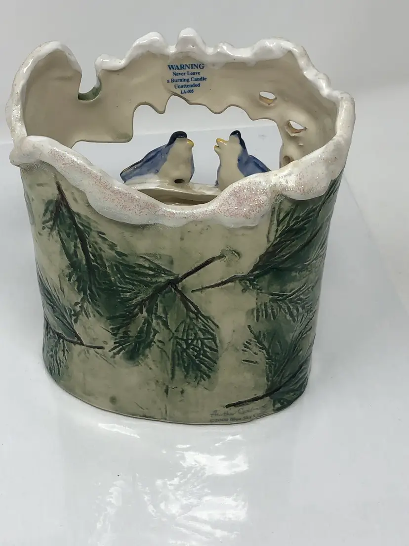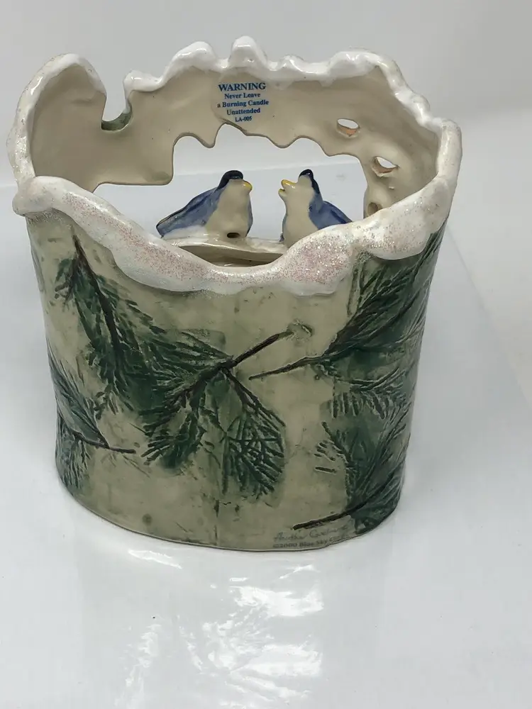 6" tall ceramic luminary with glittery frosty blue jays by Blue Sky Clay Works. No chips or cracks, original label on the bottom