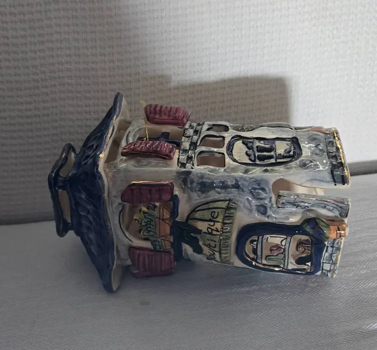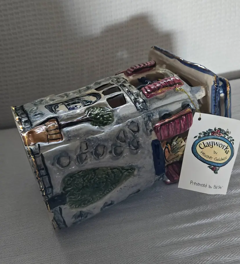 Hand painted and made from ceramic. Cute little shoe boutique from Blue Sky Clayworks and designed by artist Heather Goldminc. It has its original tag and is signed and dated 2000. Part of the highly detailed "show houses and buildings". Stands 8 1/2" tall and 5" wide. In excellent condition. No chips, cracks, or repairs