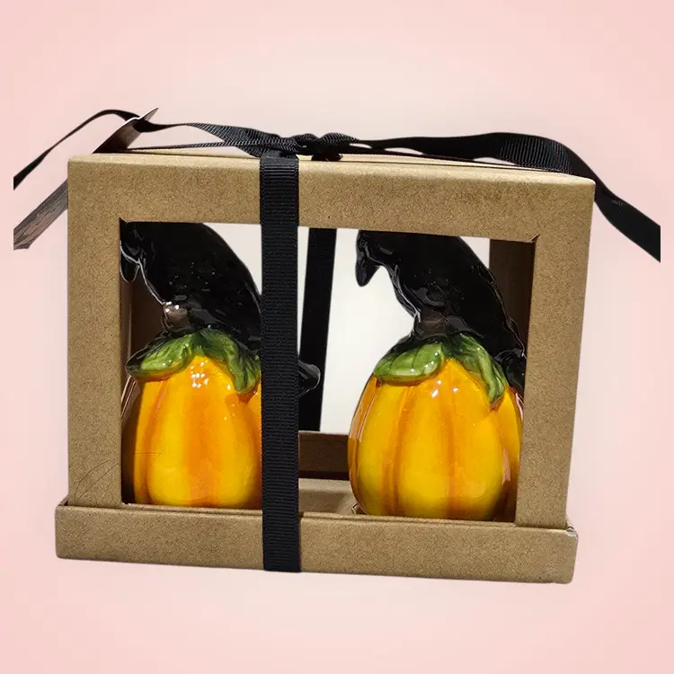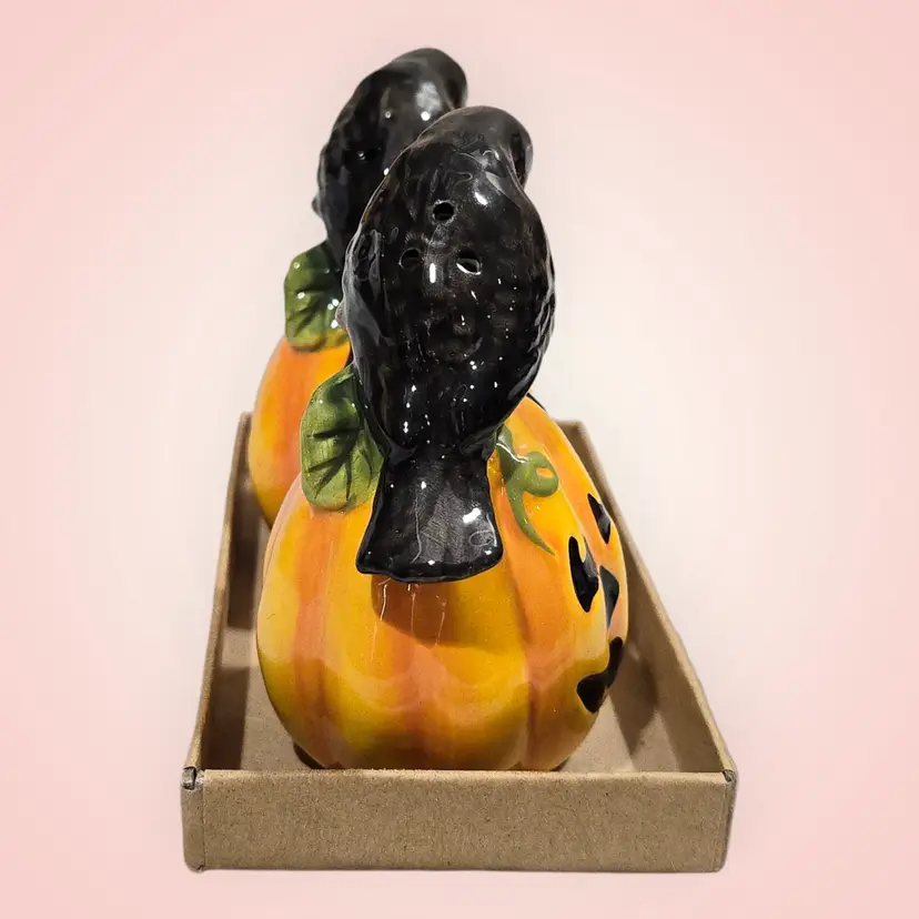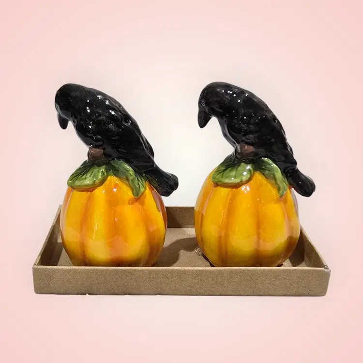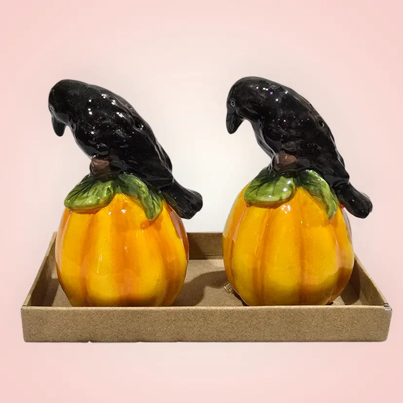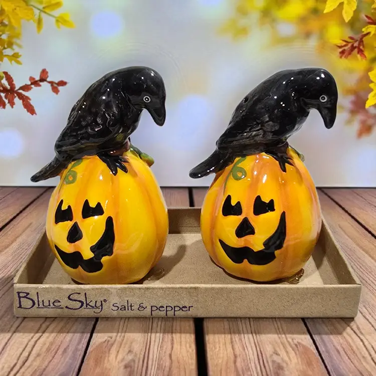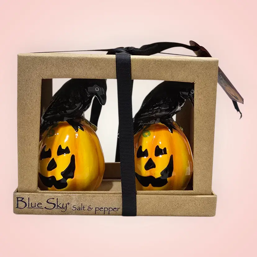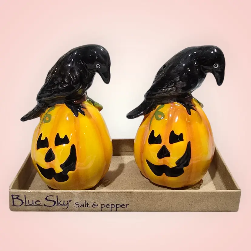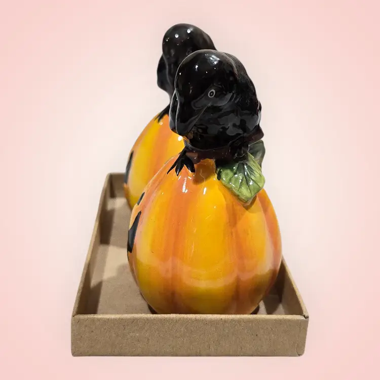 Blue Sky Clayworks Pumpkin Black Crow Salt & Pepper Shakers Boxed