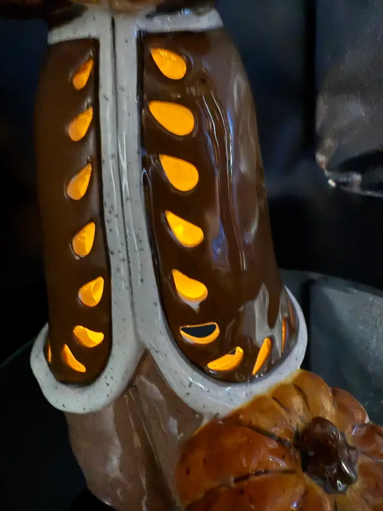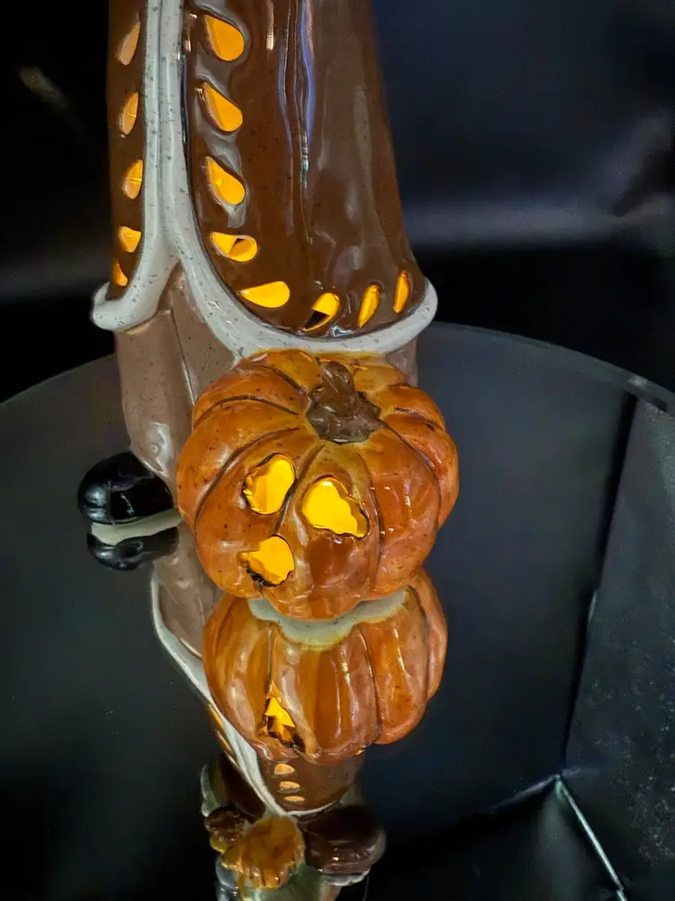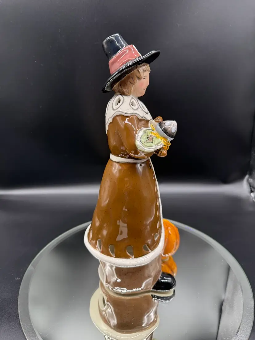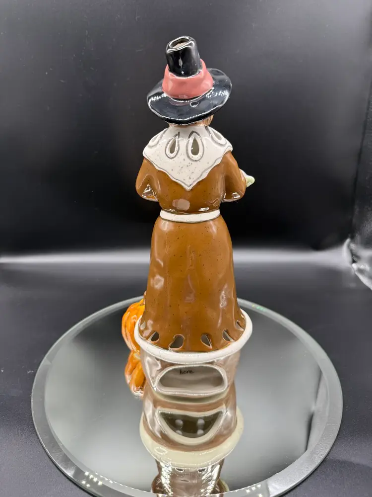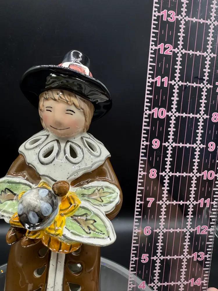 12" Pilgrim with Offerings and Pumpkin at his feet by Heather Goldminc, Blue Sky Pottery Tea Light Holder, No Chips No Cracks