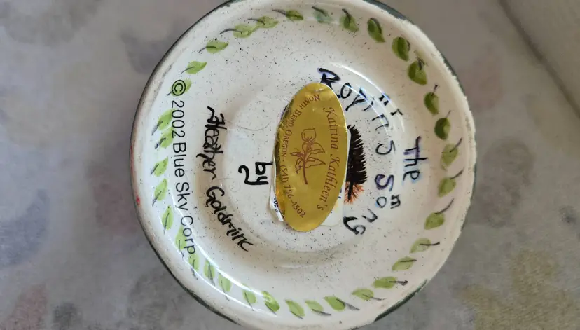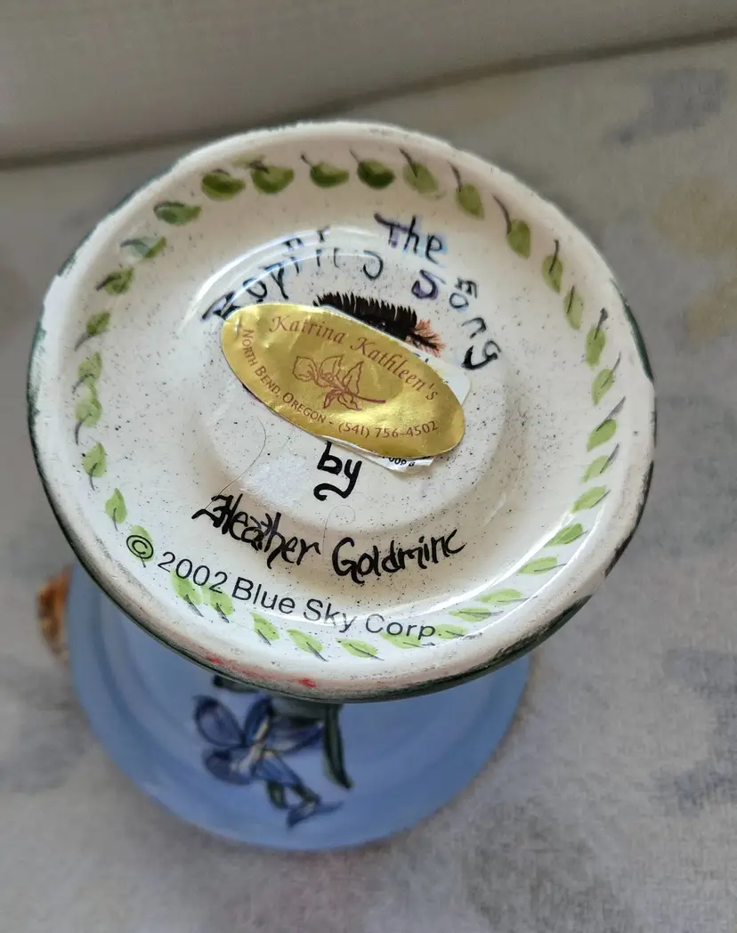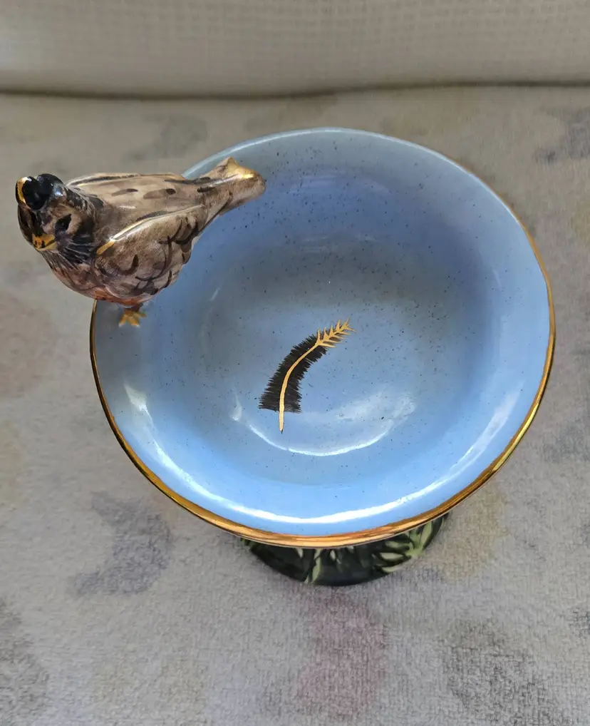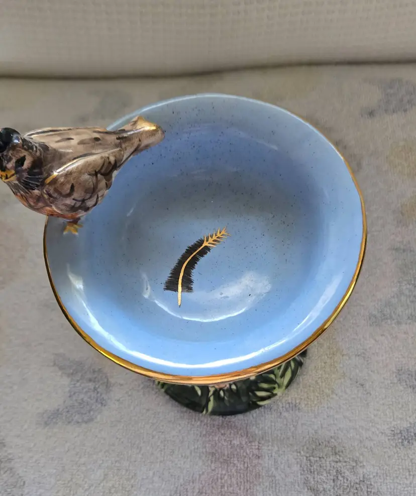 From The "Robin's Song Collection" . Madeof high quality ceramic. Multi-coloredcandle holder or wax warmer. Manufactured in 2002. Stands 7" tall,5" wide, and 3 1/2" across the bottom. It has a feather 🪶 on the inside of the birdbath. And it Has A Bird On It!.