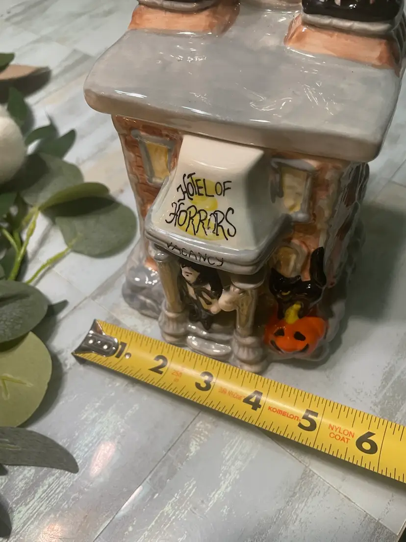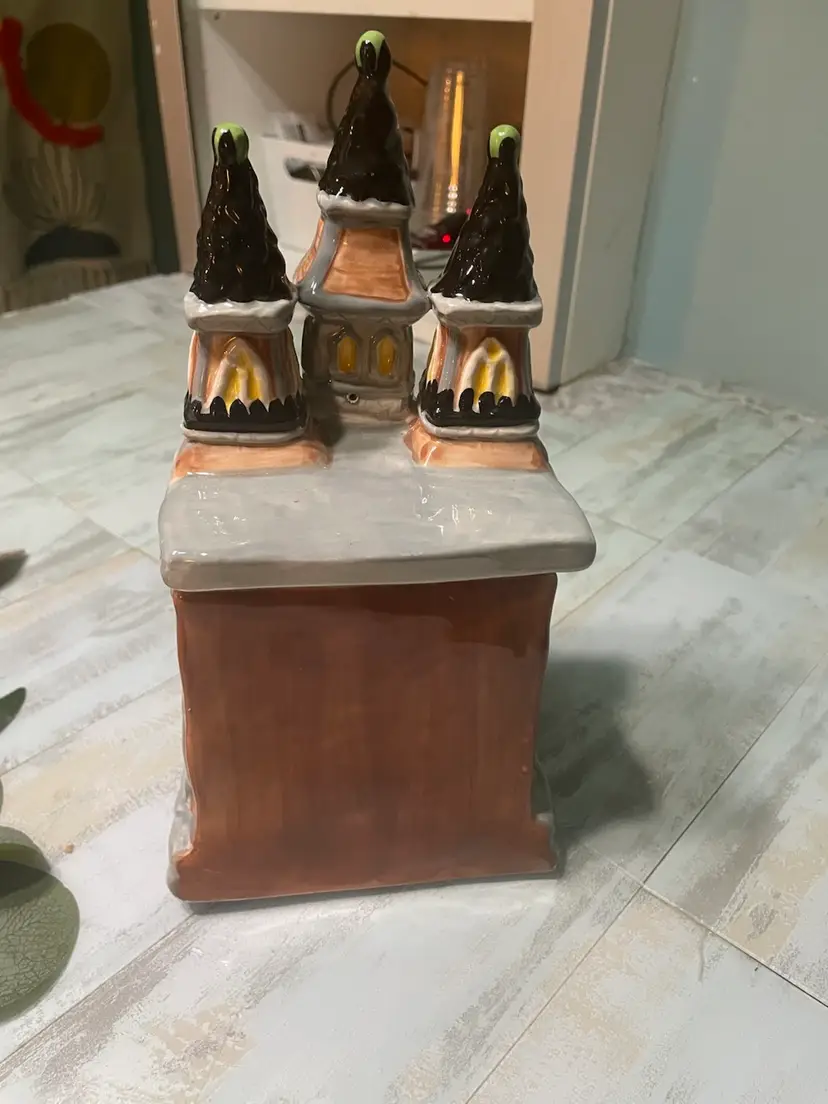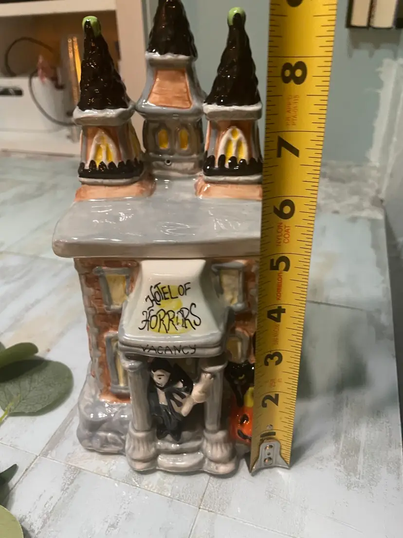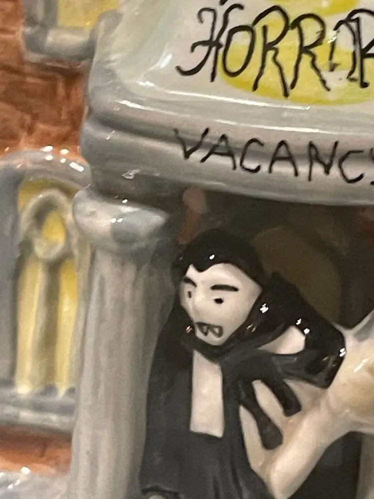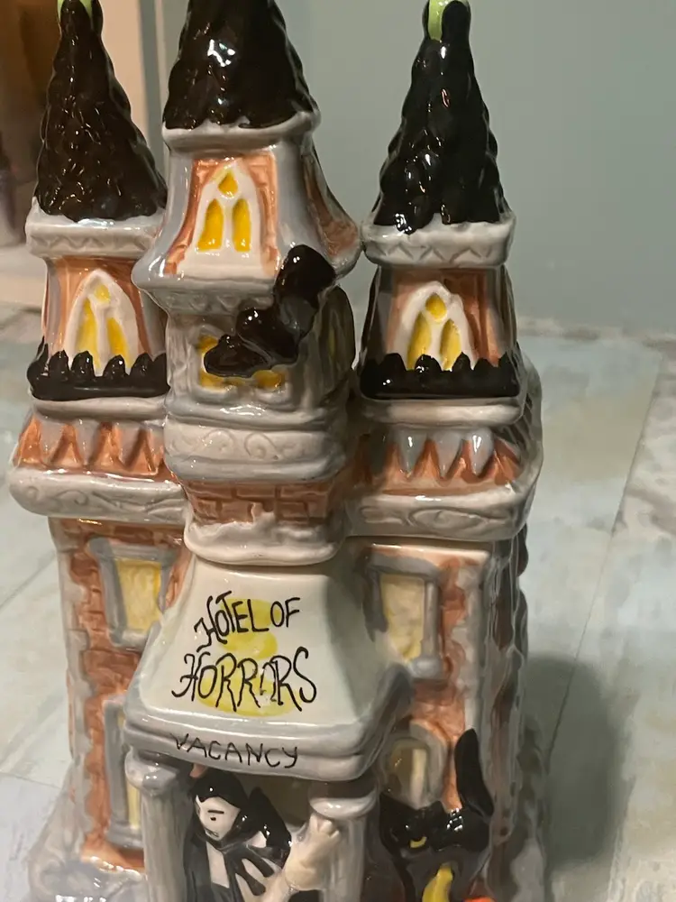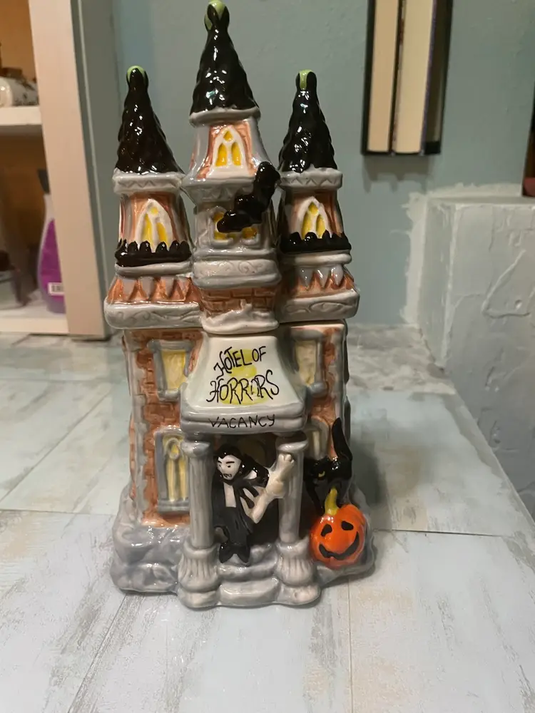 This Vintage Blue Sky “Hotel of Horrors” Vampire 11” Tall Ceramic Tea Light Candle House Halloween is in excellent condition with no chips or cracks. Could also be used as small canister