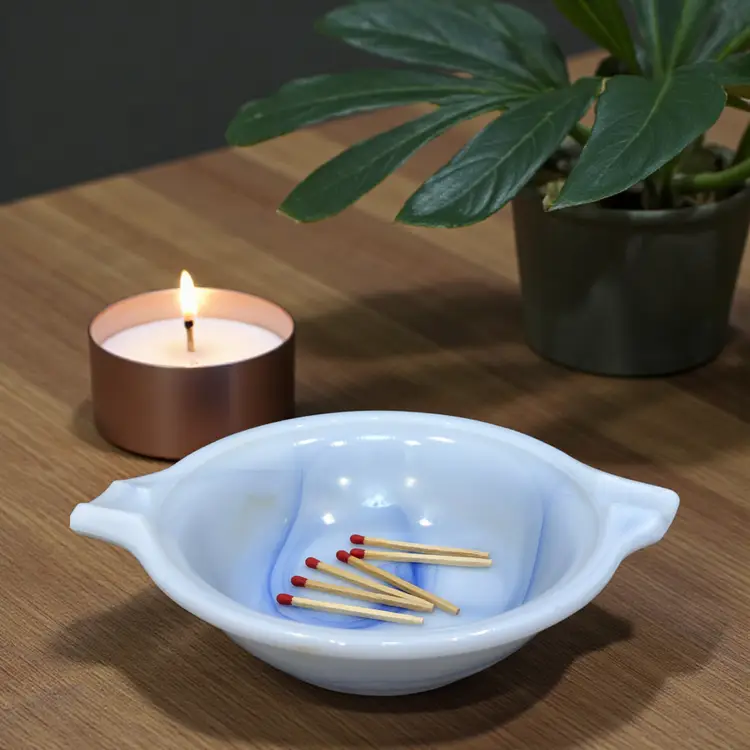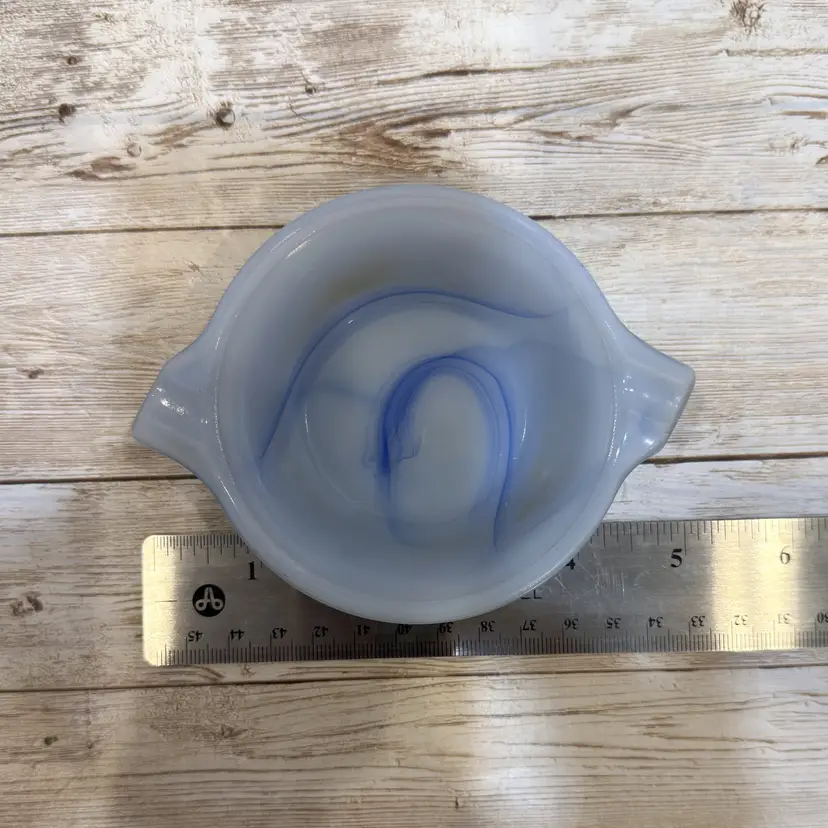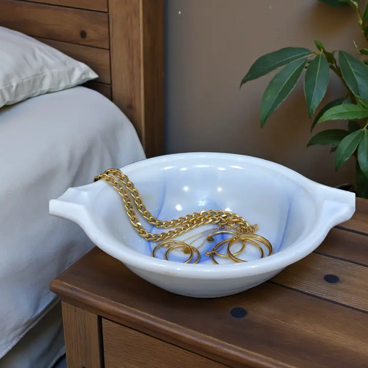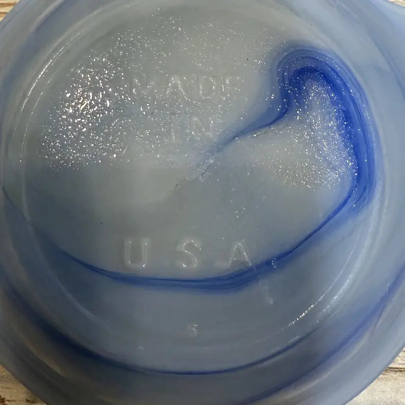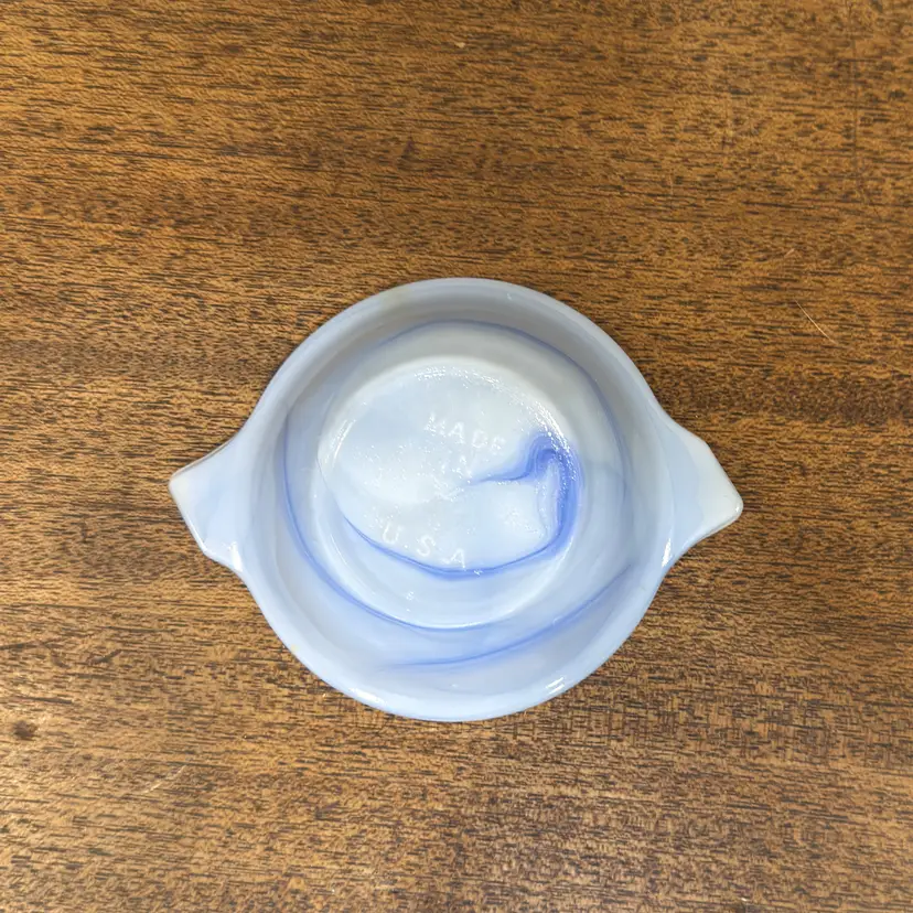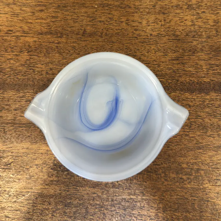 Unlike standard clear glass, this 1930s slag glass features a dense, marbled blue and white "ellipsoid" design. This means each piece has a unique swirl pattern that creates a striking geometric pop on any surface, resulting in a conversation piece that doubles as a practical catchall.