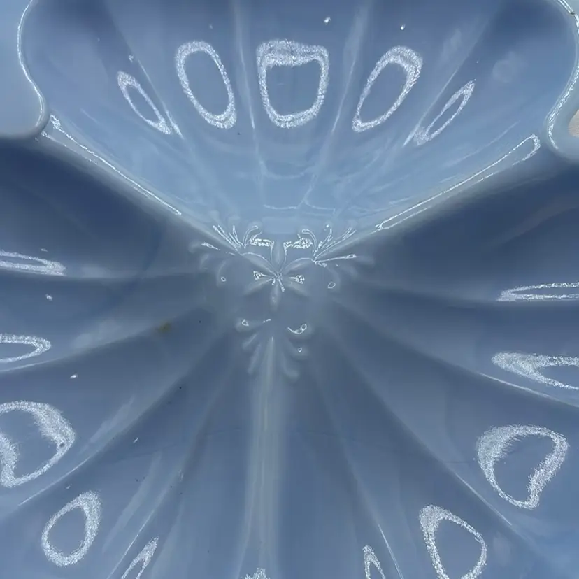 Vintage 1930’s Jeannette Glass blue slag glass 3!section nut/ candy dish. No chips or cracks. Measures 7” long by 7” across