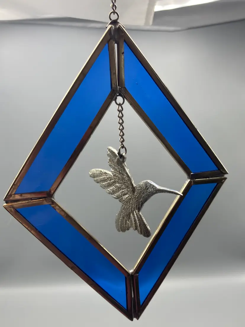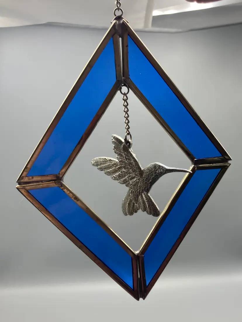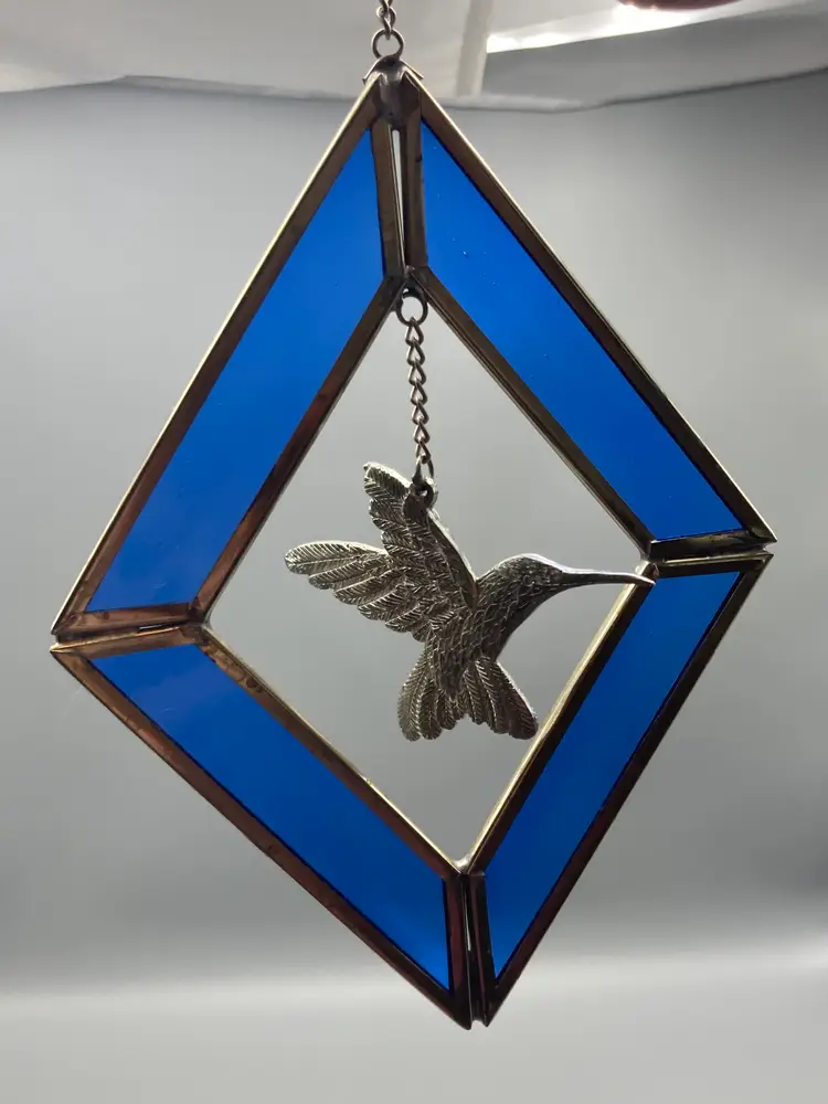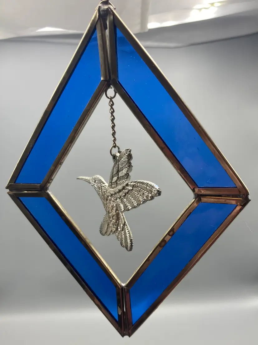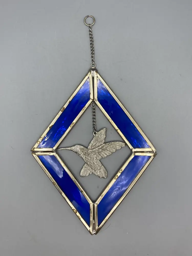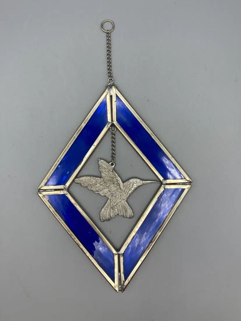 This sun catcher is in good condition. It measures approximately 6 1/2" tall x 4 3/4" wide and 8 1/4" tall including the chain and hanger.