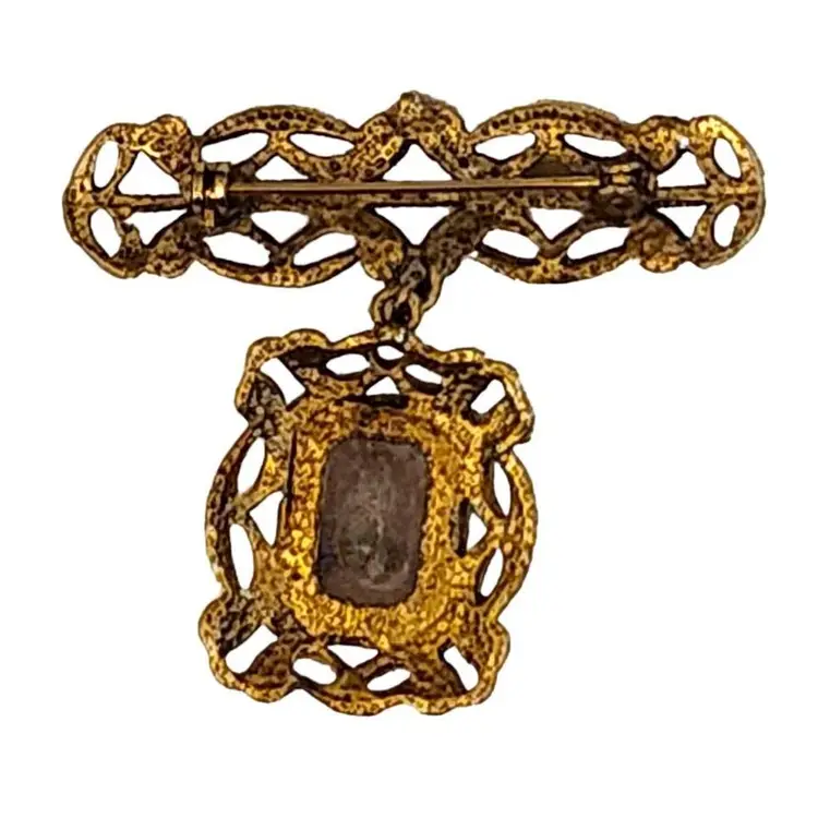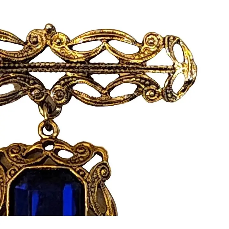 Large blue acrylic faceted stone set in an art deco design frame Suspended from a bar pin with the same art deco design Secure rollover clasp Beautiful condition!