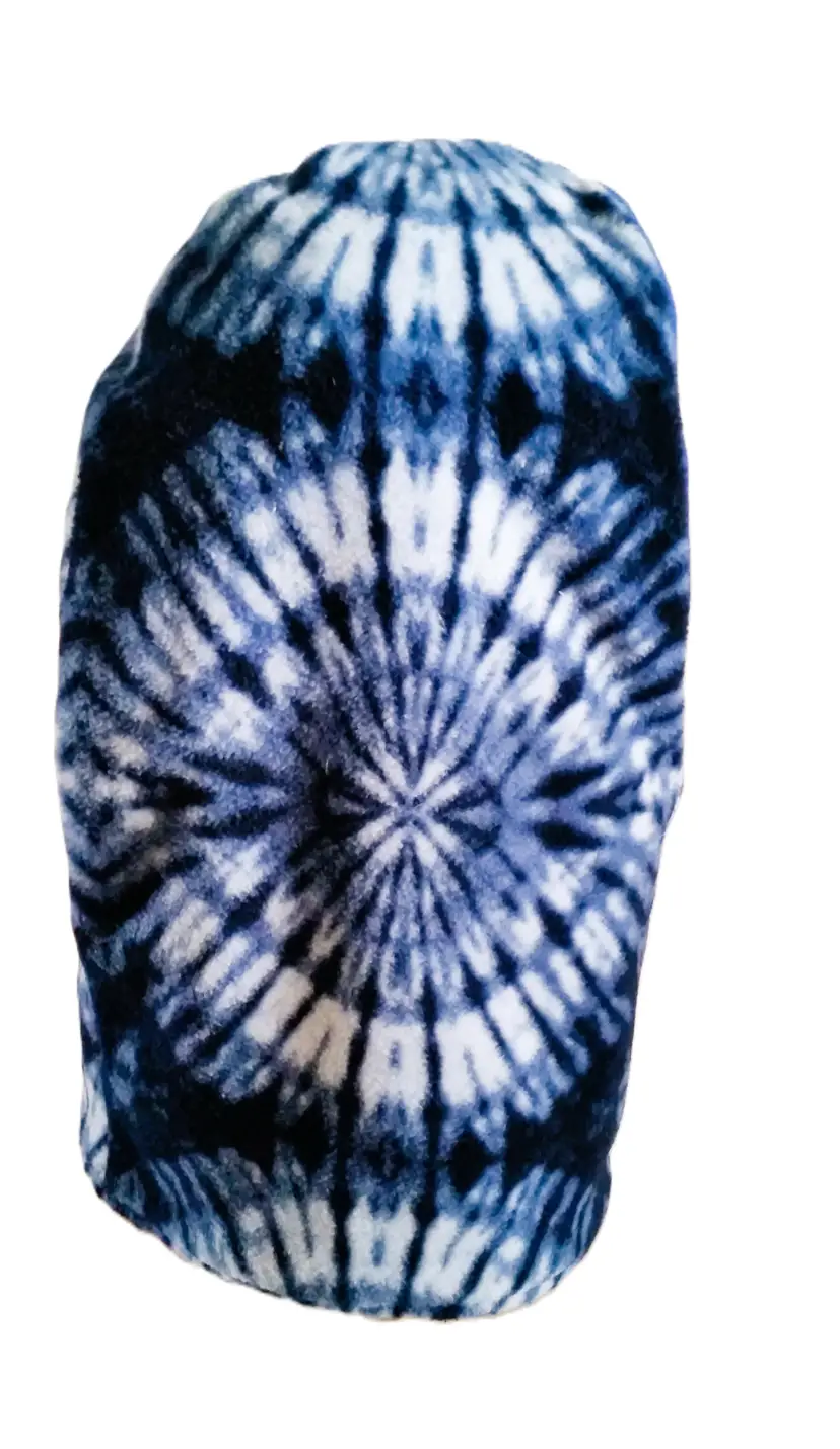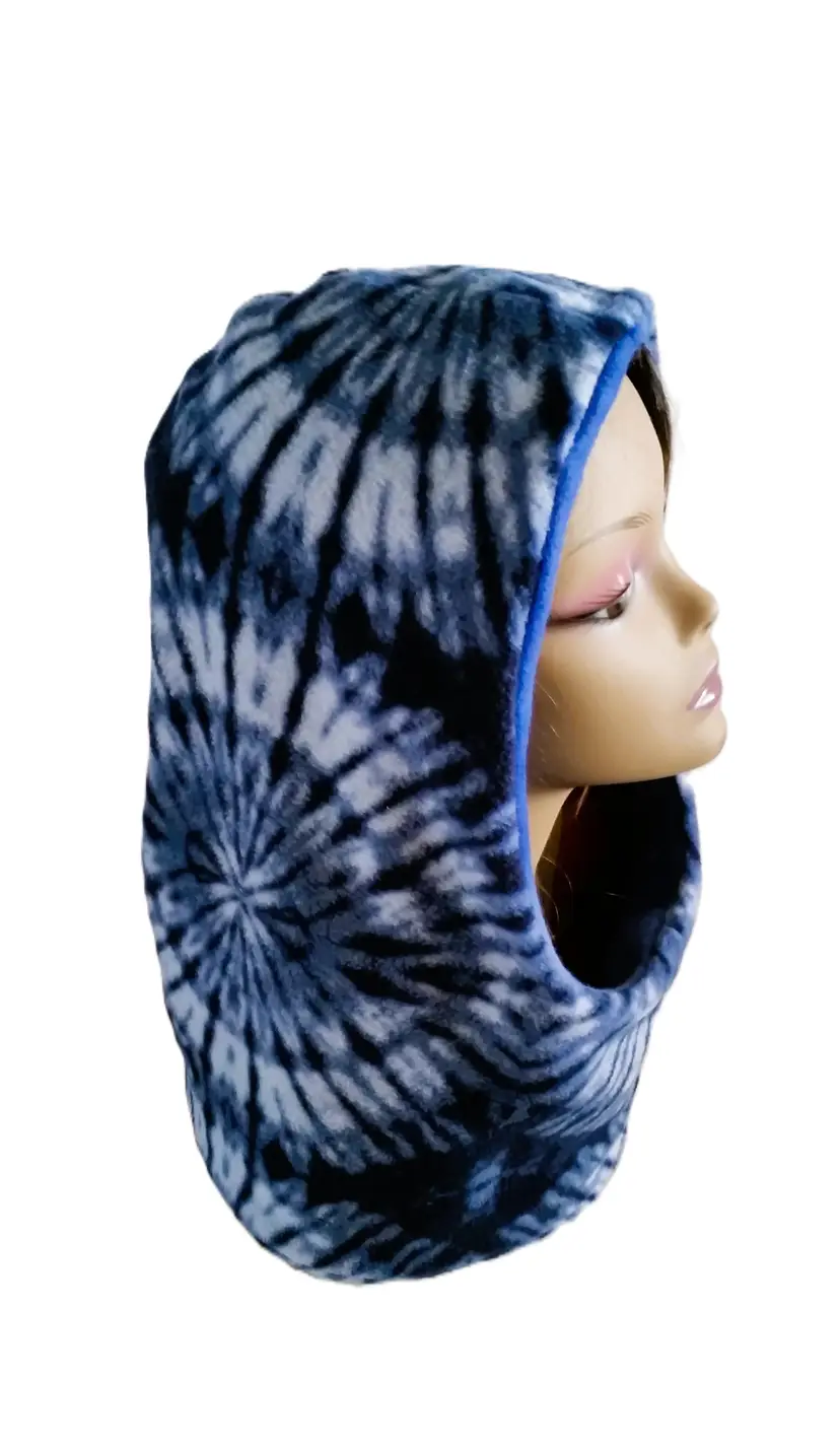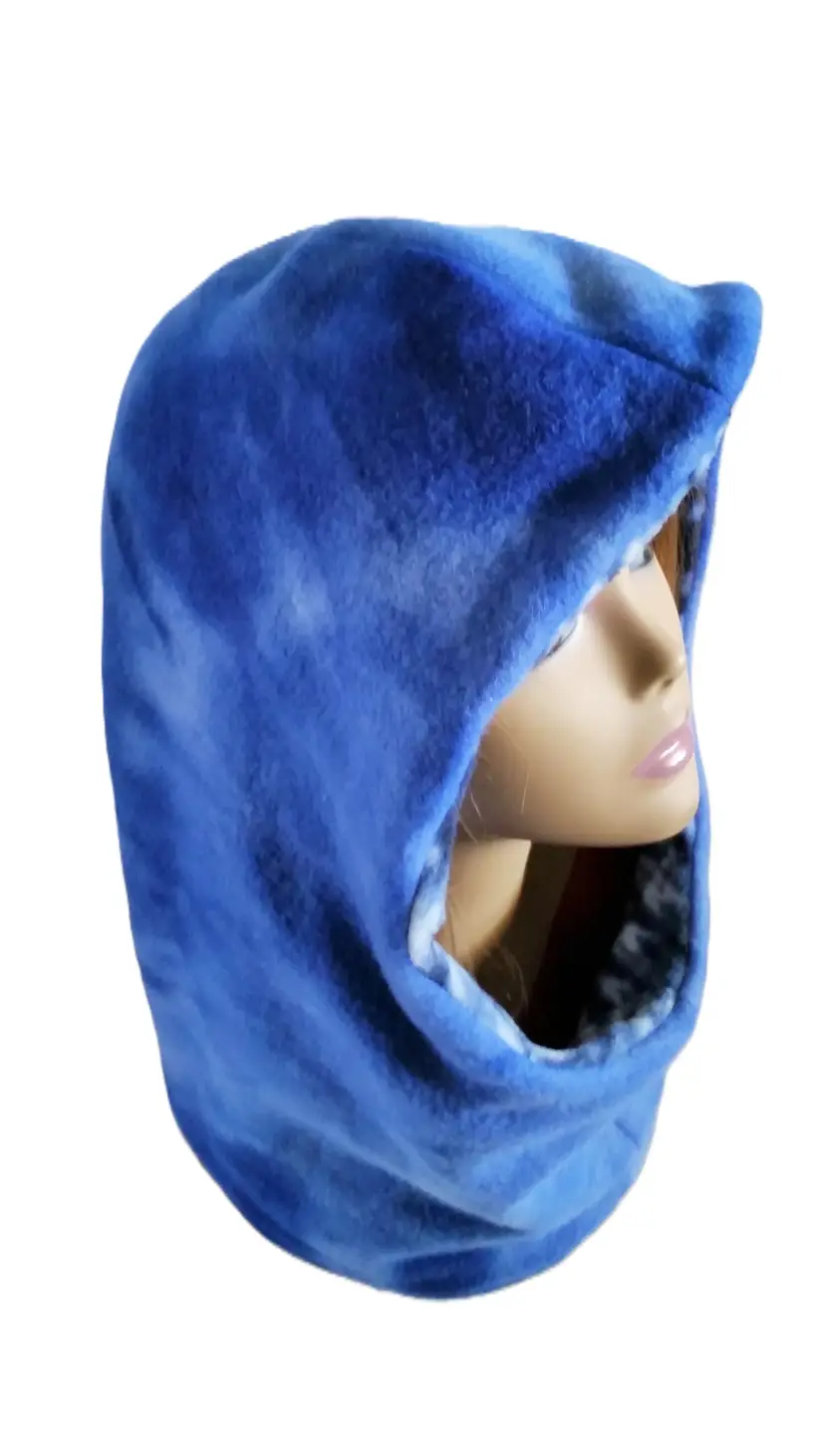 This hood is soft and cozy. It has a very nice tie dye pattern. The lining is a coordinating blue. It is made of soft fleece. This will keep your head, neck and ears warm in those cold winter months. This hood is a one size fits all.