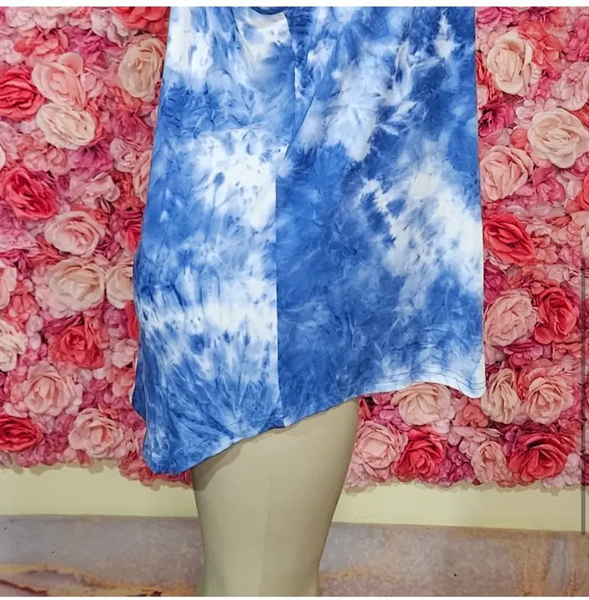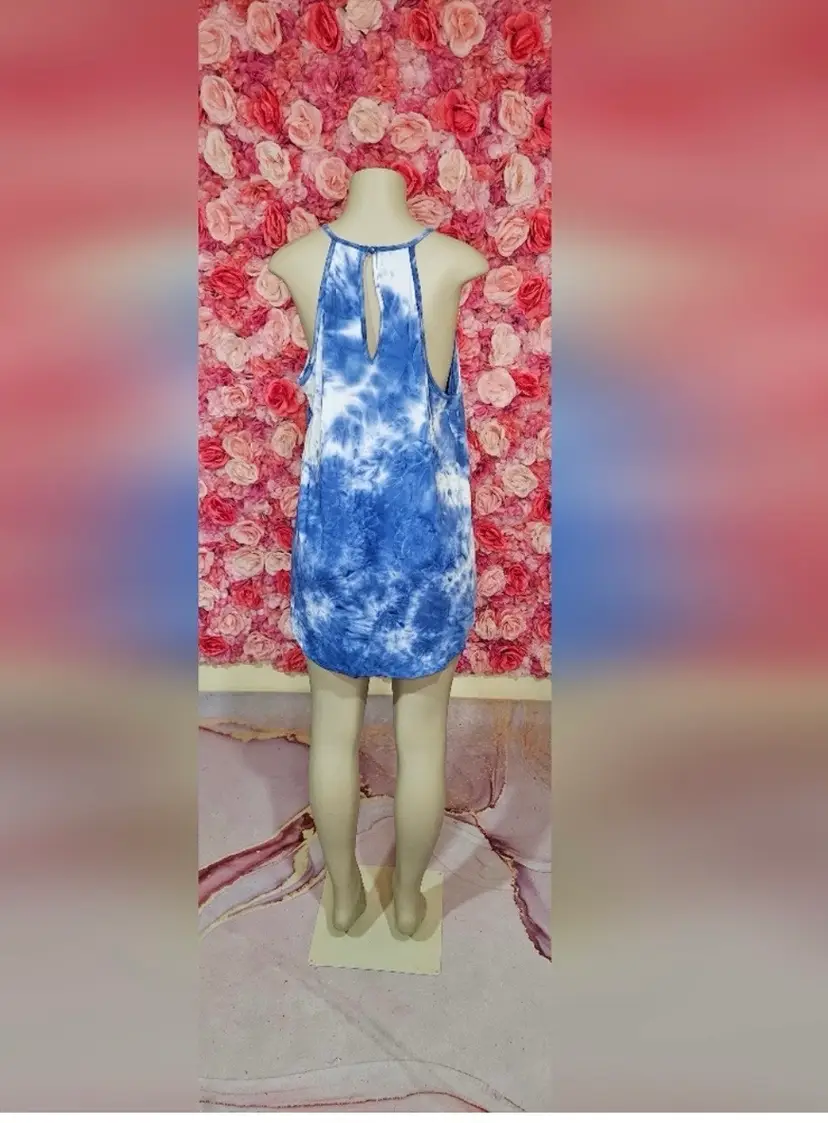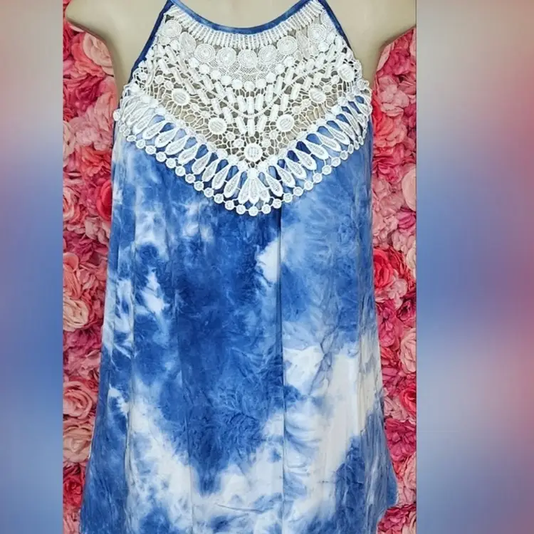 This sleeveless women's top features a blue and white tie-dye pattern with a detailed white crochet lace panel on the chest. The high neckline and racerback style include a keyhole button closure at the back for an elegant finish.