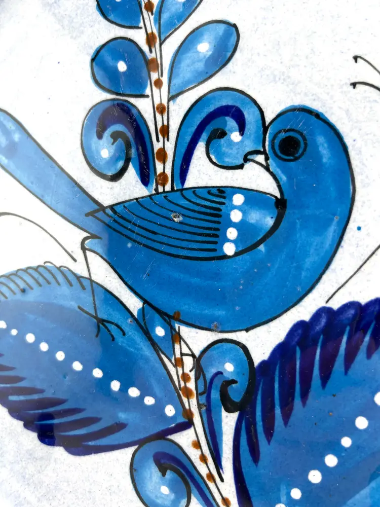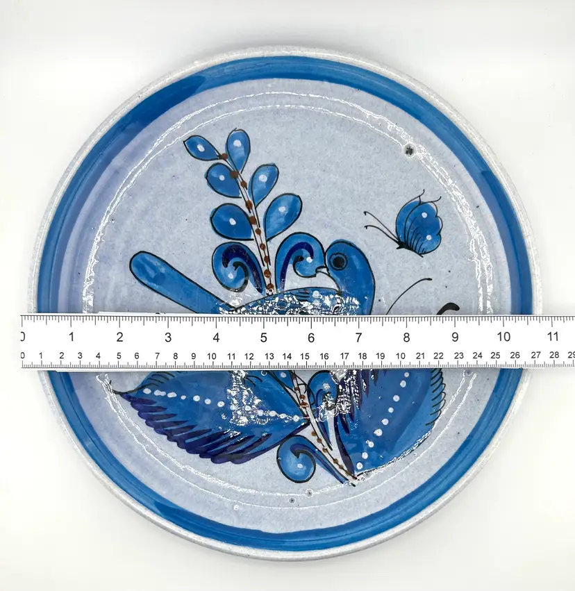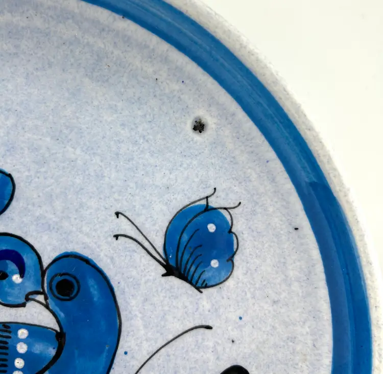 Has some dark clay spots and some surface scratching from use. No chips or cracks.