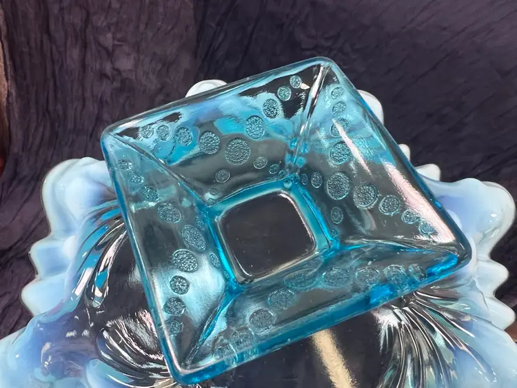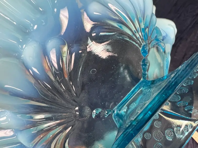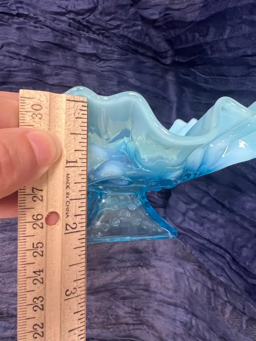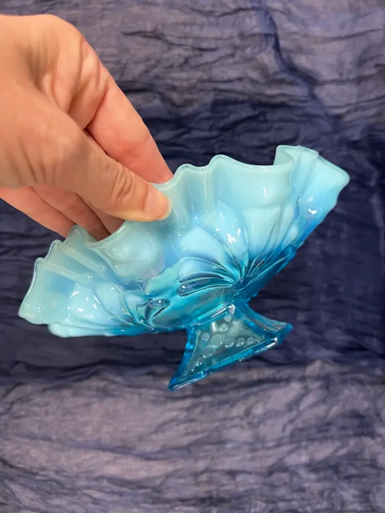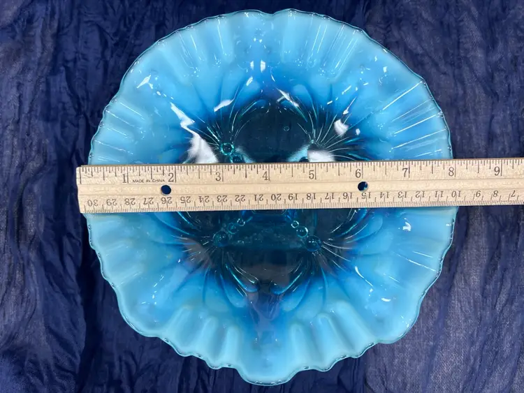 Elegant blue vintage glass bowl with a scalloped edge. Interesting color fade and design making it a striking focal piece. Ideal for tabletop display or as a decorative accent. No chips or cracks but there are manufacturer bubbles in glass (pictured).