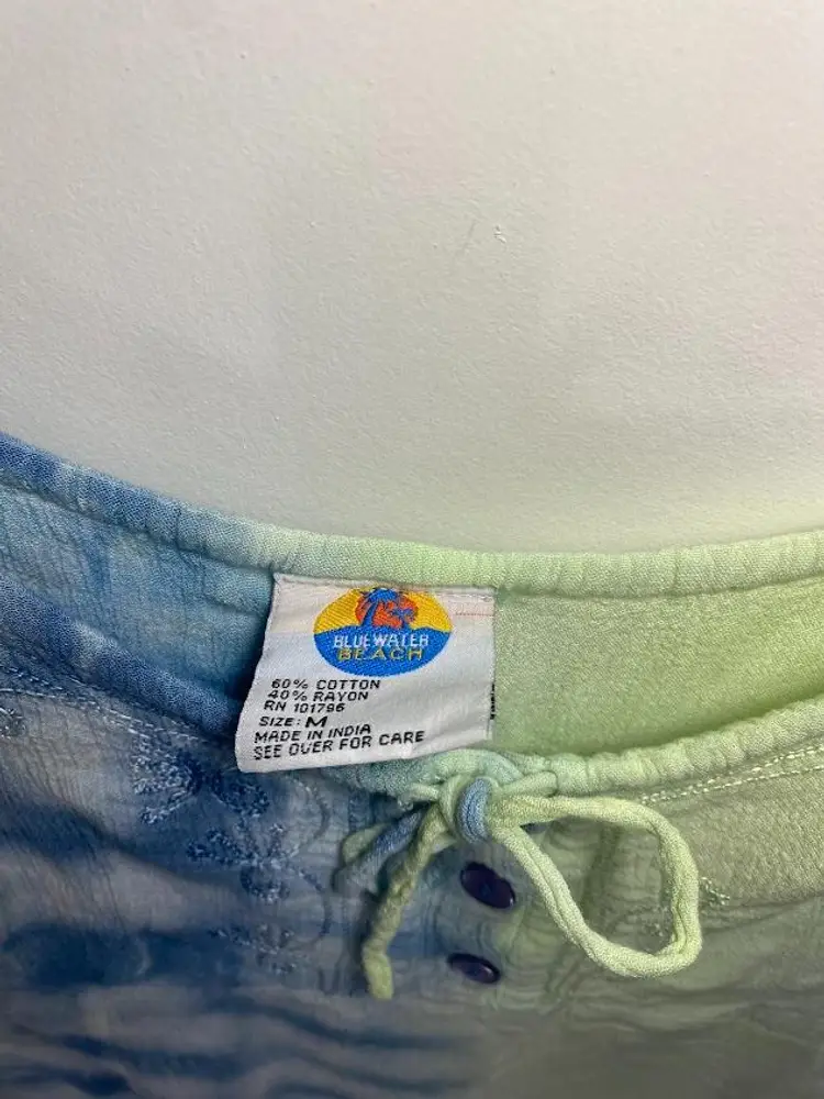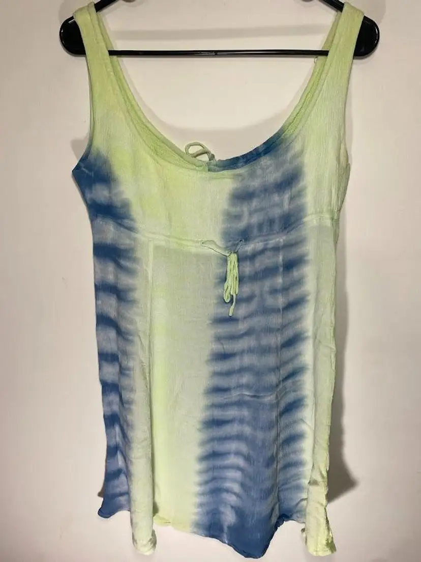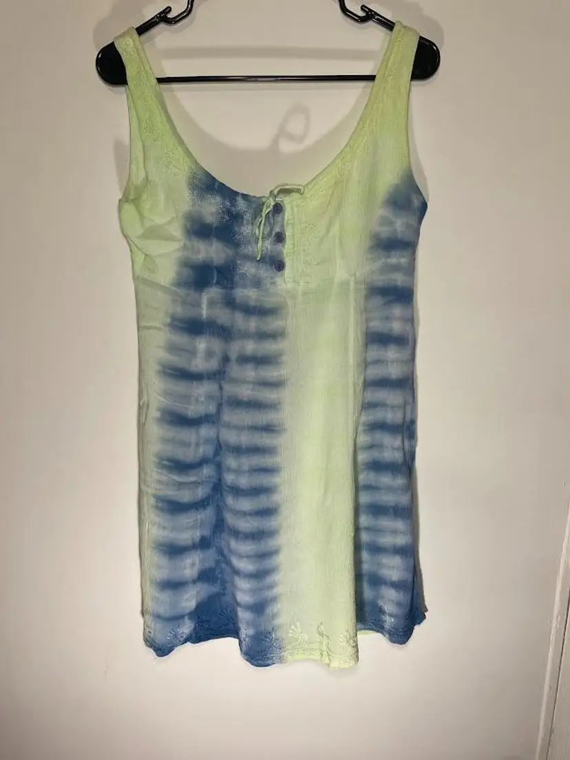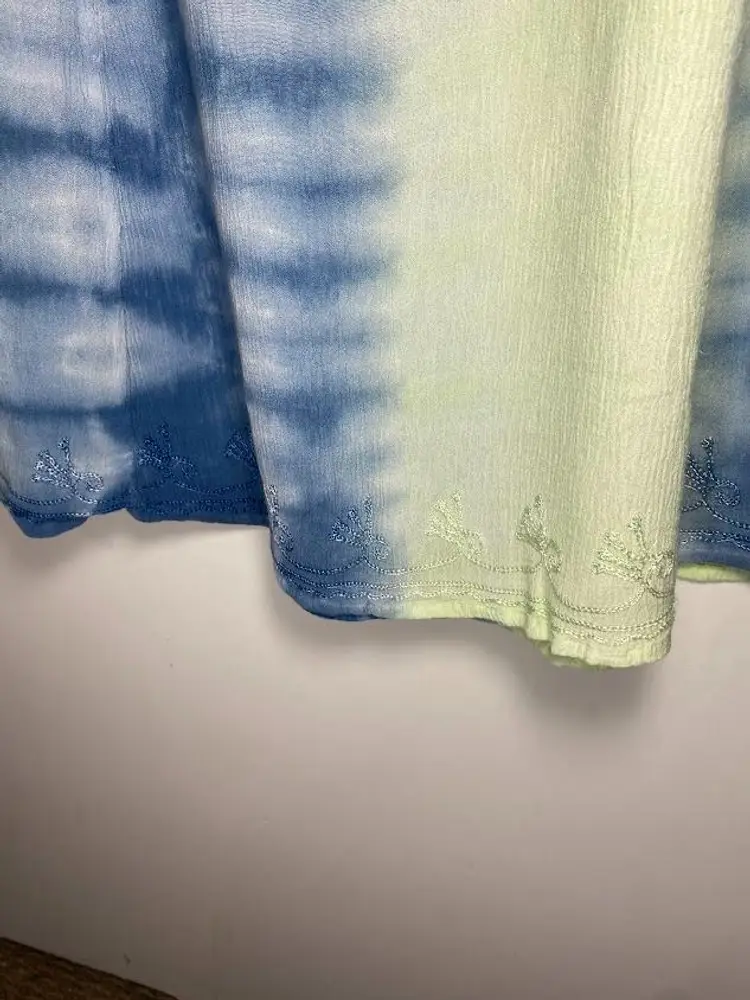 Women's vintage blue water beach tie dye dress with embroidered details. Tie front. Size M. Good condition. Pit to pit: 16". Total length: 34.5".