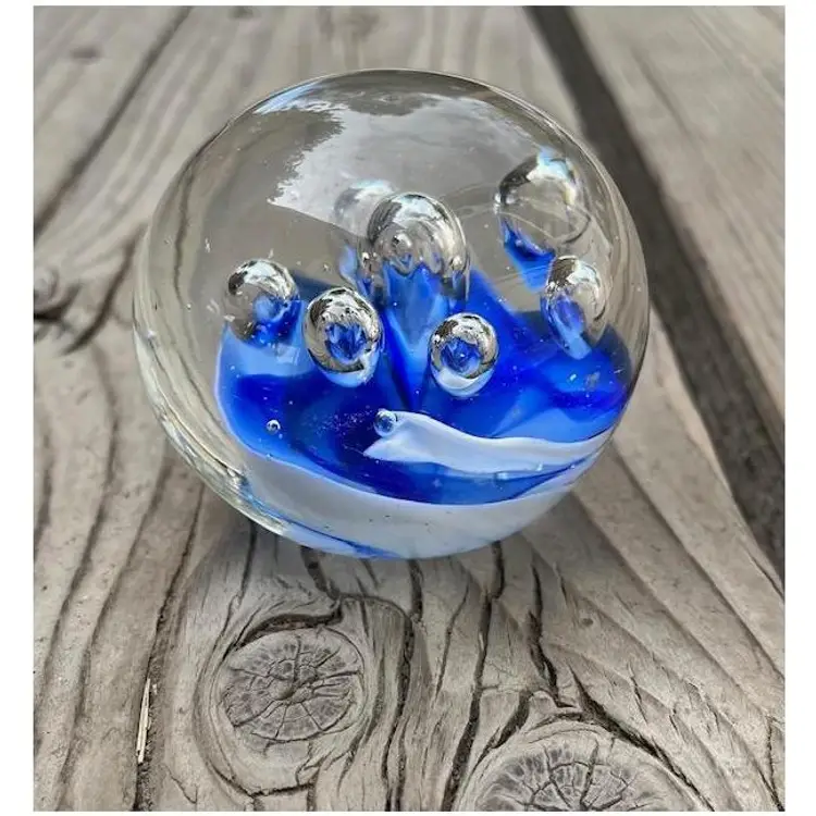 A blue and white glass paperweight. Just shy of 3" Tall and 1 1/2" Wide. Weight is approximately 1 lb. Excellent Condition.