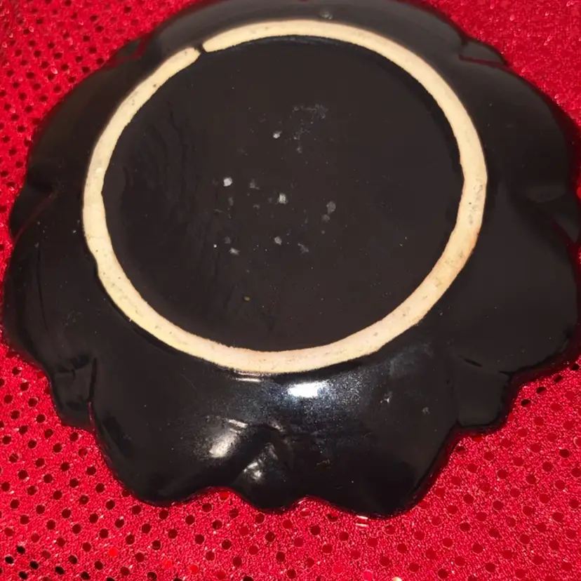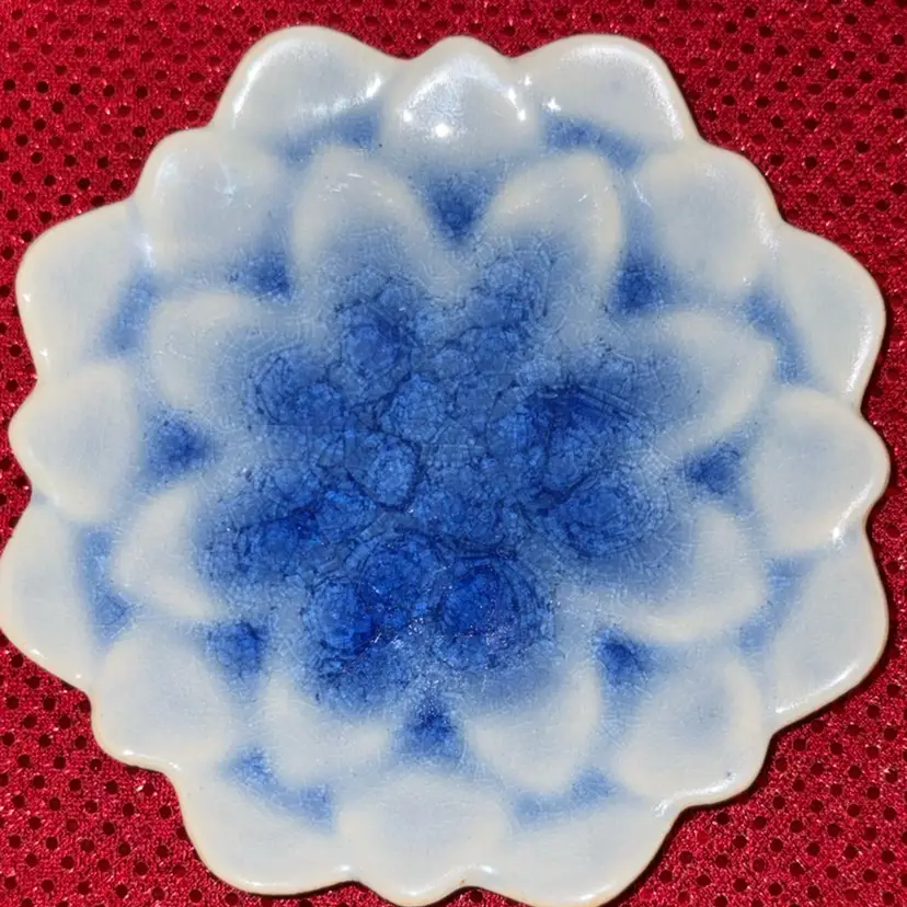 This is a blue ceramic dahlia or lotus flower-shaped appetizer plate with a crackle glaze finish. It is approximately 6.5" in diameter. The plate is perfect for serving appetizers, sushi, or small dishes. It is often described as having a "kiln change" pattern, making each piece unique. The item may be vintage and is likely made in Japan