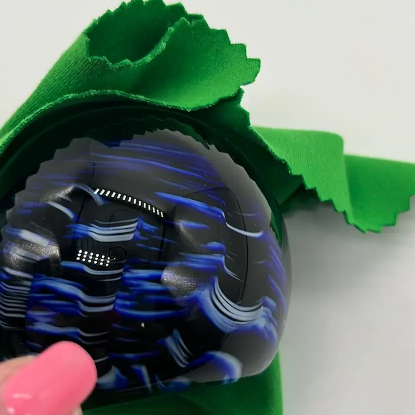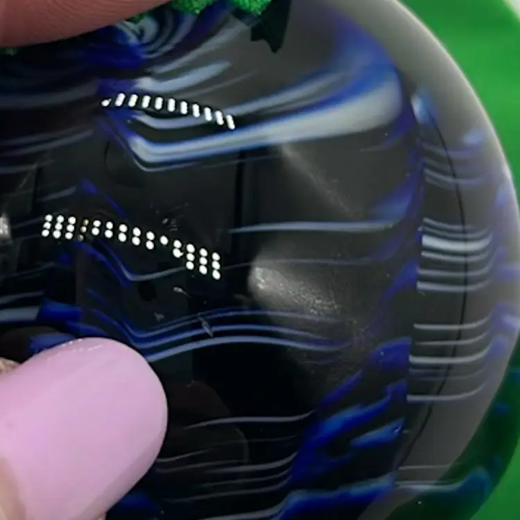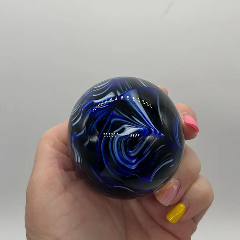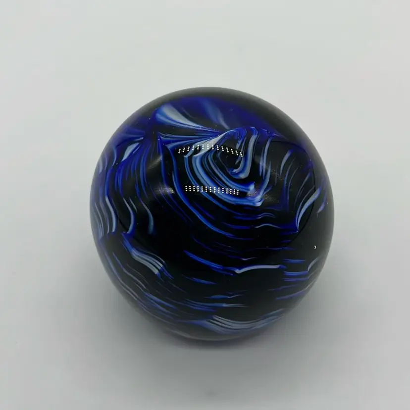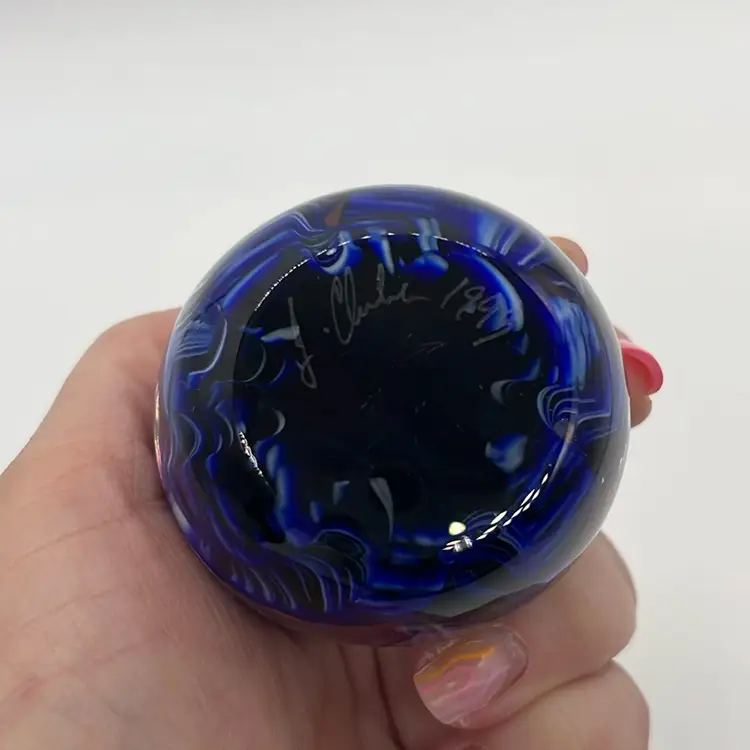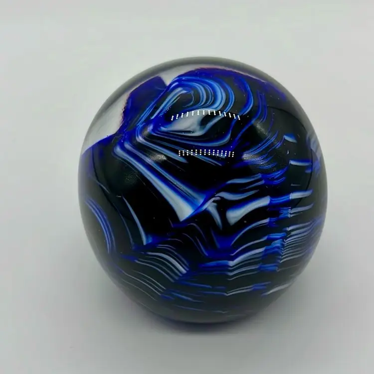 Stunning design of blue and white swirl glass paperweight, signed and marked 1993. Small scratch in one area and a mark within glass in another which appears to be within the process of making. No chips or cracks. Approx: 2” d