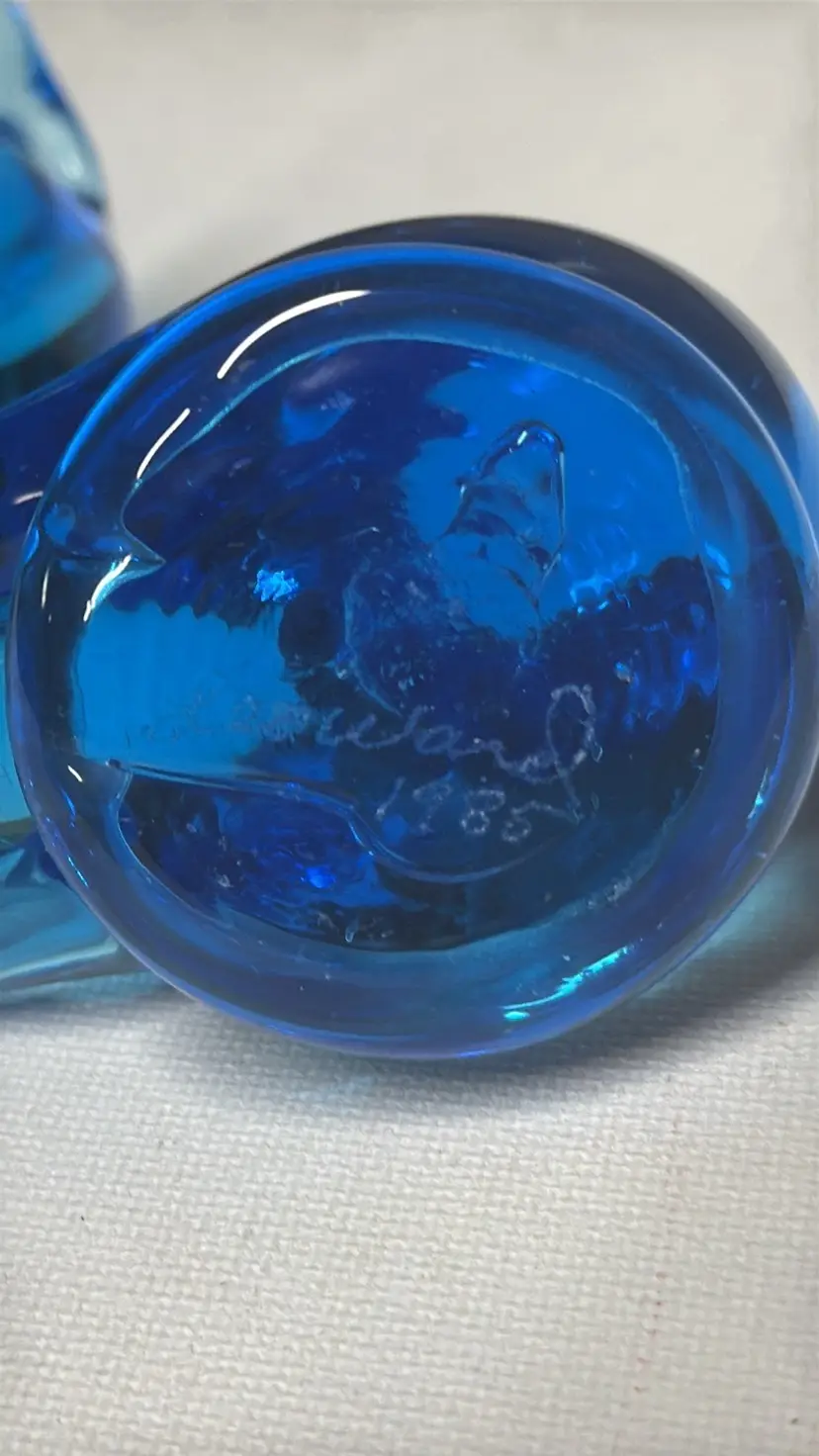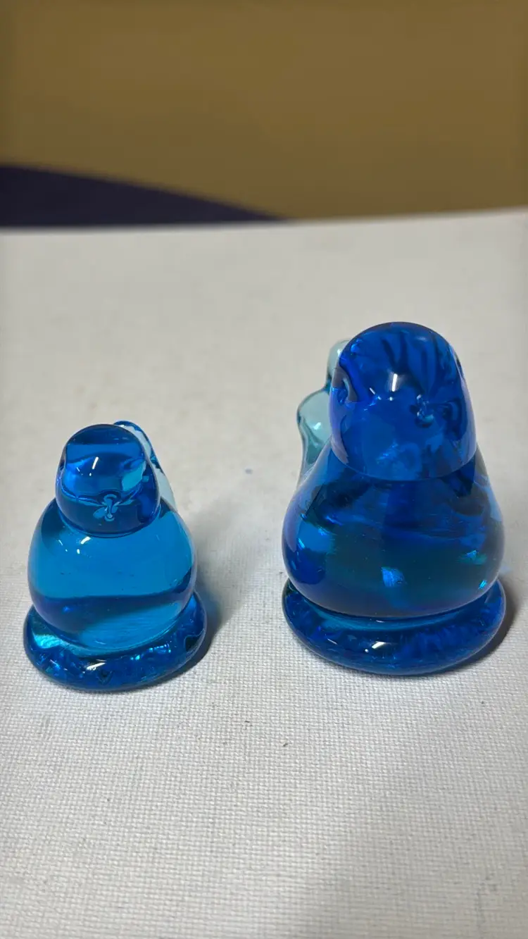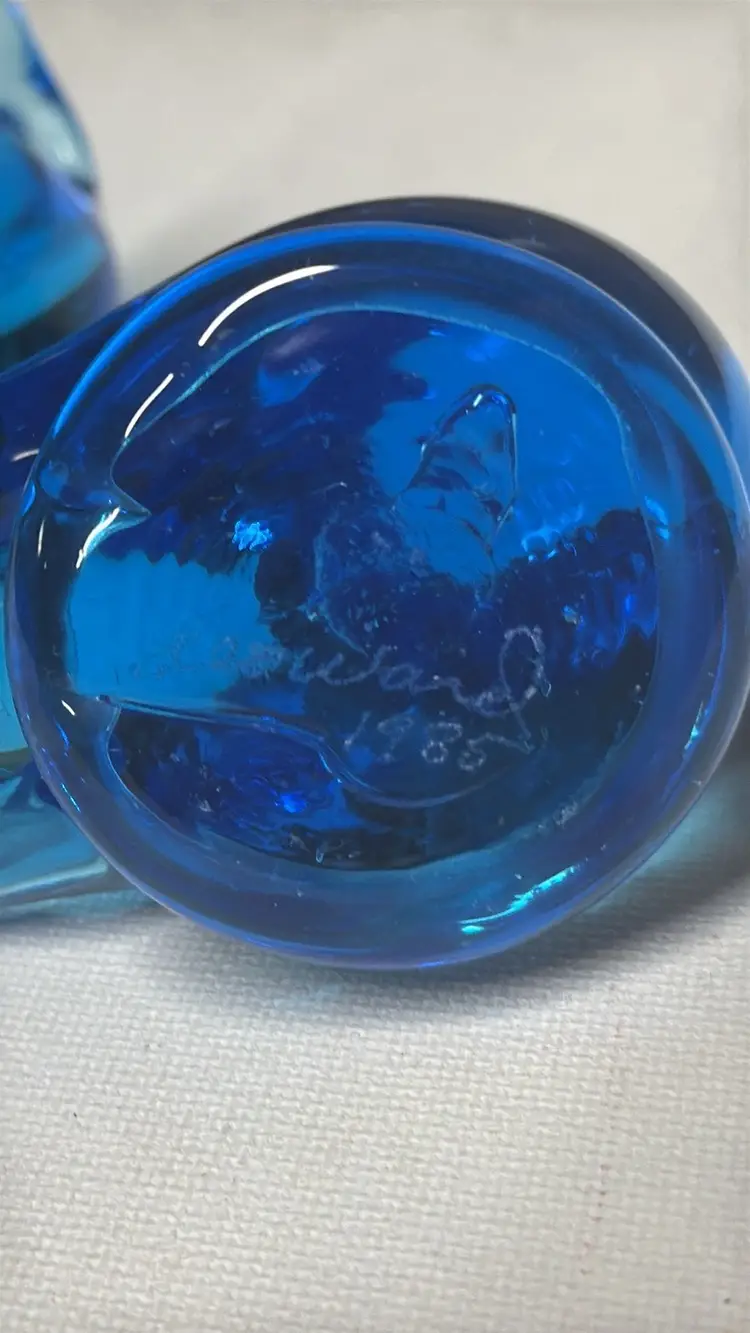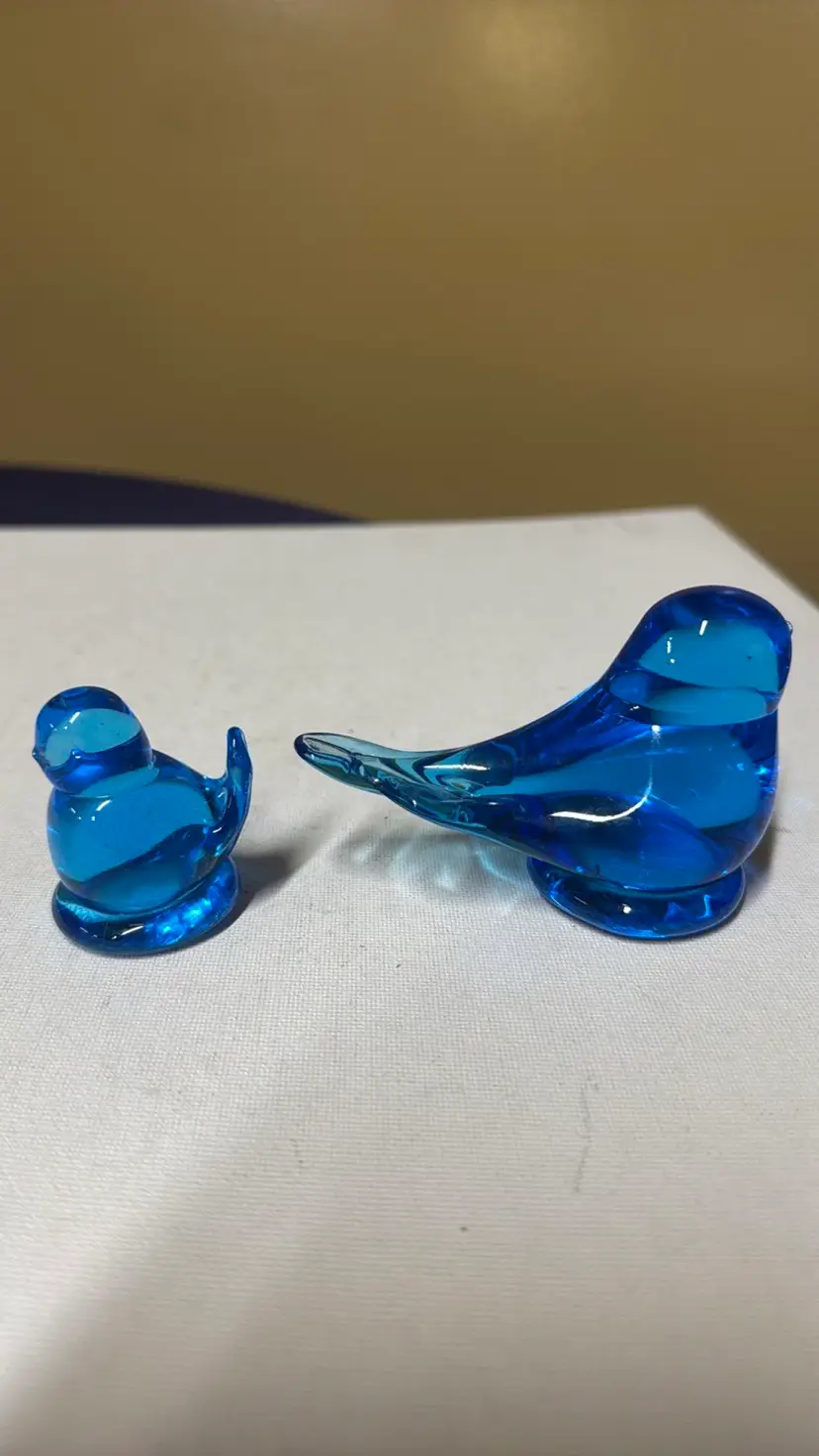 2Bluebird of Happiness Signed Leo Ward Blue Glass Bird parent and child About 2.75” tall 3.75” long The small one is 2” tall Excellent condition no breaks chips or scratches Adorable (157242510)
