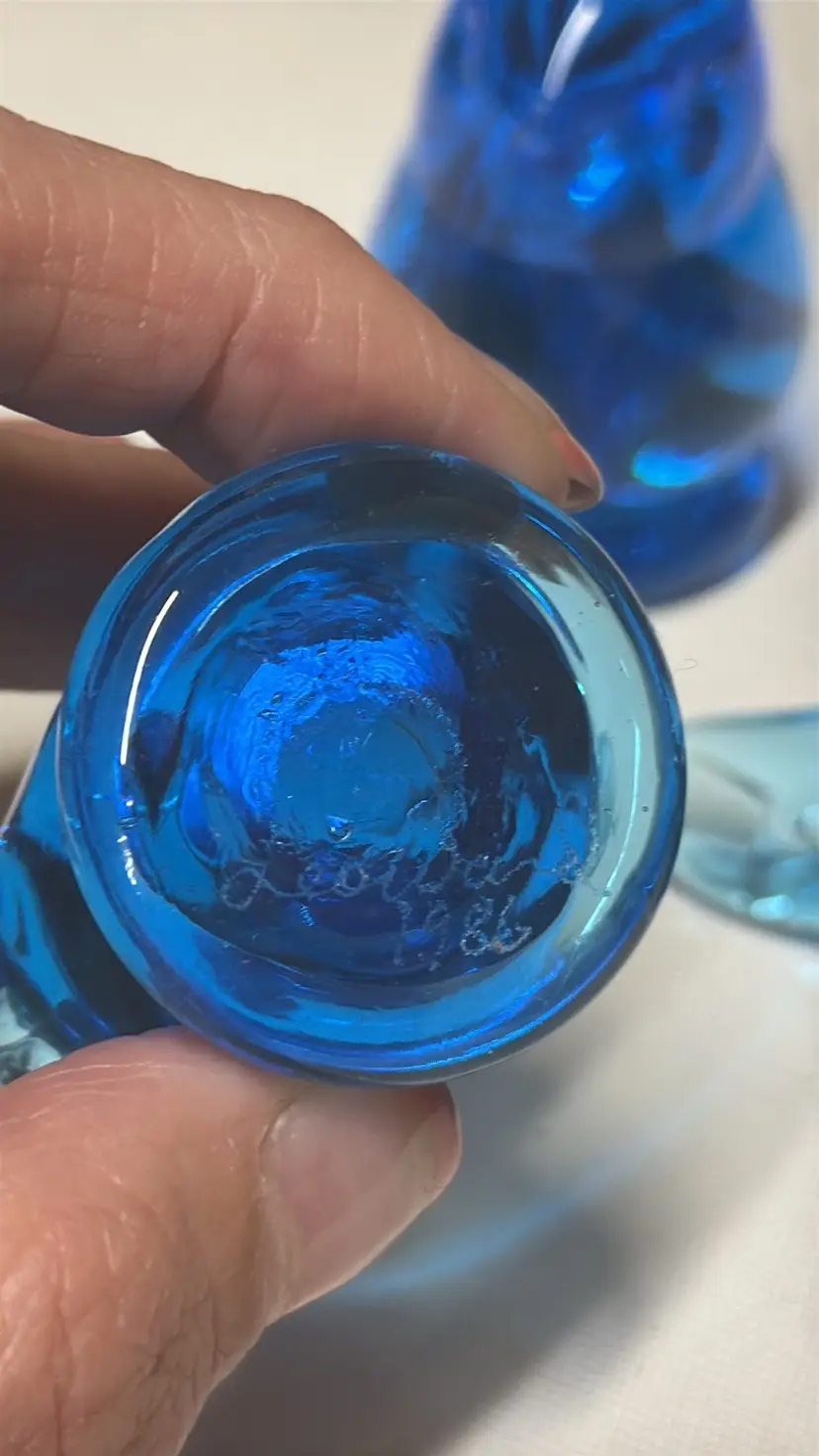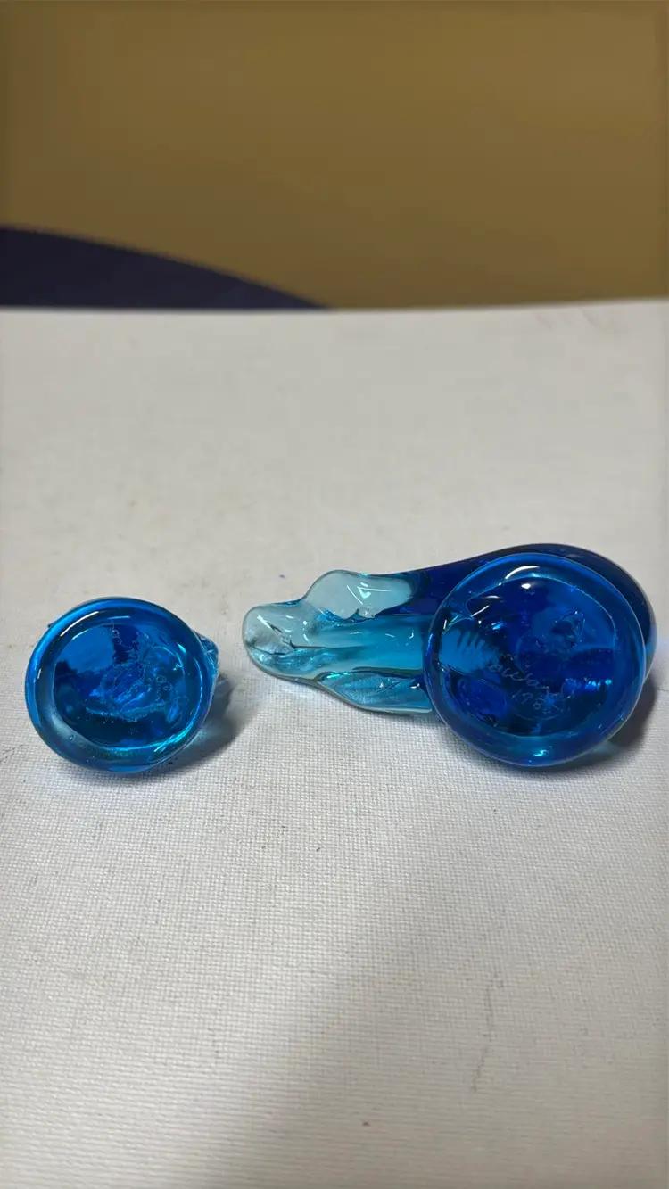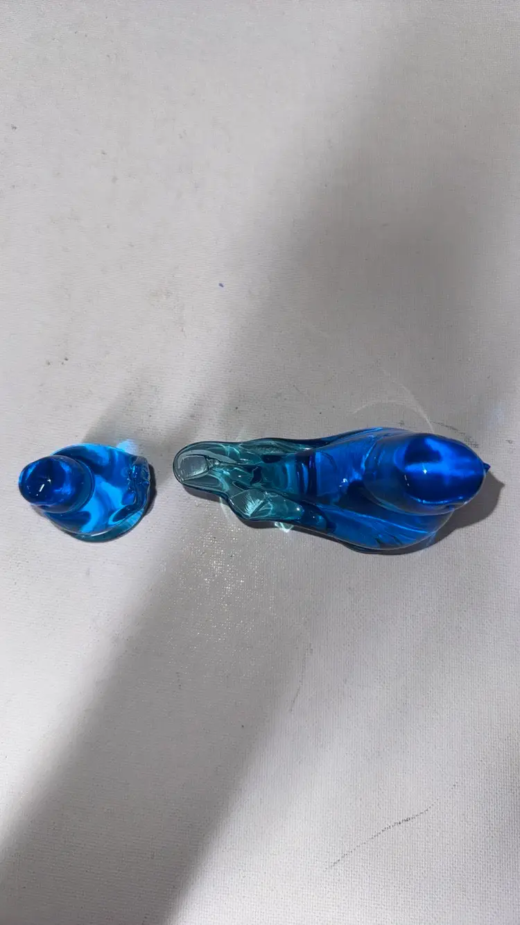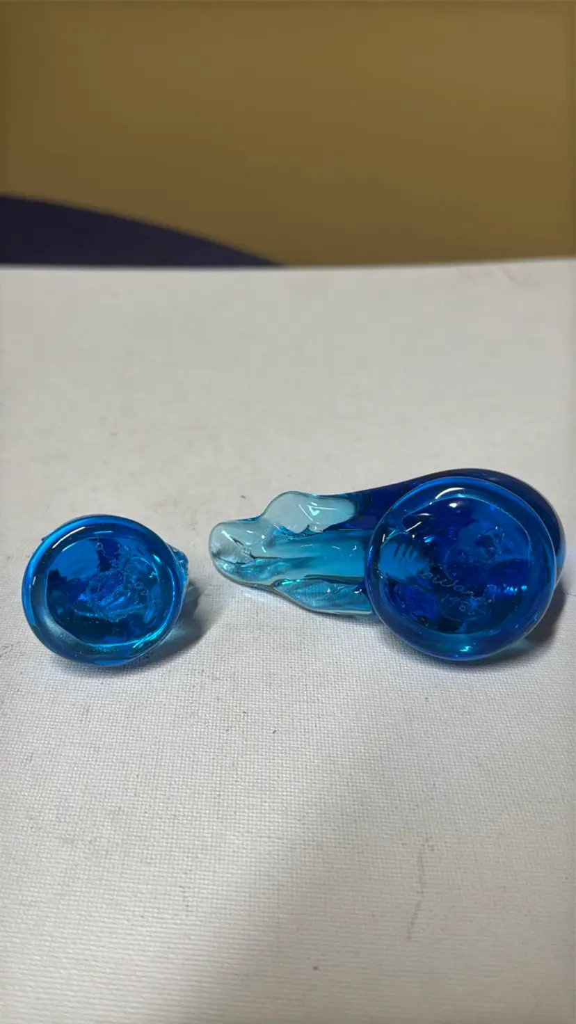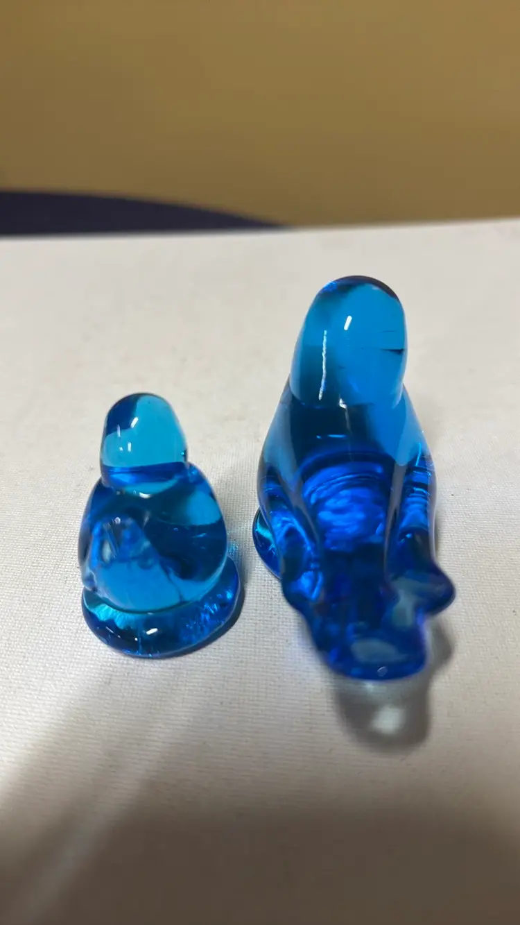 2Bluebird of Happiness Signed Leo Ward Blue Glass Bird parent and child About 2.75” tall 3.75” long The small one is 2” tall Excellent condition no breaks chips or scratches Adorable (157242510)