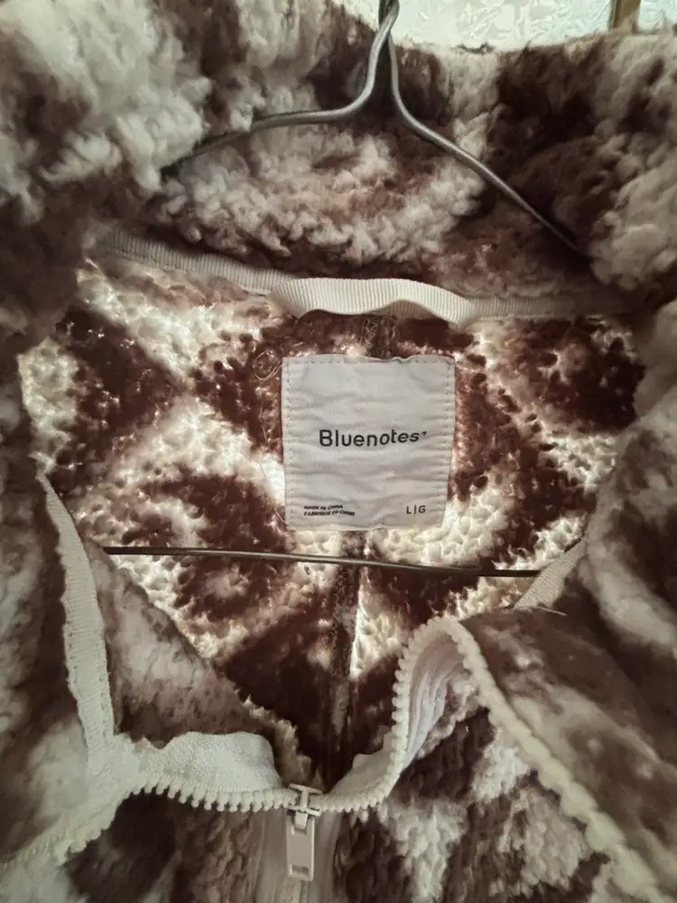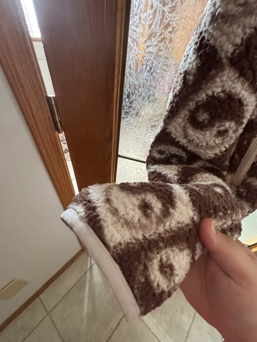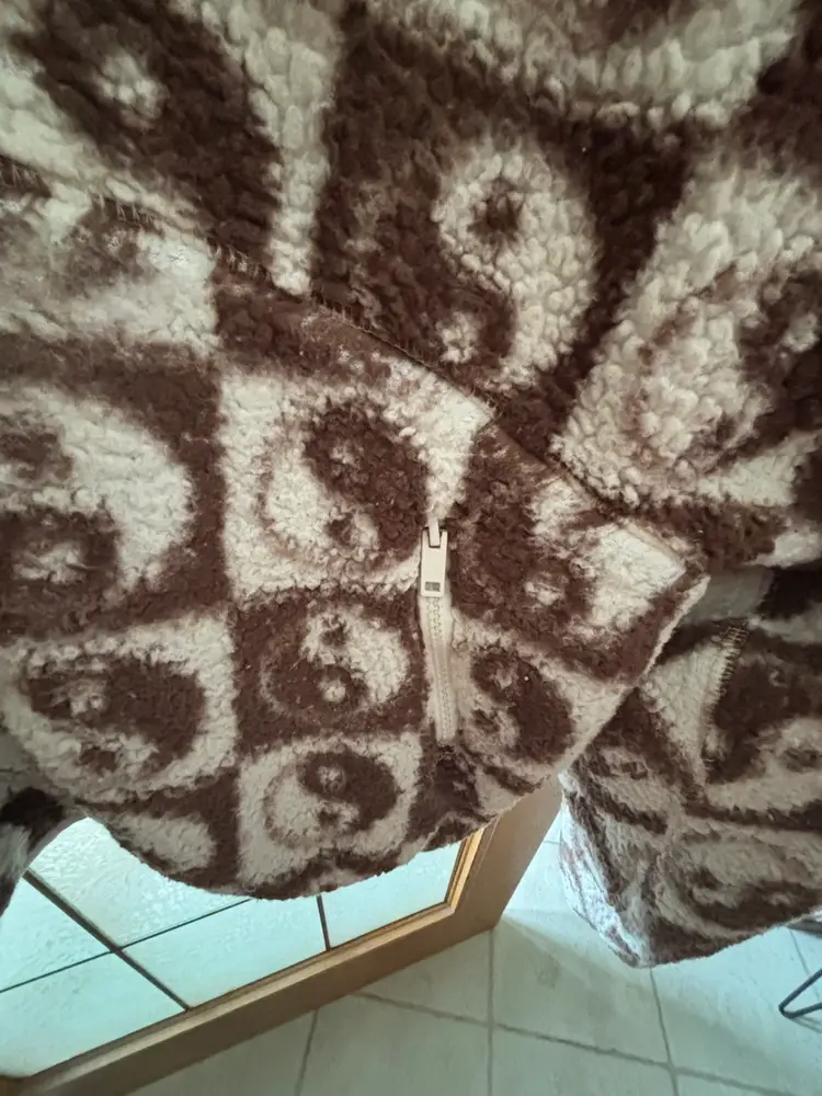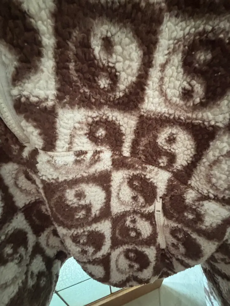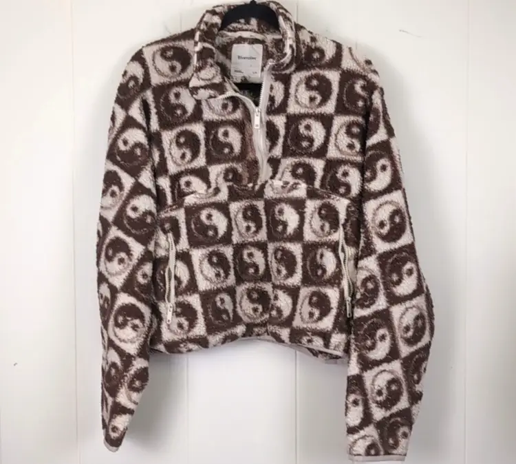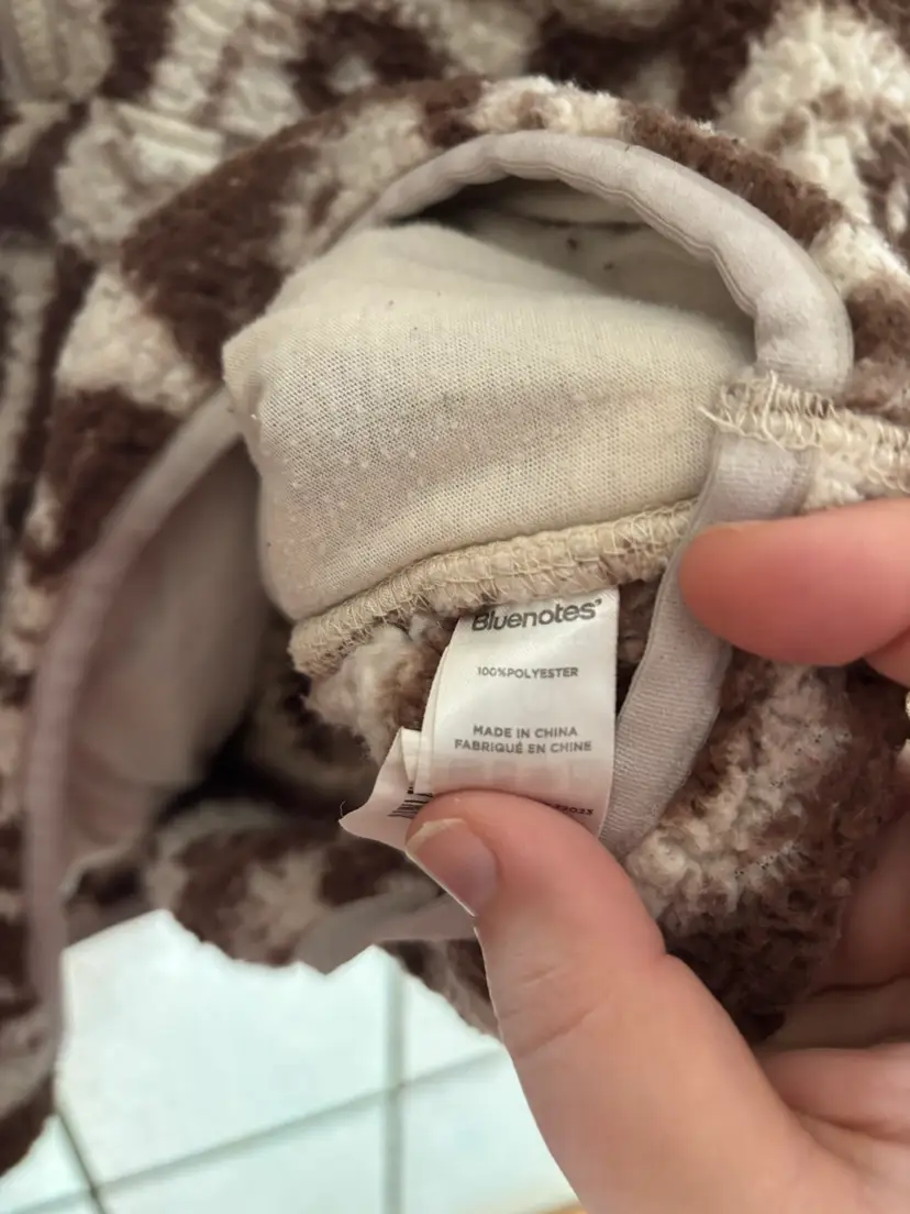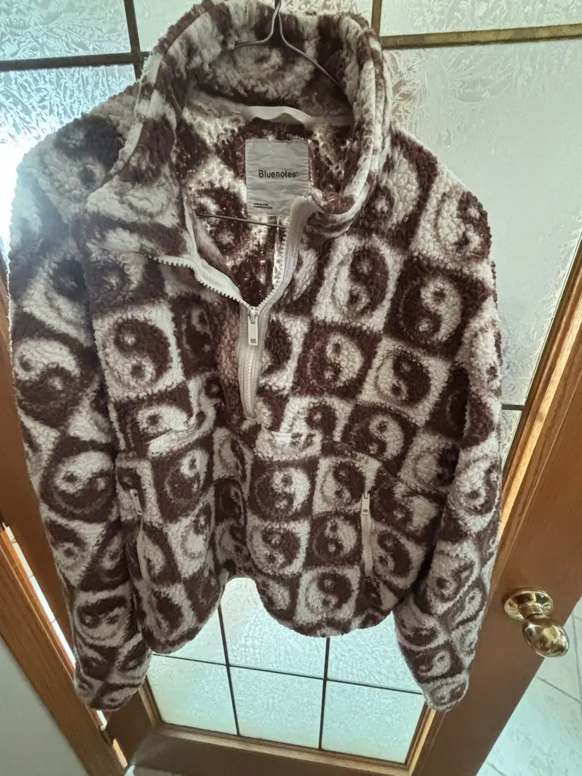 Soft fleece pullover with a stylish pattern. Features a cozy design. Pocket design looks like two separate pockets, but it does go all the way across as one big pocket where your hand can go all the way through. 26” pit to pit, 22” length.