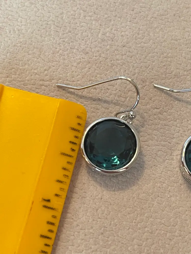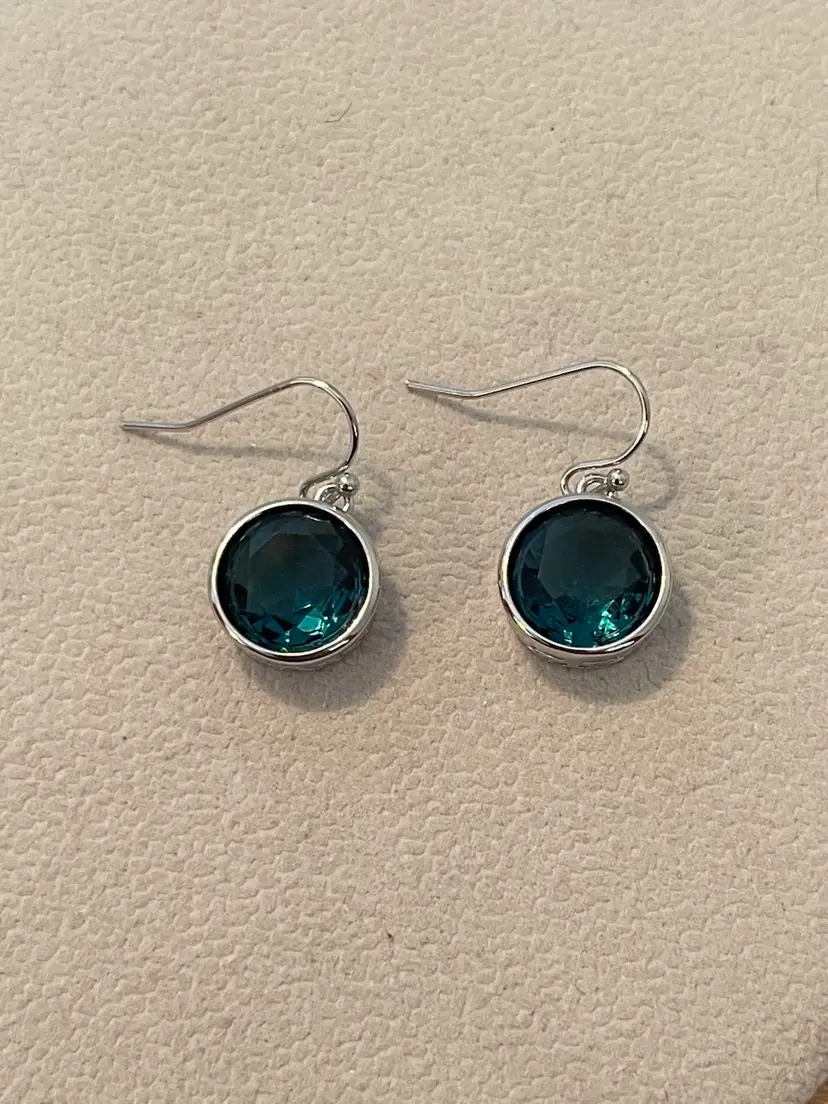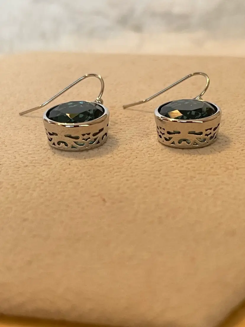 Beautifully crafted dangle earrings featuring deep blue faceted crystals set in polished silver-tone bezels. The sides are adorned with an elegant cut-out filigree design. Approximately 1/2” round.