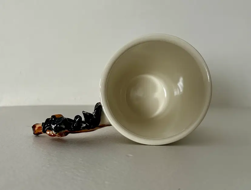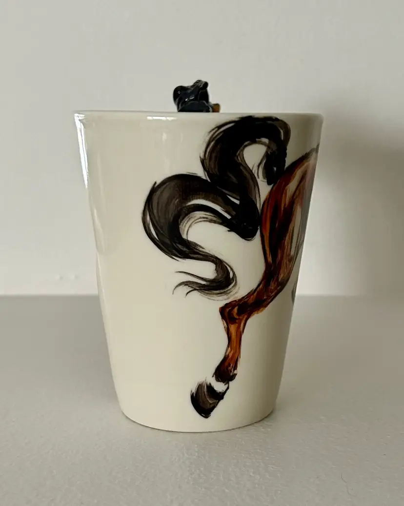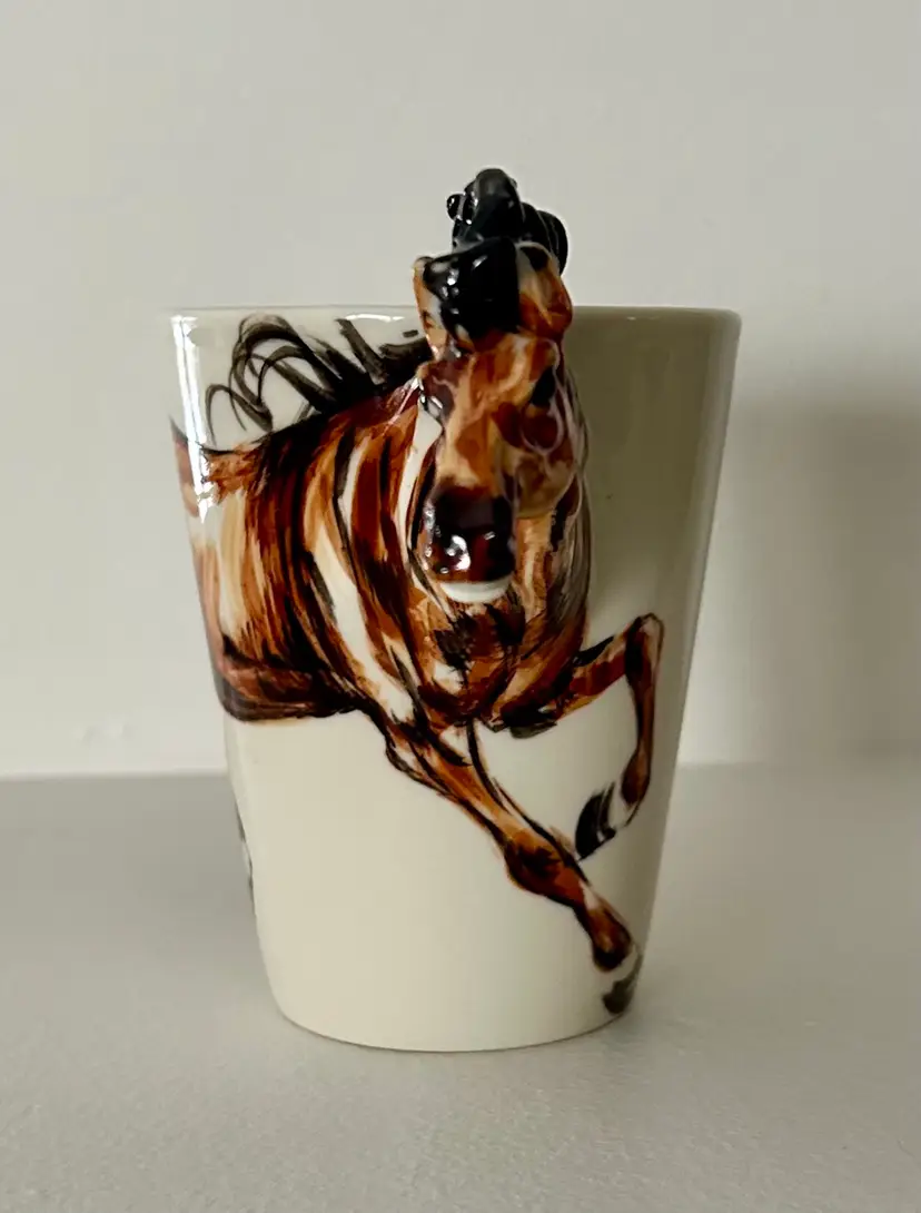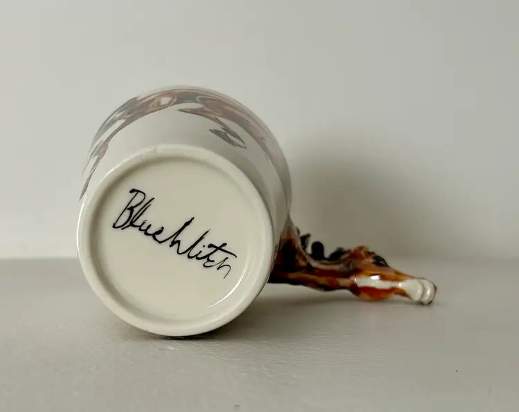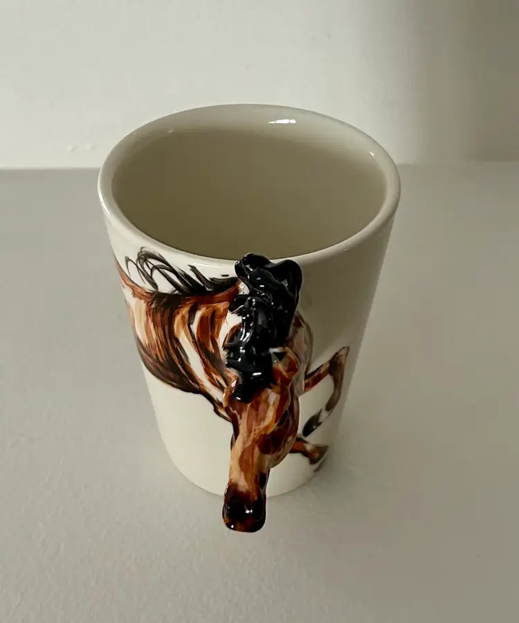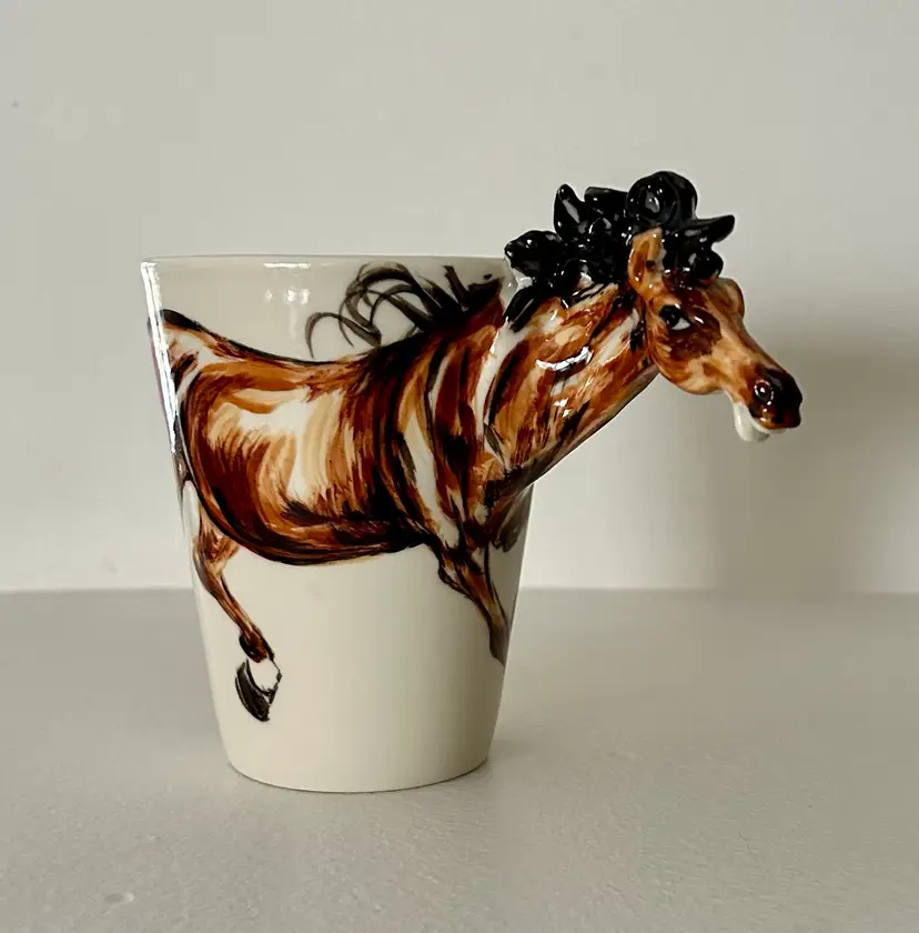 BlueWitch Mug with 3-D horse head as the handle. Beautifully painted and in excellent condition with no chips or cracks. Signed on bottom. Measures 4.25” tall; 6” wide.