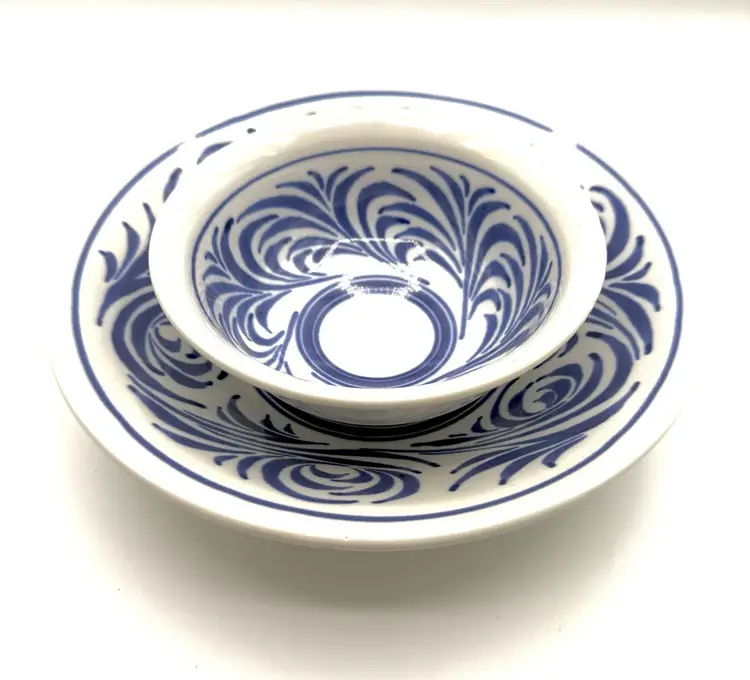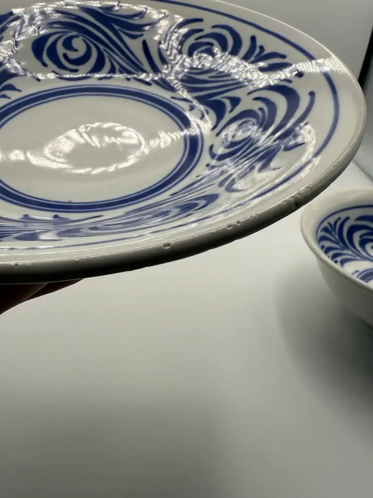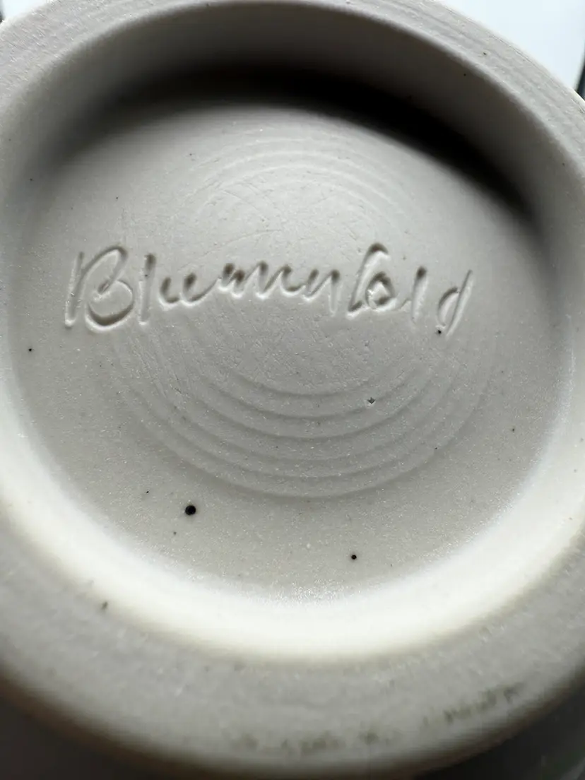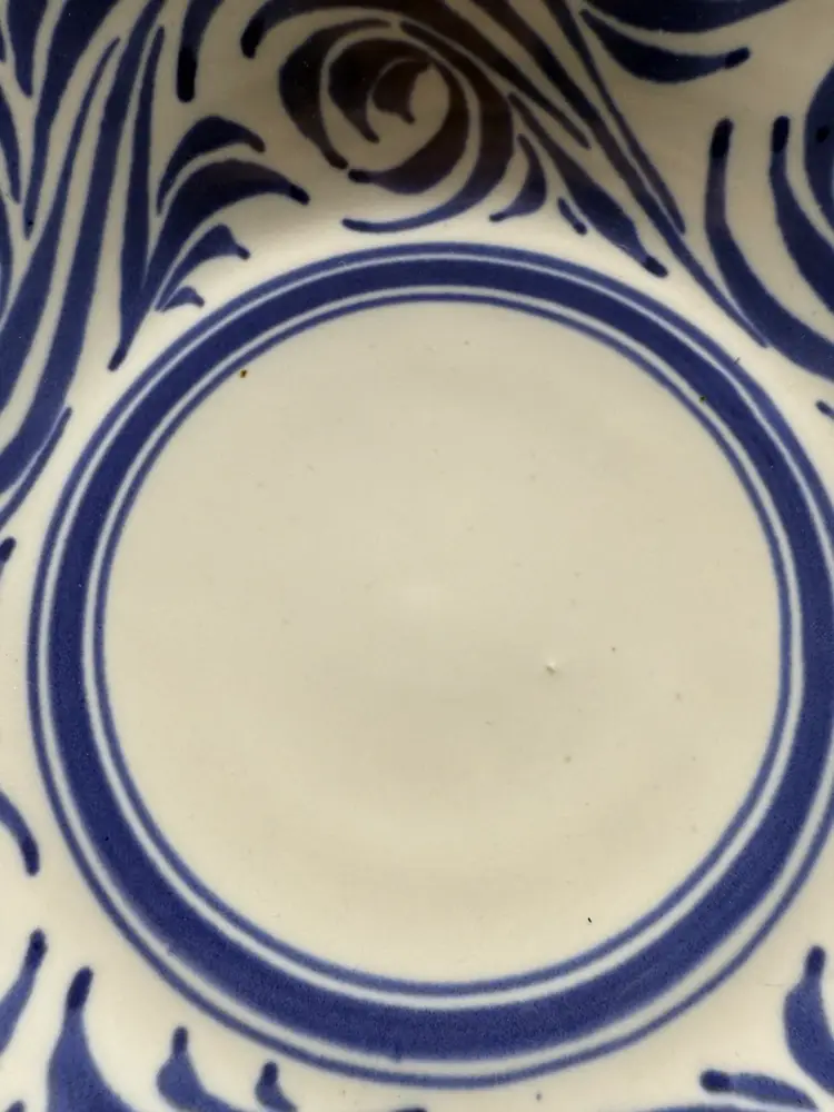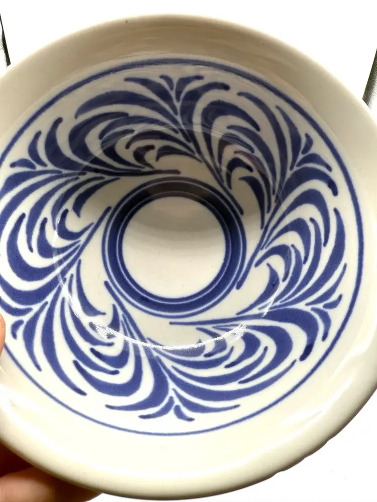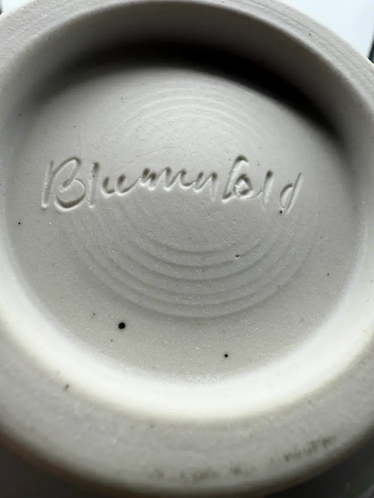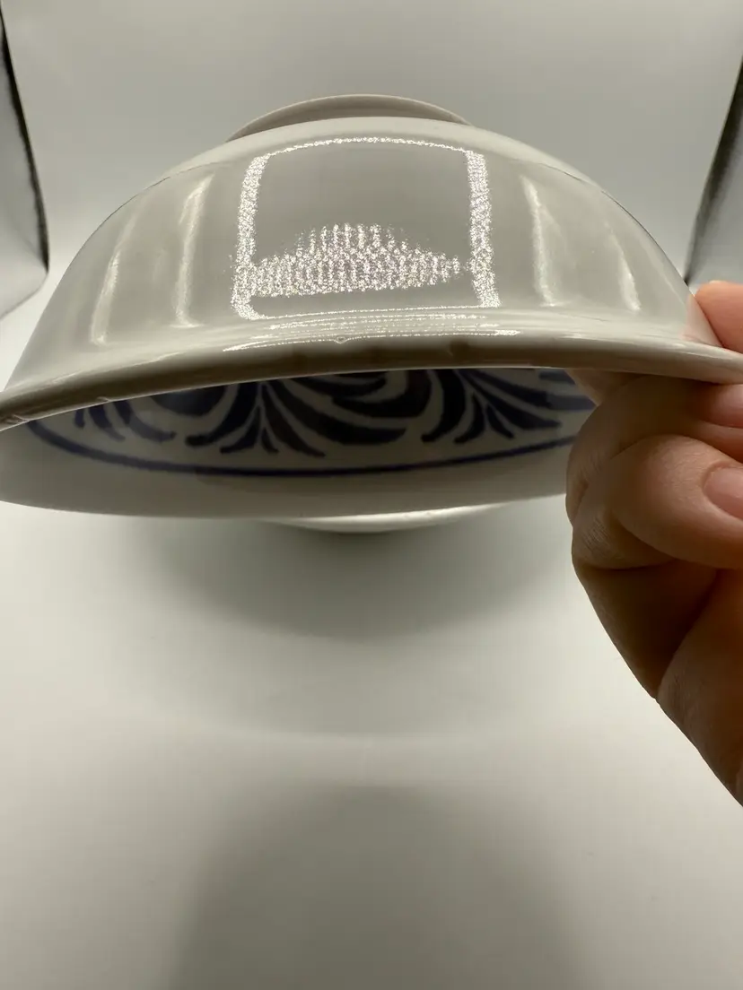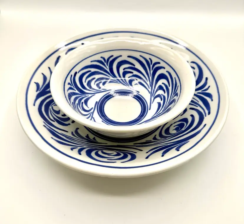Blumenfeld Signed Blue & White Art Pottery Serving Bowl Set of 2 . Large Bowl 11x2.25”, Small Bowl 6.75x2.75” (some missed glaze areas)