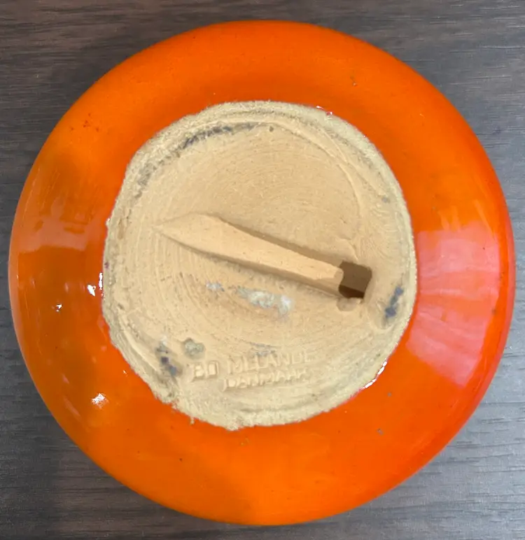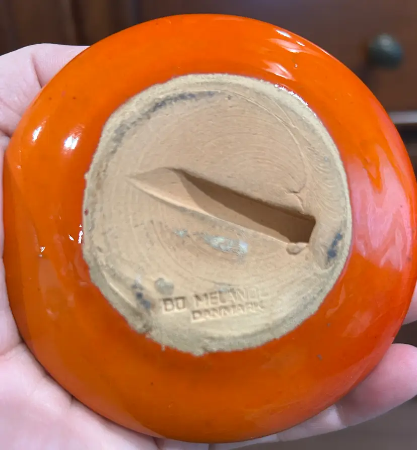 This is a Bo Melander ceramic paperweight, likely from the 1960s. It's characterized by its vibrant red orange glaze and hand-painted leaf design. Melander was a Danish ceramist known for his mid-century modern designs, which often feature clean lines and organic shapes. This paperweight measures 3 1/2 inches in diameter and 1 1/4 inches tall. No chips, no cracks.