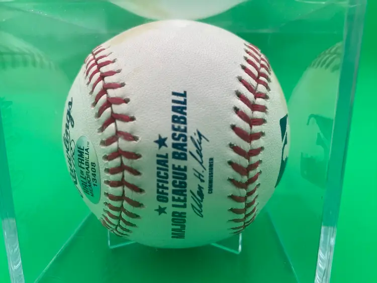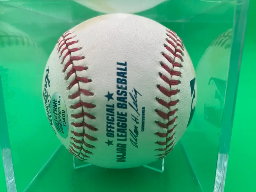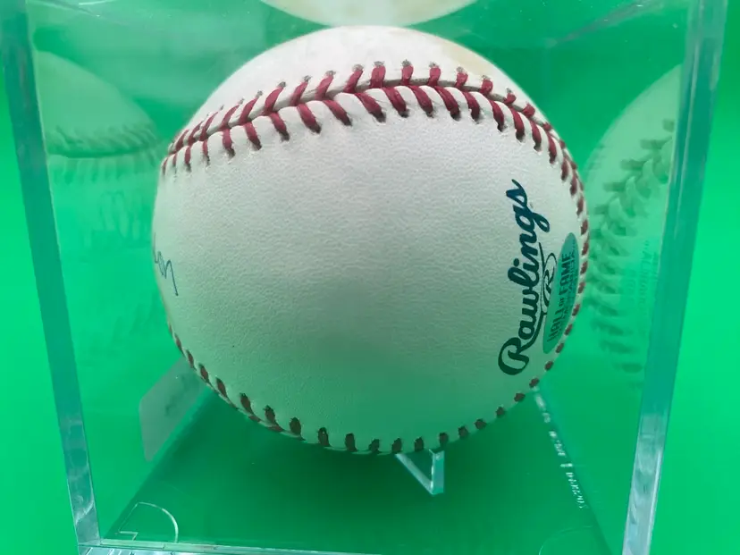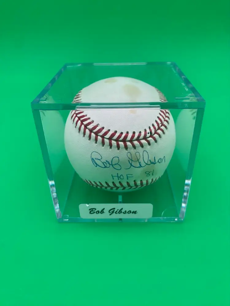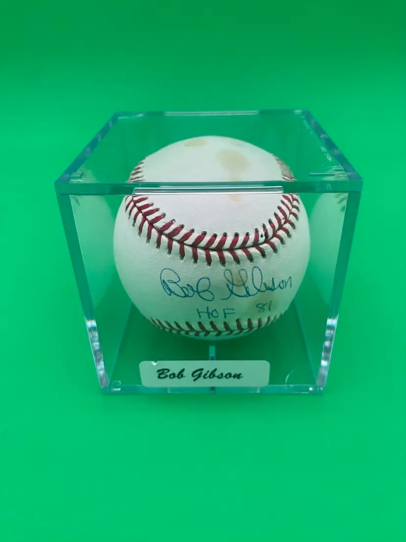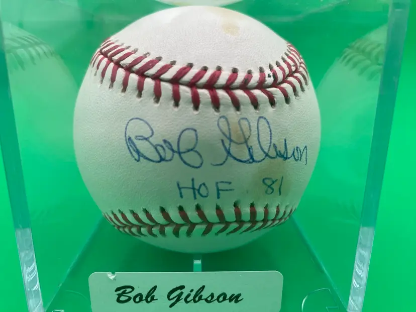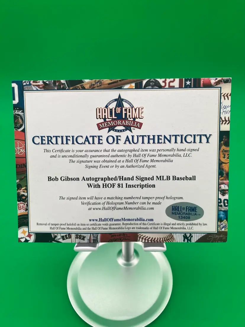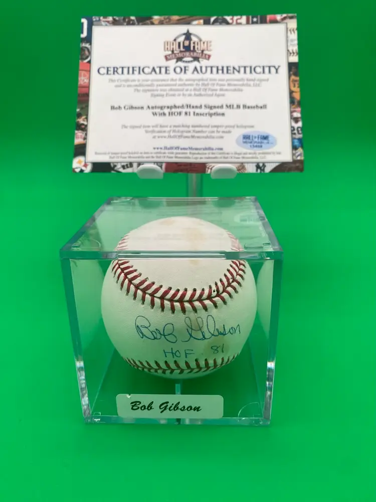 You are purchasing one Bob Gibson 'HOF 81' Signed Rawlings Official Major League Baseball. This Listing includes one Hard Plastic Display Case and one Certificate of Authenticity & Sticker by Hall of Fame Memorabilia. This Ball is in overall good condition. See images for a closer look at each angle and areas of discoloration. No cracks or chips in the Case. No rips on the Certificate.