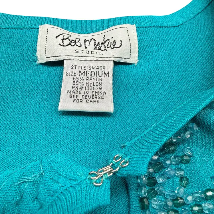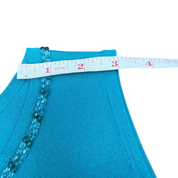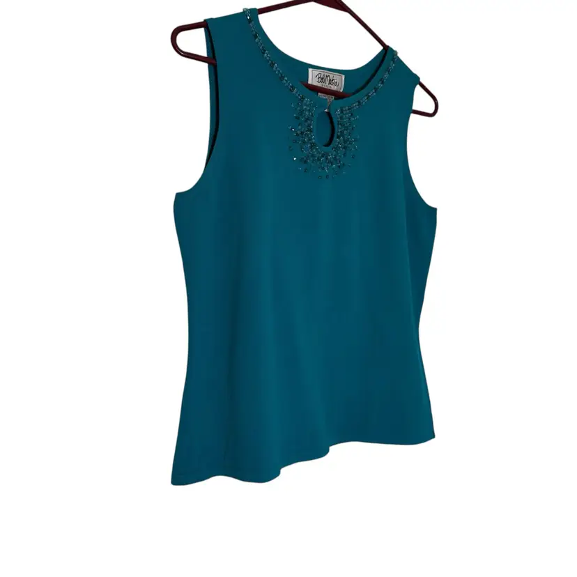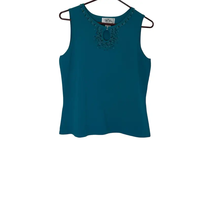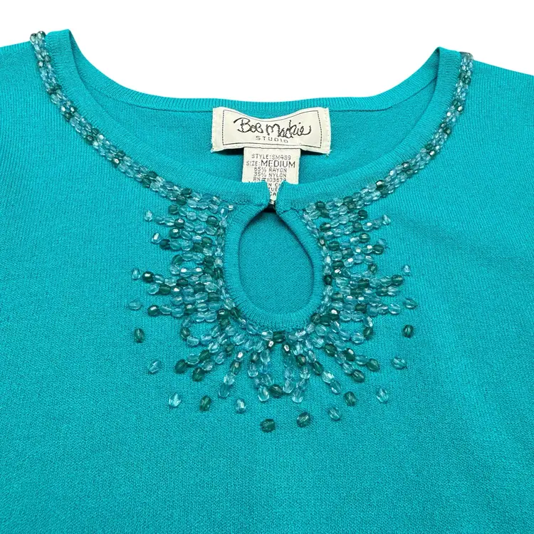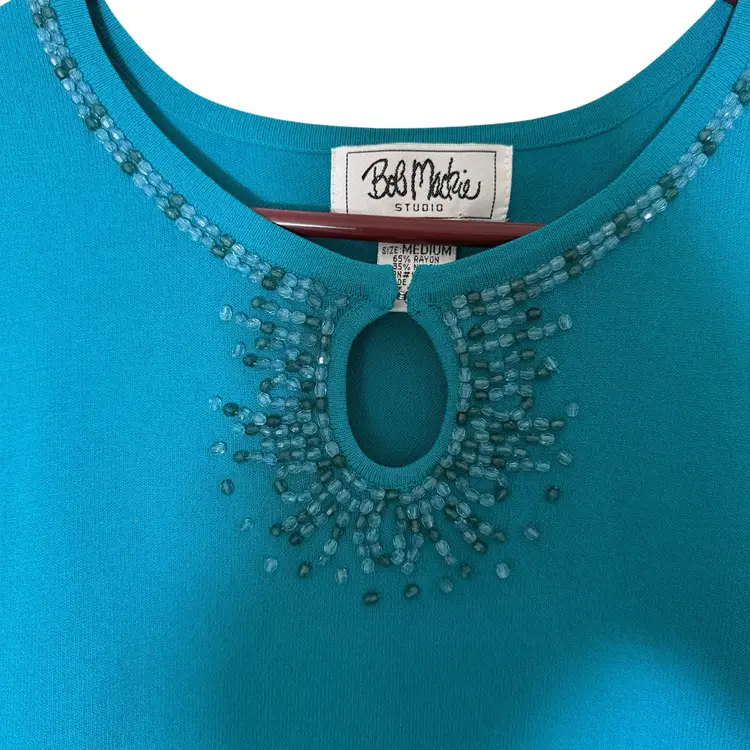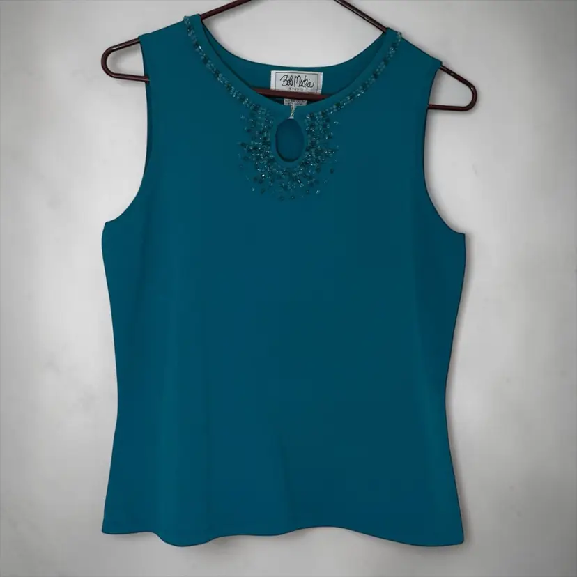 This Bob Mackie Studio beaded jeweled sleeveless women's top in teal is a vintage-inspired piece perfect for various occasions such as parties, casual outings, or business events. Made from a luxurious blend of nylon and rayon, this top features a solid pattern with beaded accents and a keyhole design at the neckline. The sleeveless design and round neckline make it a versatile and stylish addition to any wardrobe, adding a touch of artistry and elegance to your look.