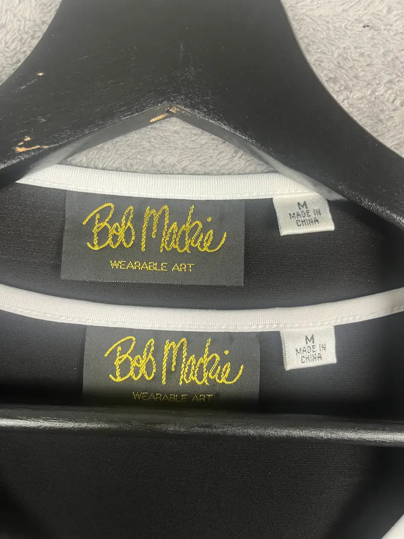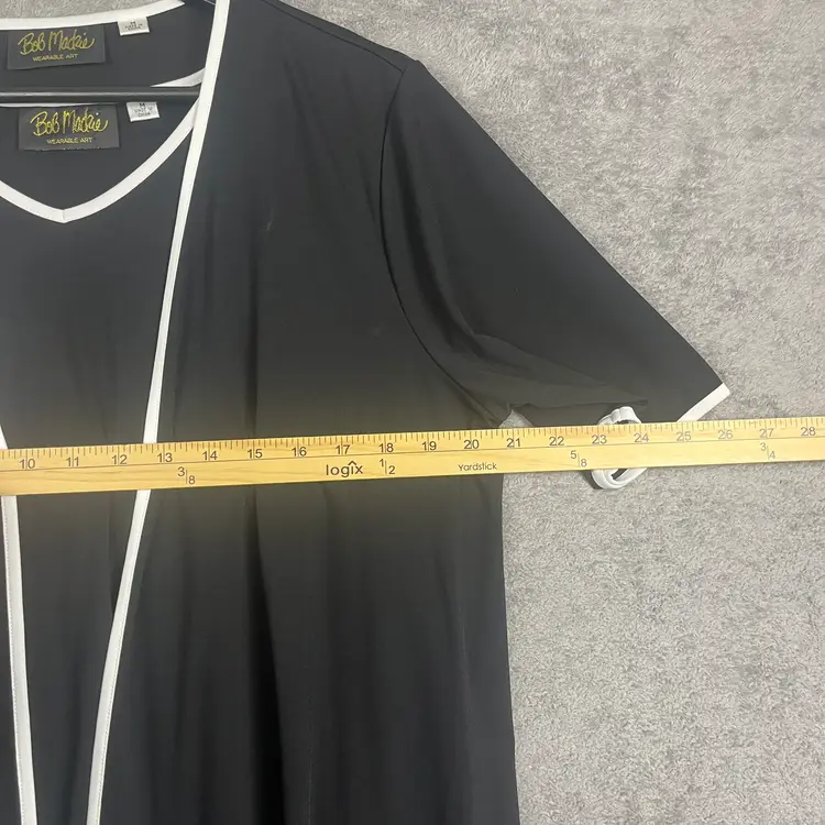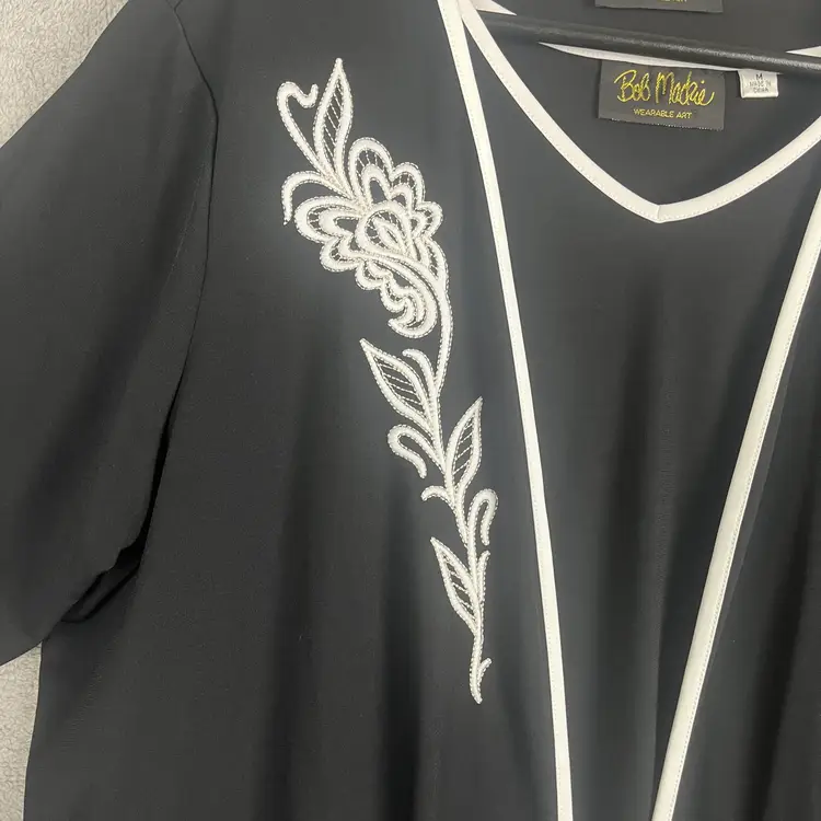 Elegant Bob Mackie Wearable Art two-piece set featuring a black open-front cardigan with white embroidered floral detailing and a matching sleeveless tank. Smooth, stretchy fabric offers comfort, drape, and easy movement while maintaining a polished, artistic look. Bob Mackie is famously known for dressing icons like Cher, Diana Ross, and Carol Burnett, bringing a touch of Hollywood glamour to wearable art pieces like this.