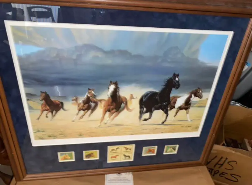 Bob Peters framed Lithographs horses matted with stamps Artist signed . “ Black Mesa” If you purchase more than one shipping can be less