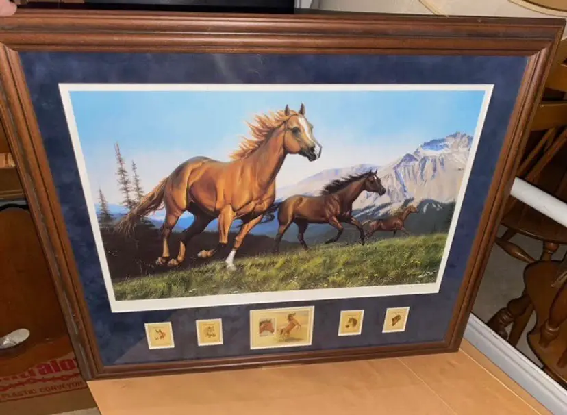 Bob Peters framed Lithographs horses matted with stamps Artist signed .