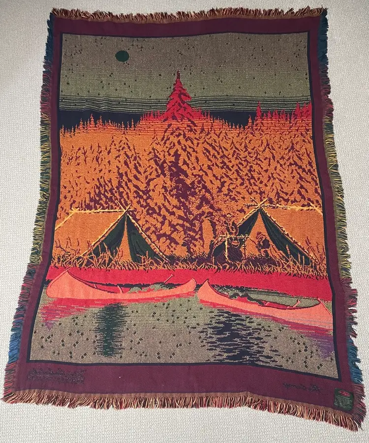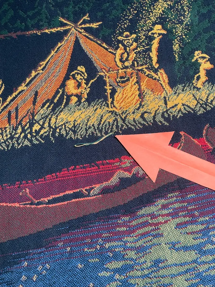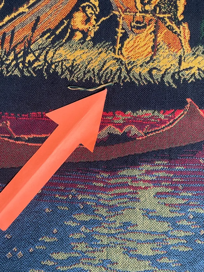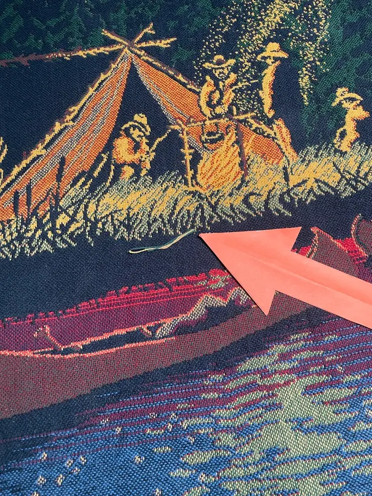 The orange arrow points to the snag in the throw blanket.