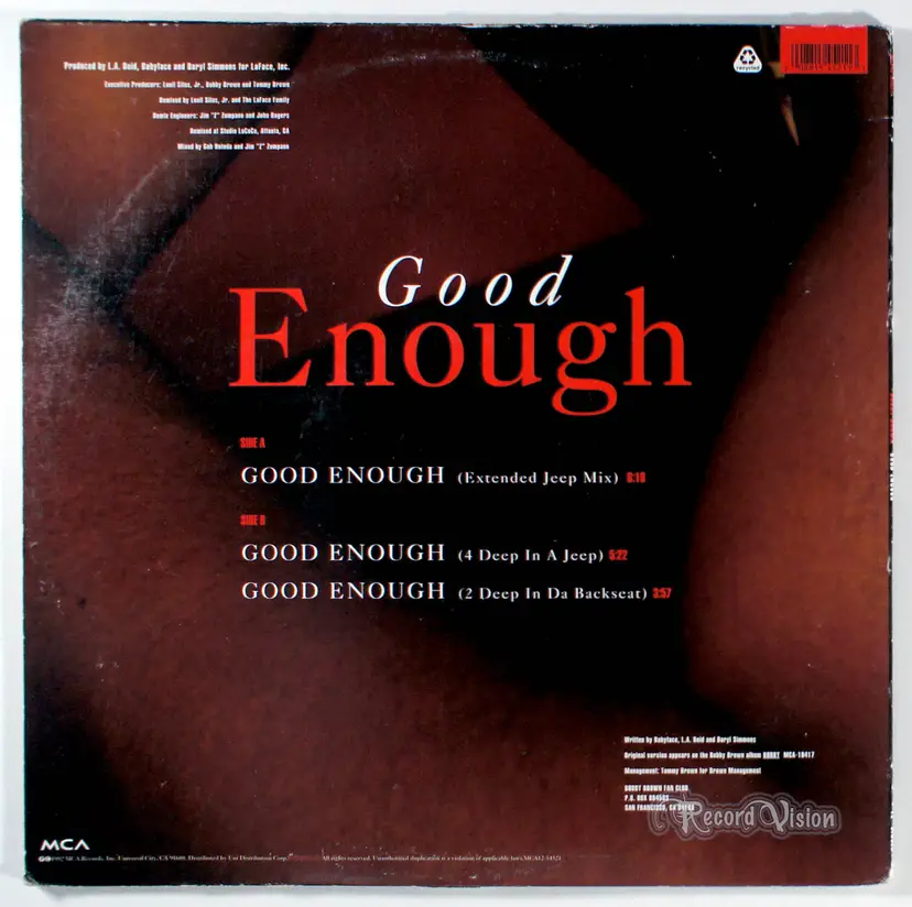 Good Enough, by Bobby Brown, is the 12-inch vinyl single from his album Bobby, along with several extended remixes tailored for club play. A standout and unique feature is the inclusion of uncredited background vocals performed by Whitney Houston, Brown's then-wife, adding a personal touch to this sensual R&B ballad produced by L.A. Reid, Babyface, and Daryl Simmons. The single highlights various Jeep-themed and extended mixes, such as the Extended Jeep Mix and 4 Deep In A Jeep, which emphasize its dance-oriented appeal in the new jack swing era. Good Enough remains a fan-favorite for its intimate lyrics and smooth production. As a hit single, it peaked at No. 7 on the US Billboard Hot 100, marking Brown's final top-10 entry on that chart, while the parent album Bobby reached No. 2 on the Billboard 200.