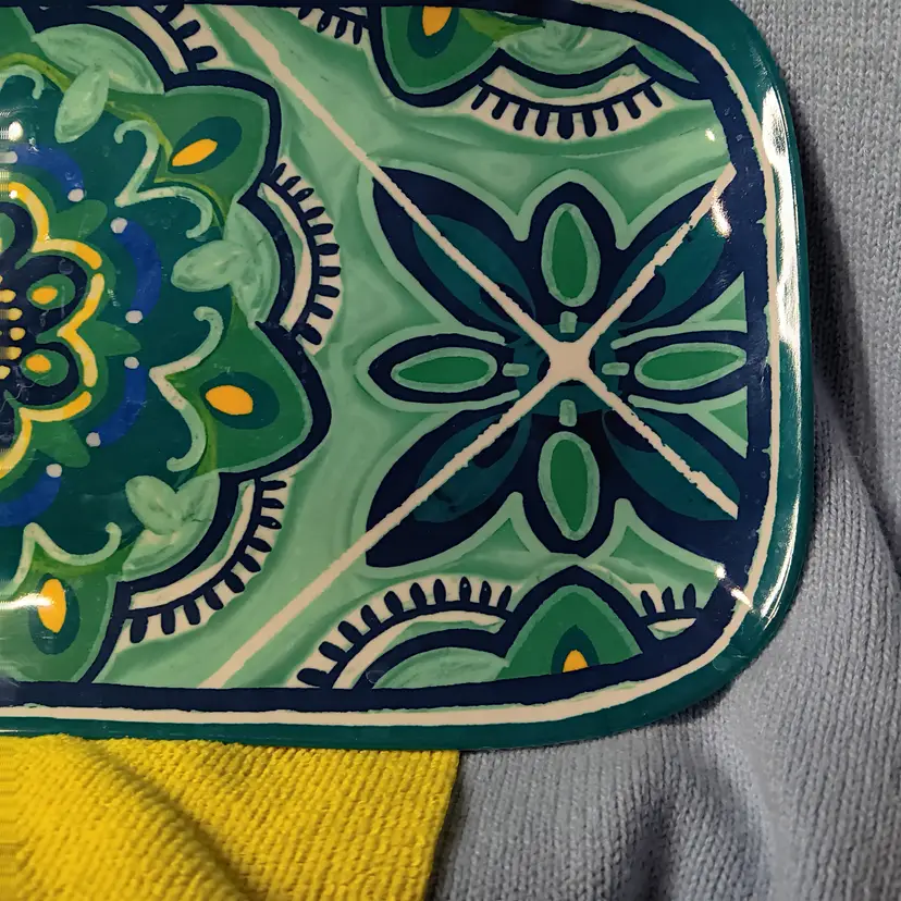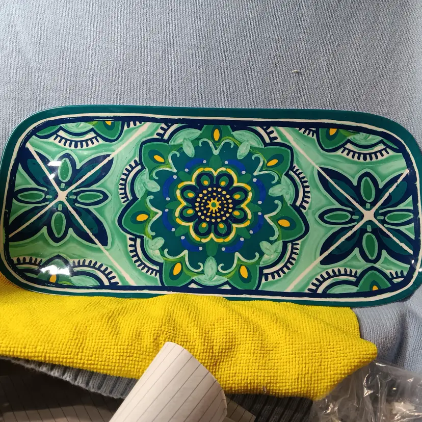 Rectangle 14.5 inches x 6.5 inches. Pretty colors blue green yellow medallion pattern.