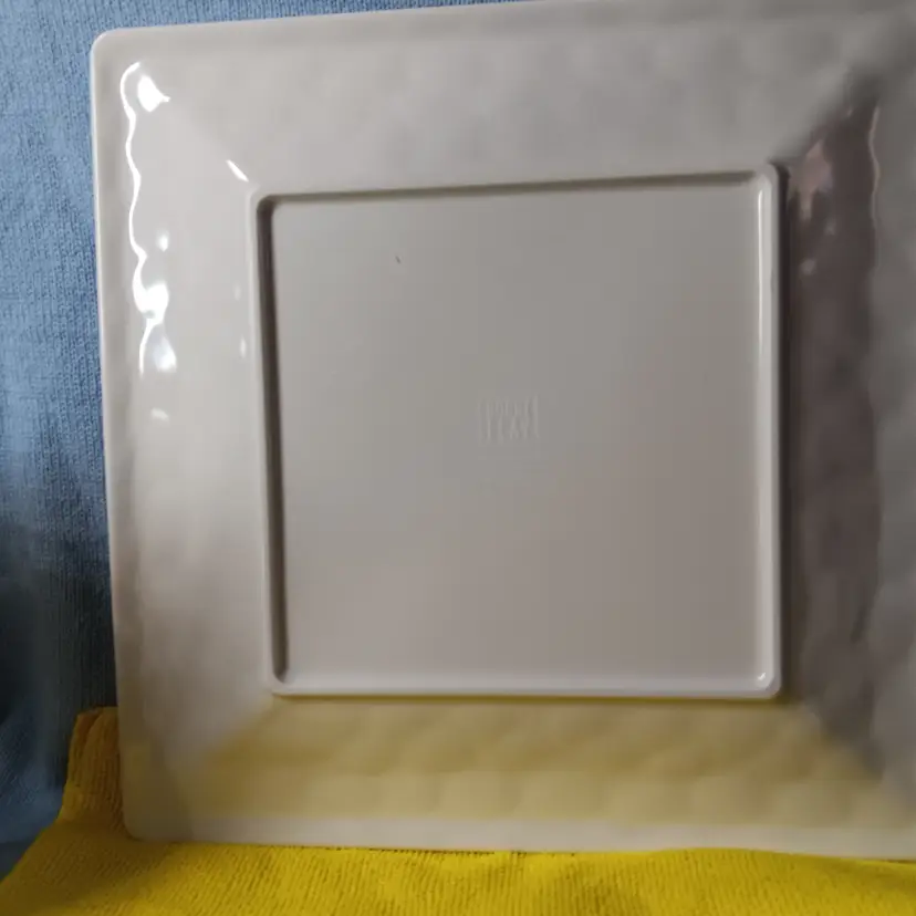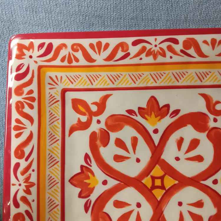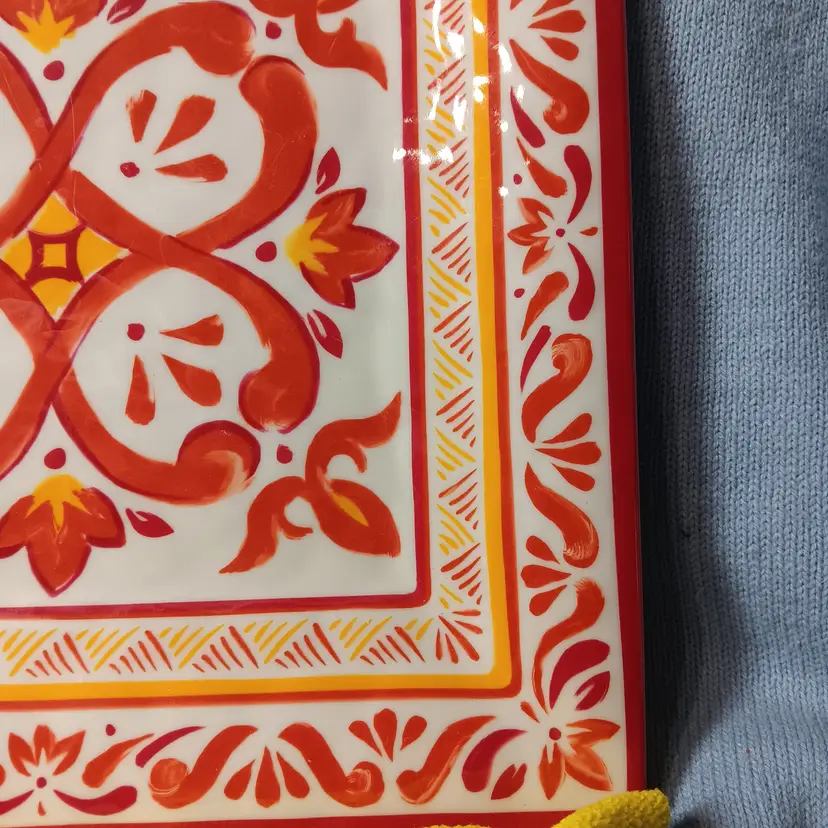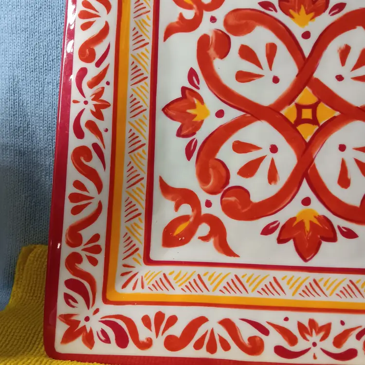 Bobby Flay Melamine serving tray. 10.5 in. Square. Red yellow white Italian Style pattern.
