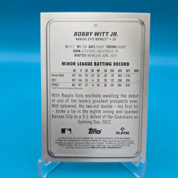 Bobby Witt Jr. 2022 Bowman Platinum Rookie Card. NM or better condition. Ships PWE.