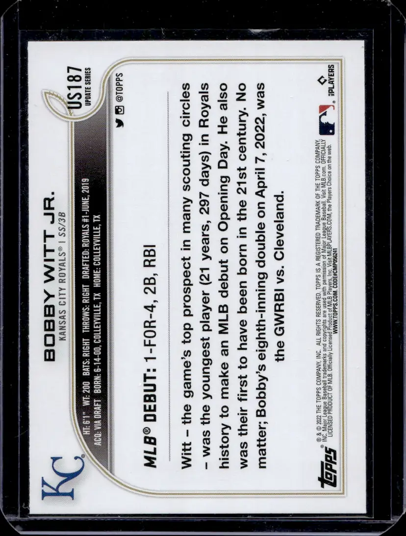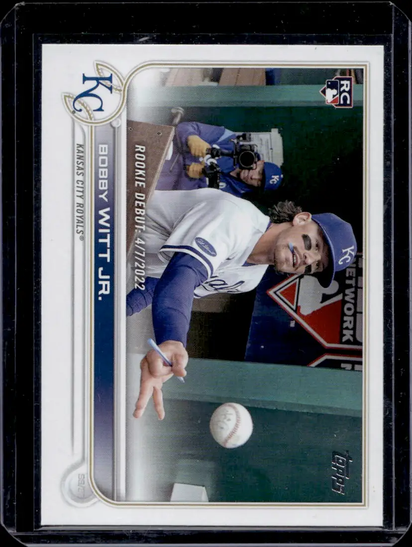 Get your hands on this Bobby Witt Jr. Rookie Debut card, capturing his first game on 4/7/2022. A perfect addition for Kansas City Royals fans and baseball card enthusiasts.