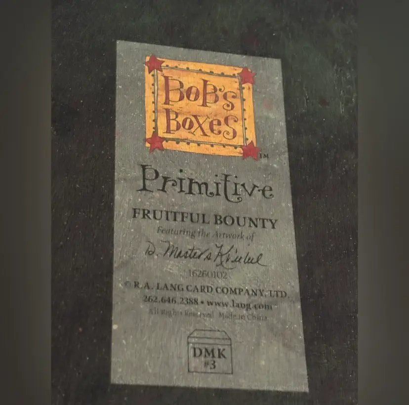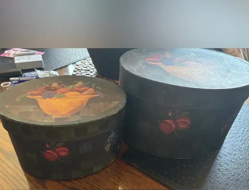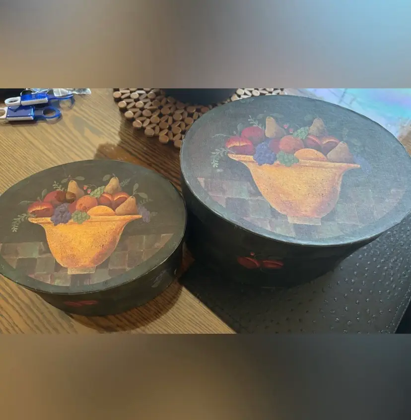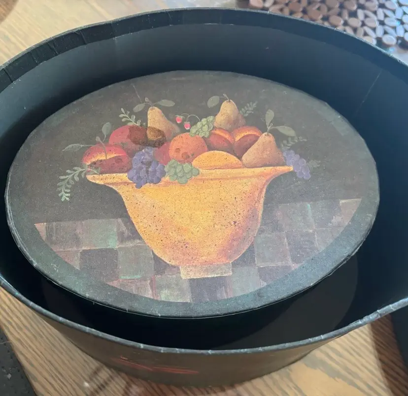 These boxes feature the artwork of D. Masters Kriebel. These are from the Primitive line and the pattern is called “Fruitful Bounty” featuring a bowl of fruit on the lid and fruits and flowers around the sides.